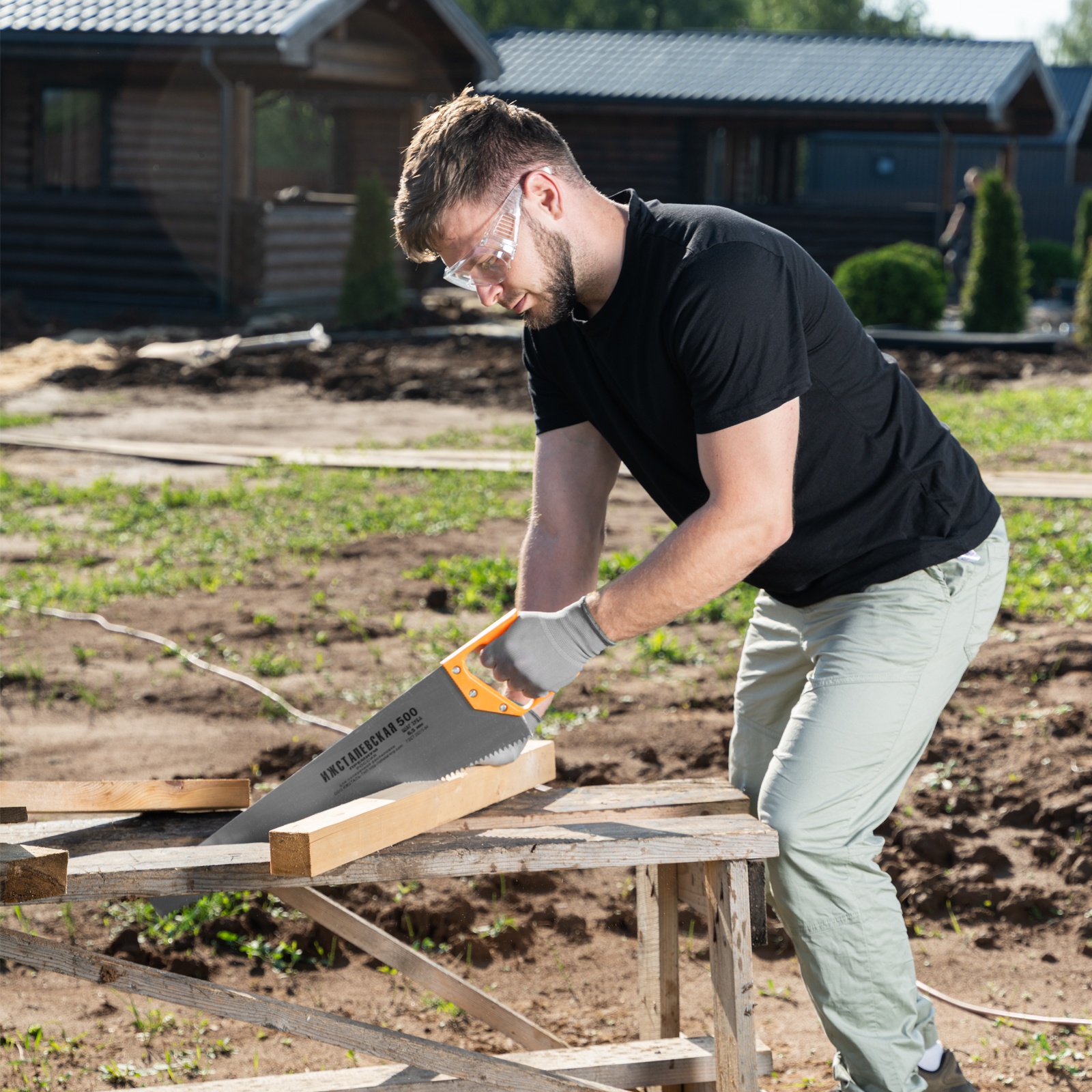 Ножовка по дереву 23165 с длиной полотна 500 мм и пластиковой рукояткой — режущий инструмент, шаг зубьев которого составляет 6,5 мм. Применяется для продольно-поперечного пиления древесины. Пилит в направлении от себя и на себя. Крупные зубья обеспечивают быстрый рез. Если режущая кромка затупится, ее можно заточить. Пила будет полезна столярам и плотникам, пригодится также дома или на даче.