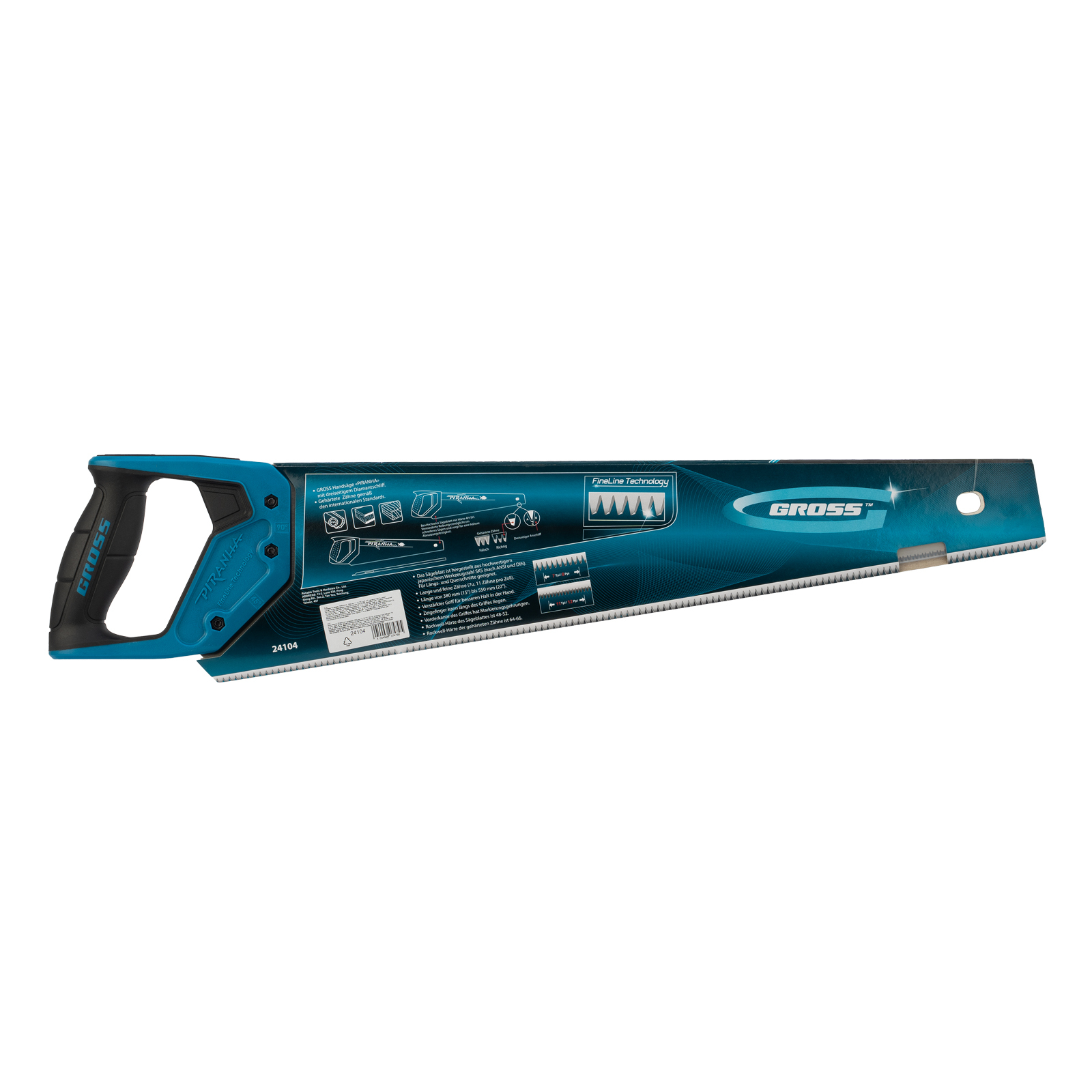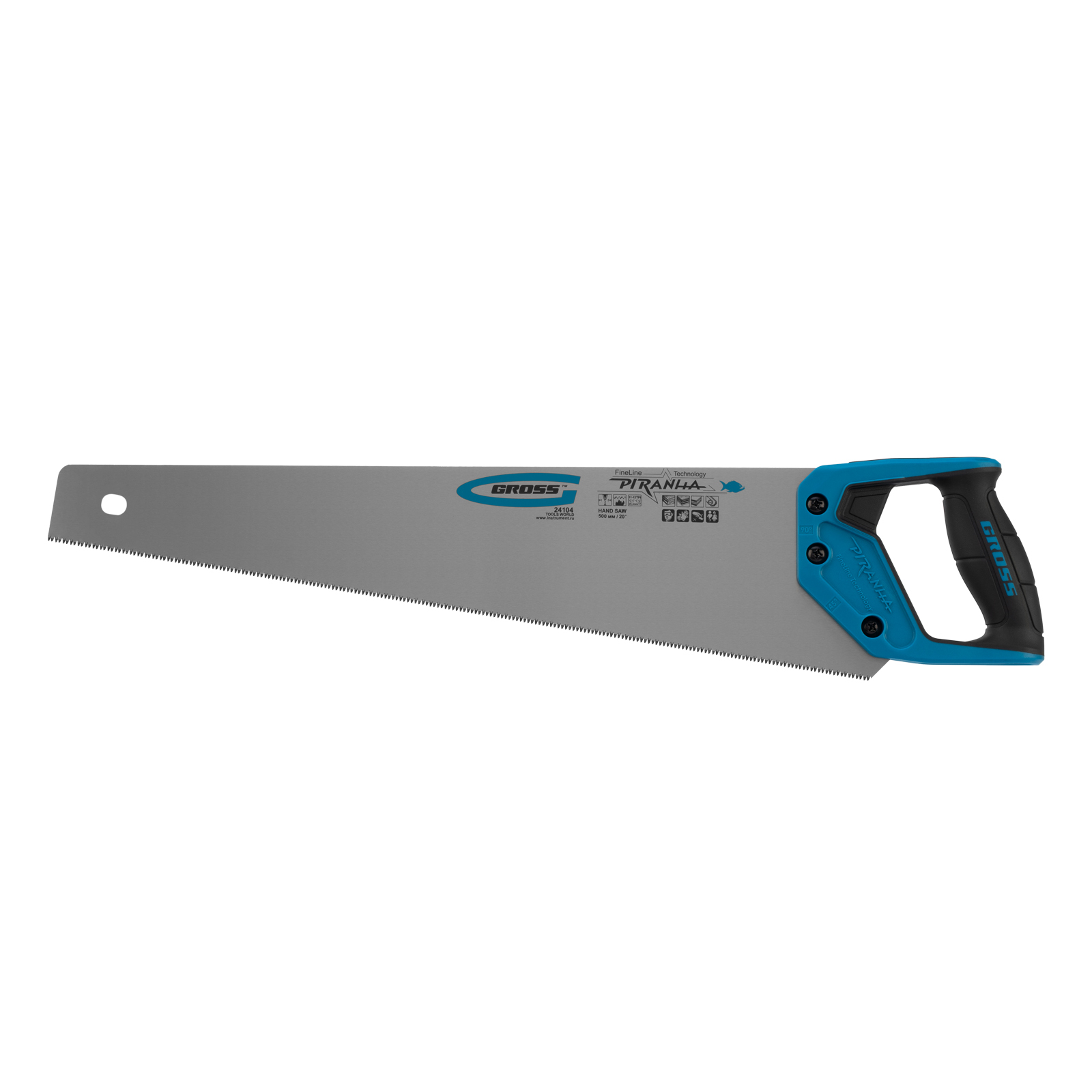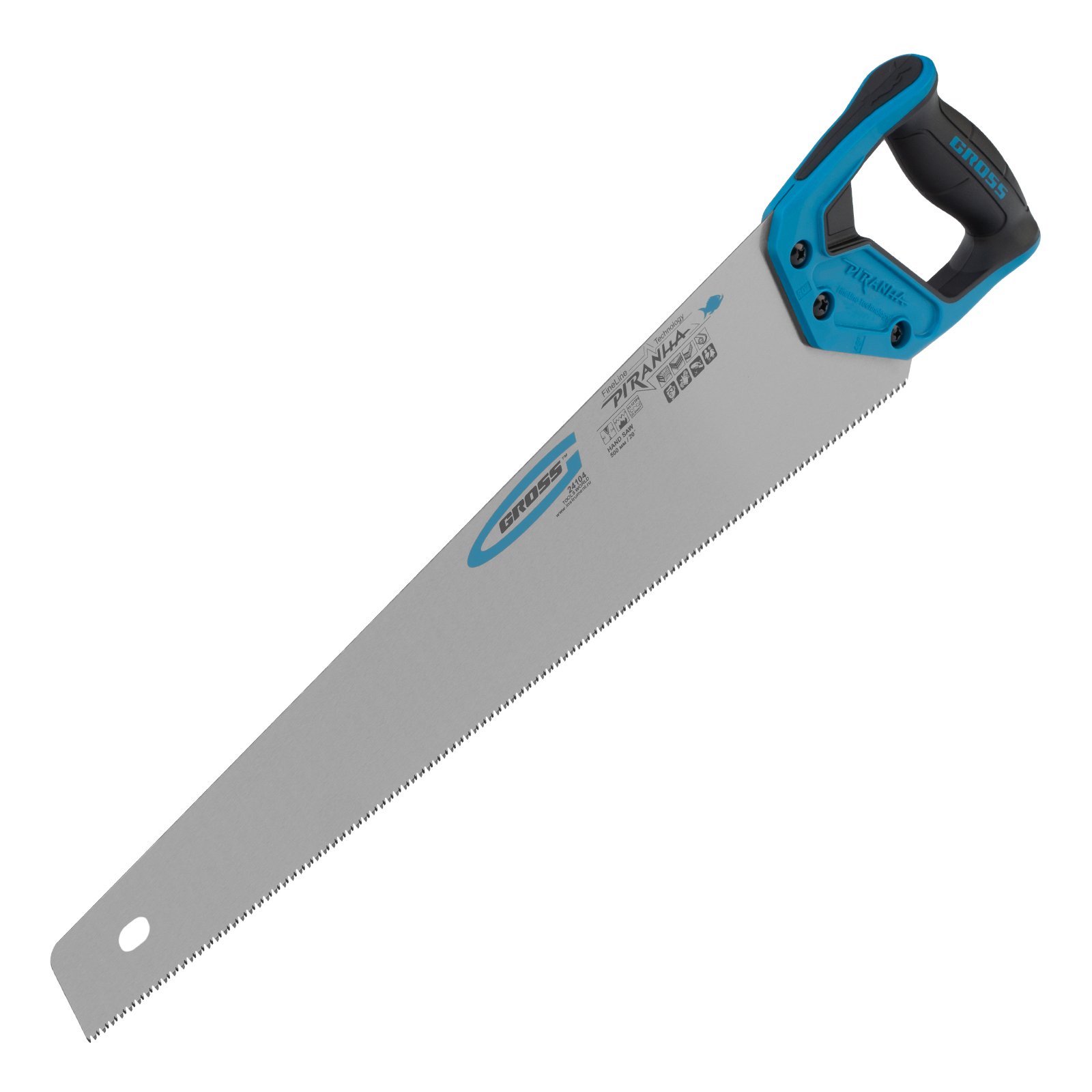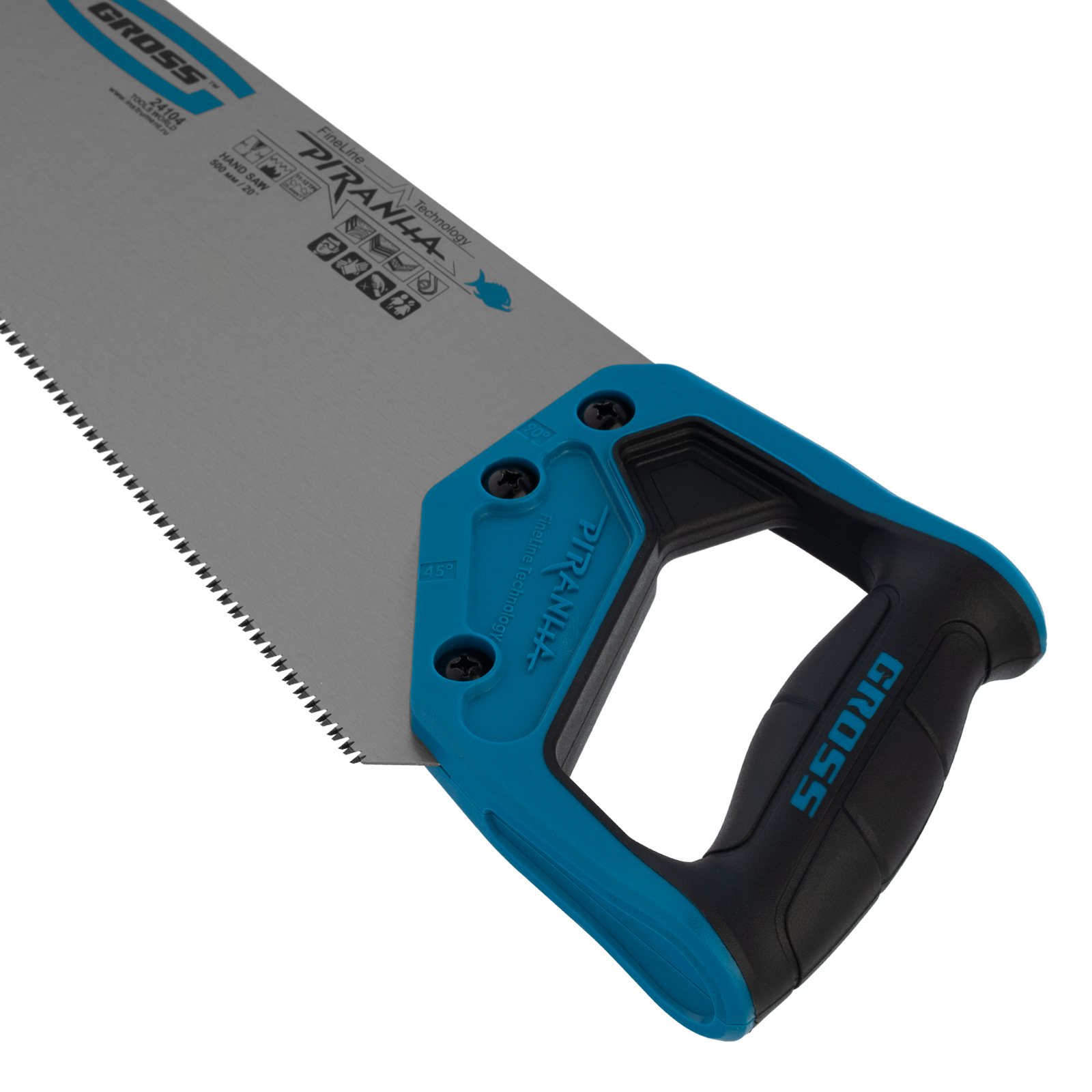 Ножовка по дереву Gross PIRANHA 24104 с полотном длиной 500 мм, калеными зубьями с 3D-заточкой и шагом 11-12 TPI, с 2-компонентной рукояткой, предназначена для распиловки заготовок из древесины, ДСП, ДВП, МДФ и ламината, а также из пластических материалов, таких как пенополистирол и полиуретан. Может производить продольный и поперечный распил. Мелкие зубья с шагом 11-12 TPI позволяют выполнять точный и чистый рез. Ножовка обладает высокой производительностью благодаря трехгранной заточке зубьев. Инструмент используется в столярном деле.