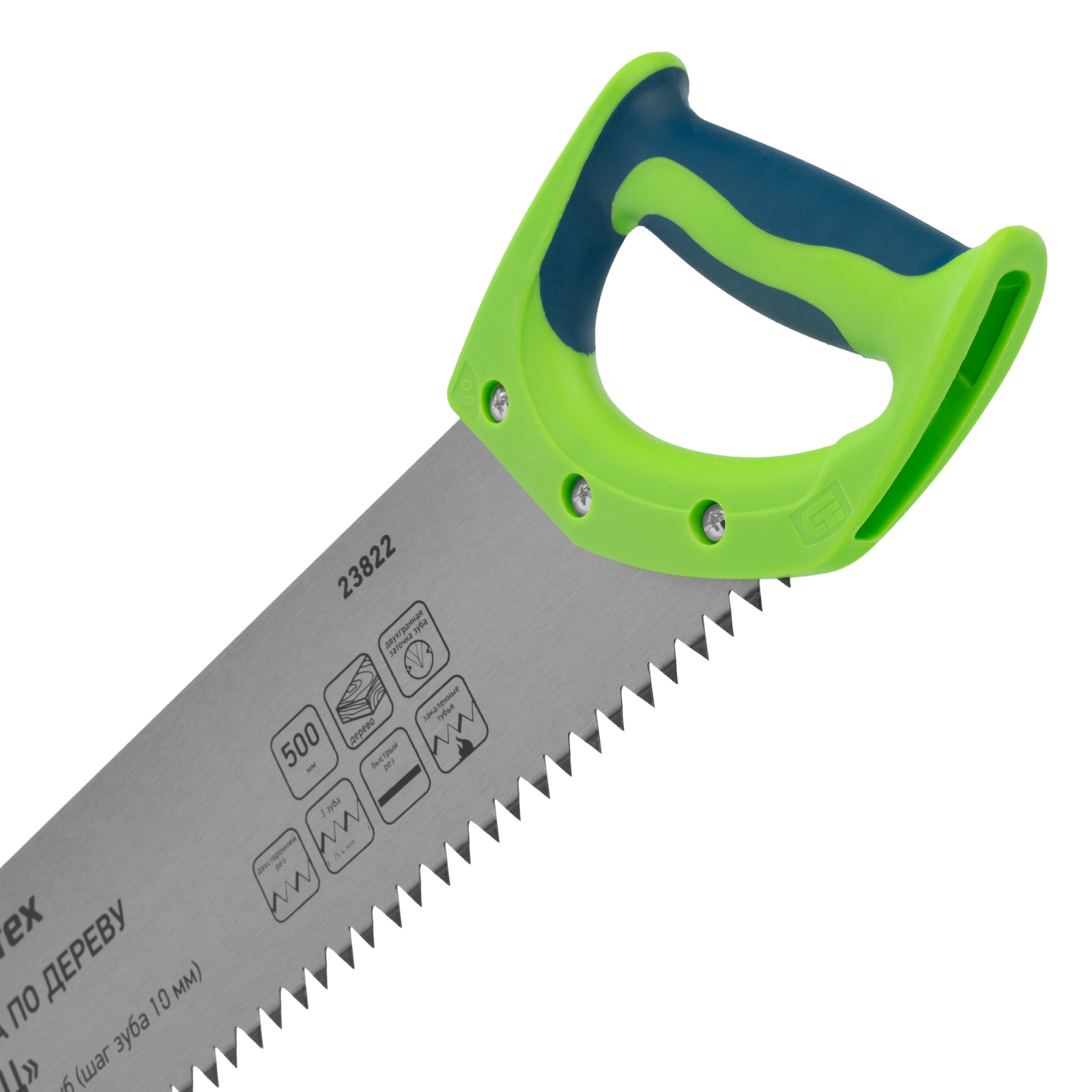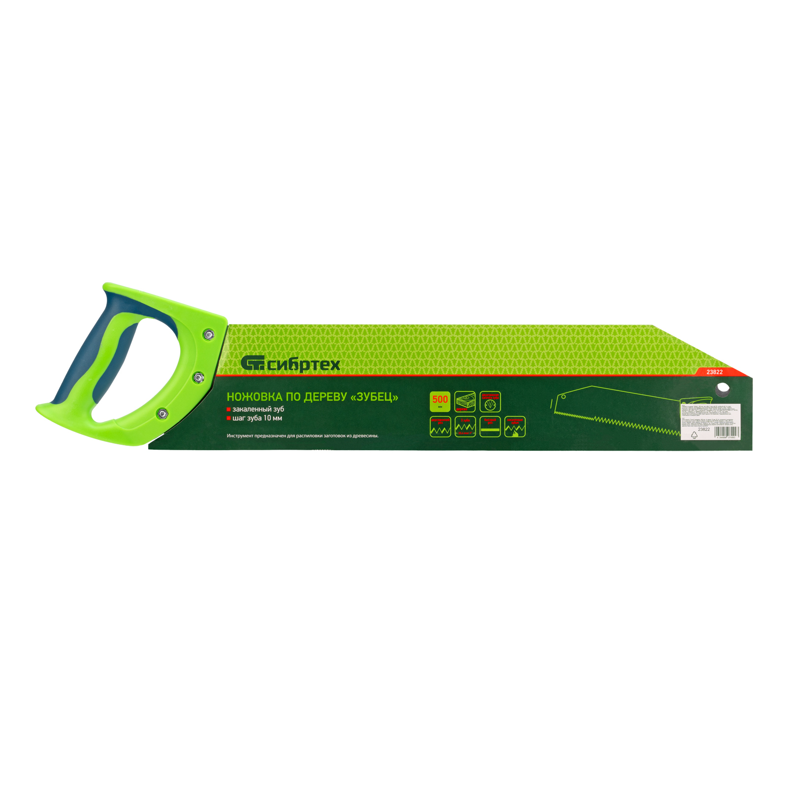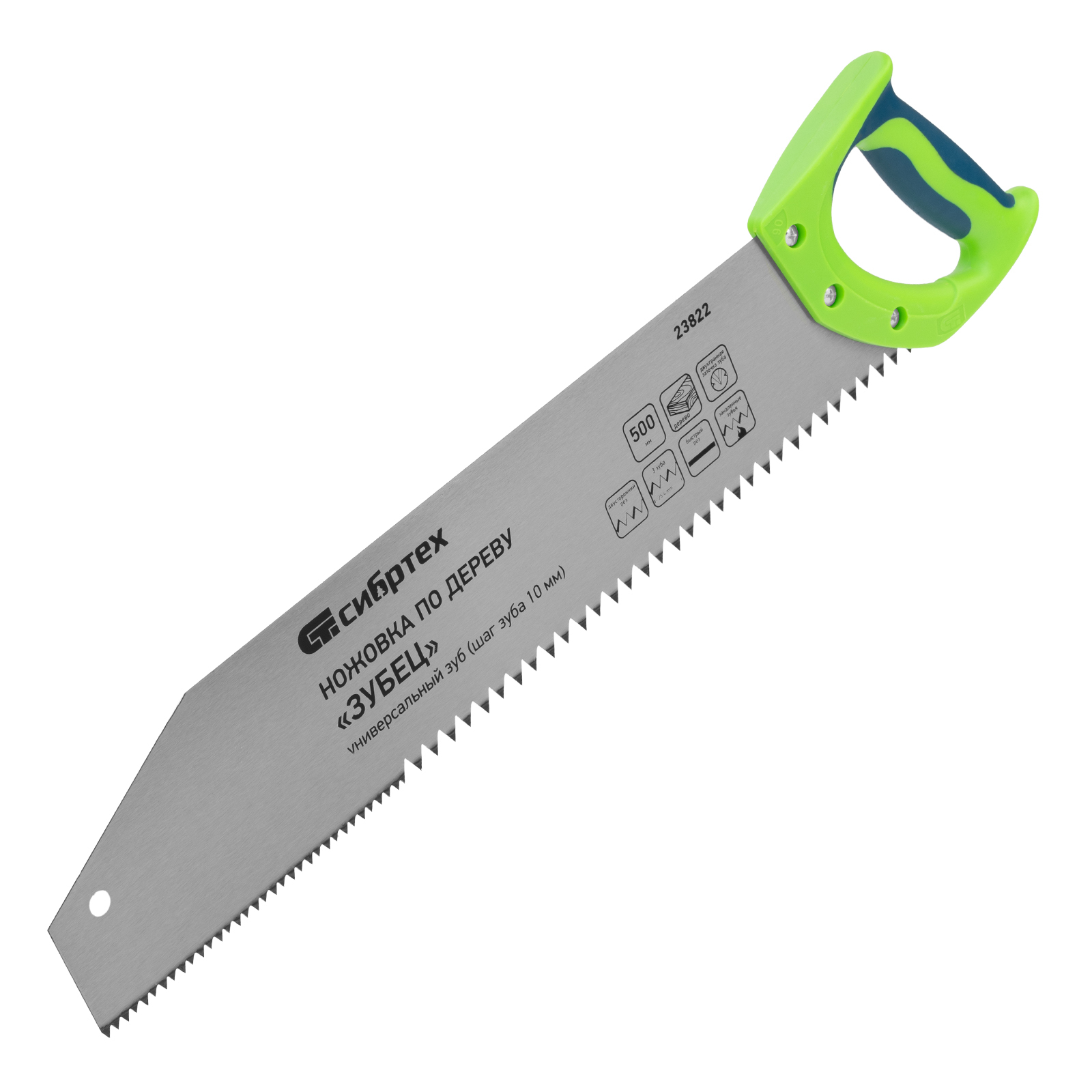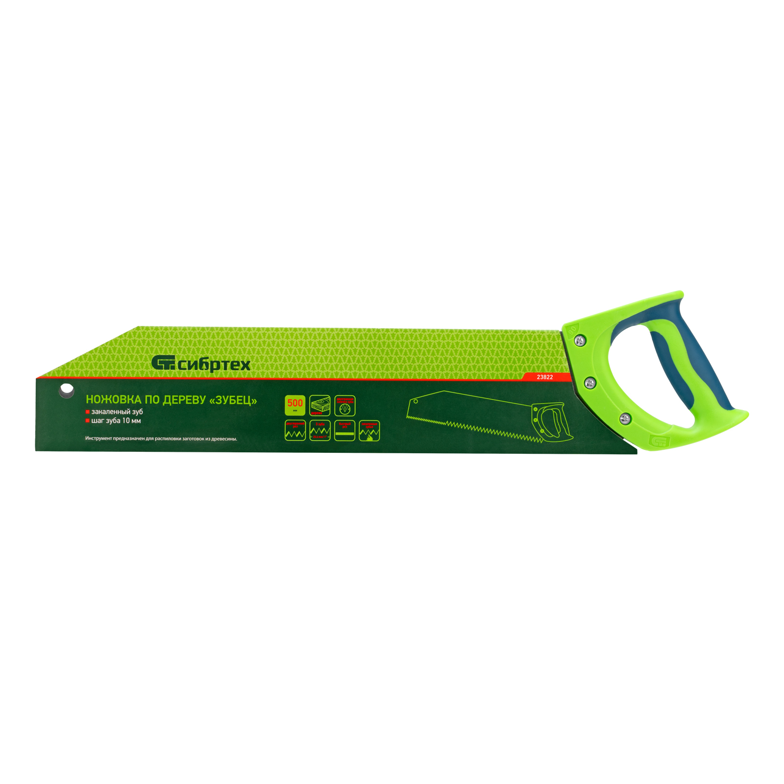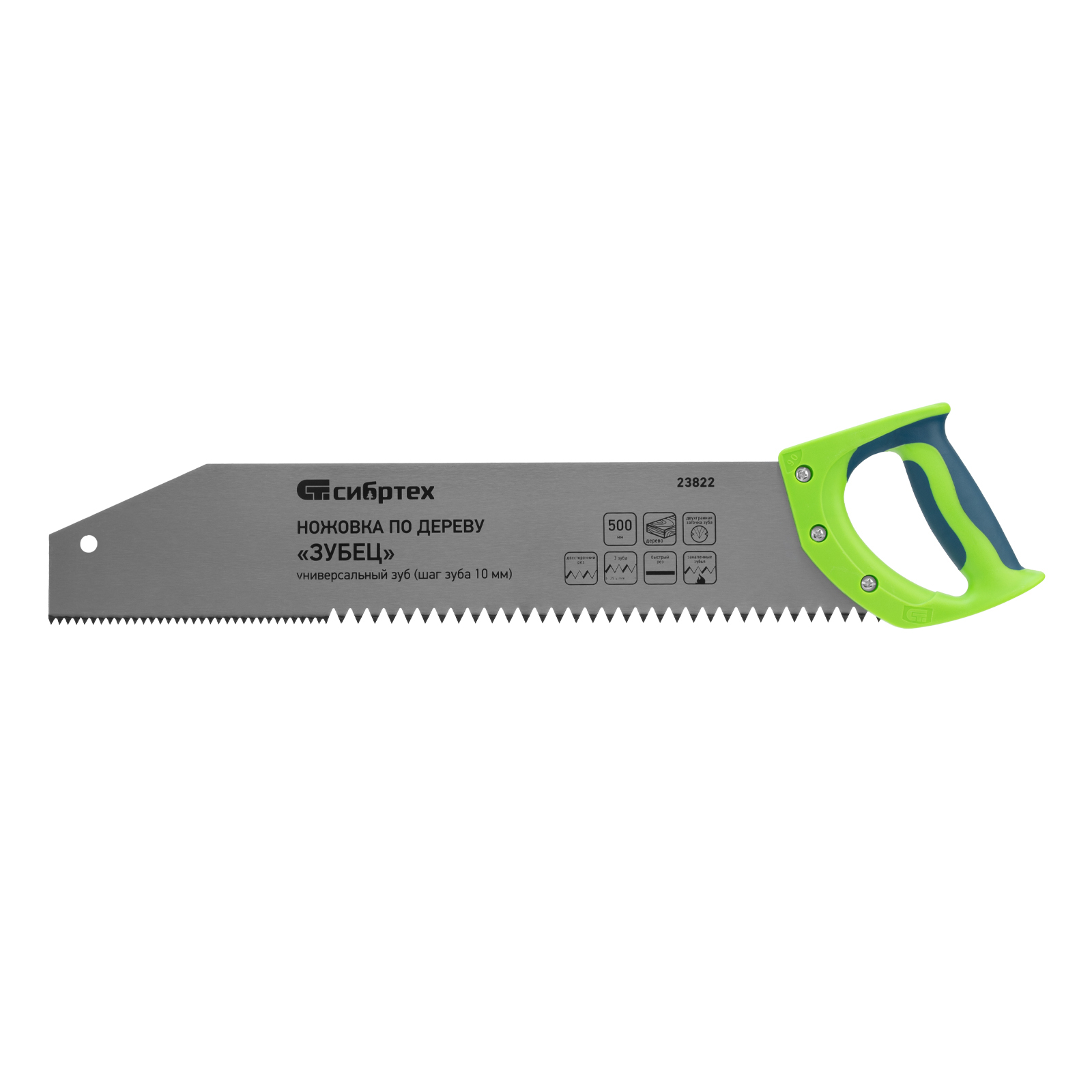 <p>Ножовка по дереву Сибртех «Зубец» 23822 с полотном длиной 500 м, с калеными зубьями с шагом 10 мм и 2D-заточкой, с двухкомпонентной рукояткой, используется для продольного и поперечного пиления древесины и ДСП. Рабочая кромка с шагом зубьев 10 мм обеспечивает быстрый двусторонний рез. Возможна заточка режущей части при необходимости. Ножовка применяется для выполнения плотницких работ, пригодится также и в быту.</p><h2>Преимущества</h2><ul><li>Деформационная стойкость — полотно изготовлено из легированной стали 65Mn.</li><li>Высокий ресурс — зубья прошли закалку до необходимой твердости.</li><li>Антикоррозийная защита — поверхность полотна покрыта лаком.</li><li>Надежная конструкция — рукоятка из ударопрочного ABS-пластика прикреплена к полотну 3 винтами.</li><li>Комфортная работа — двухкомпонентная рукоятка удобно ложится в руку.</li></ul>