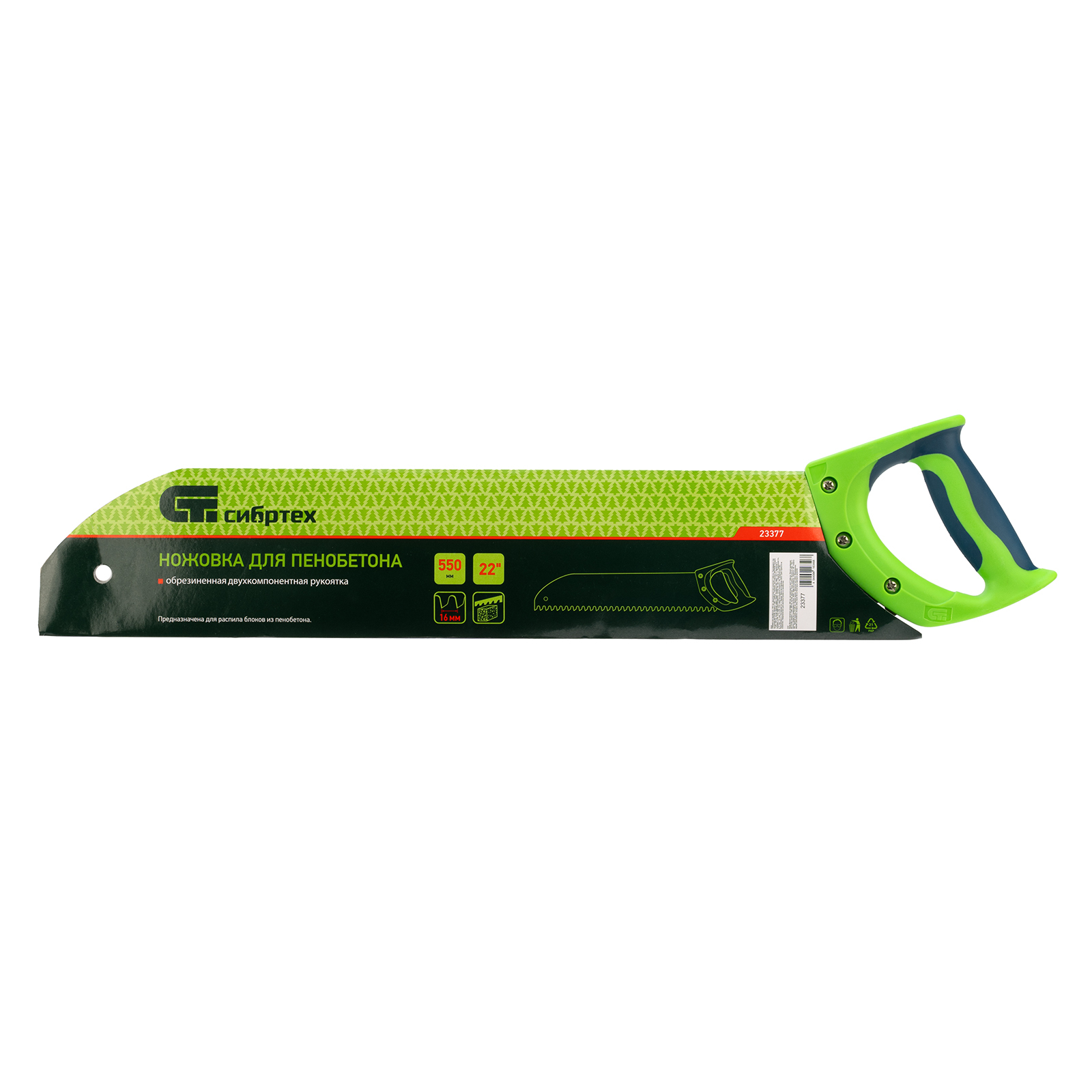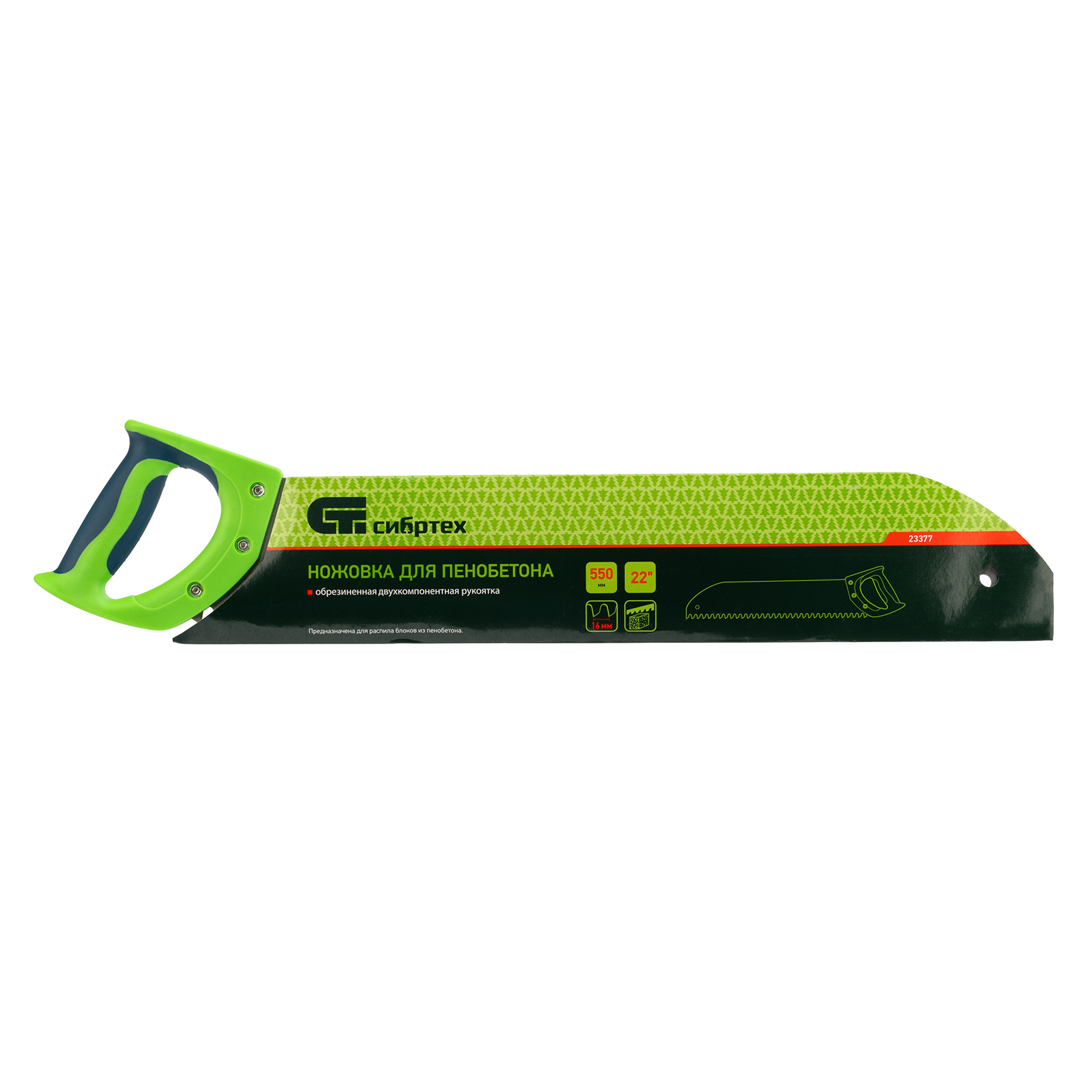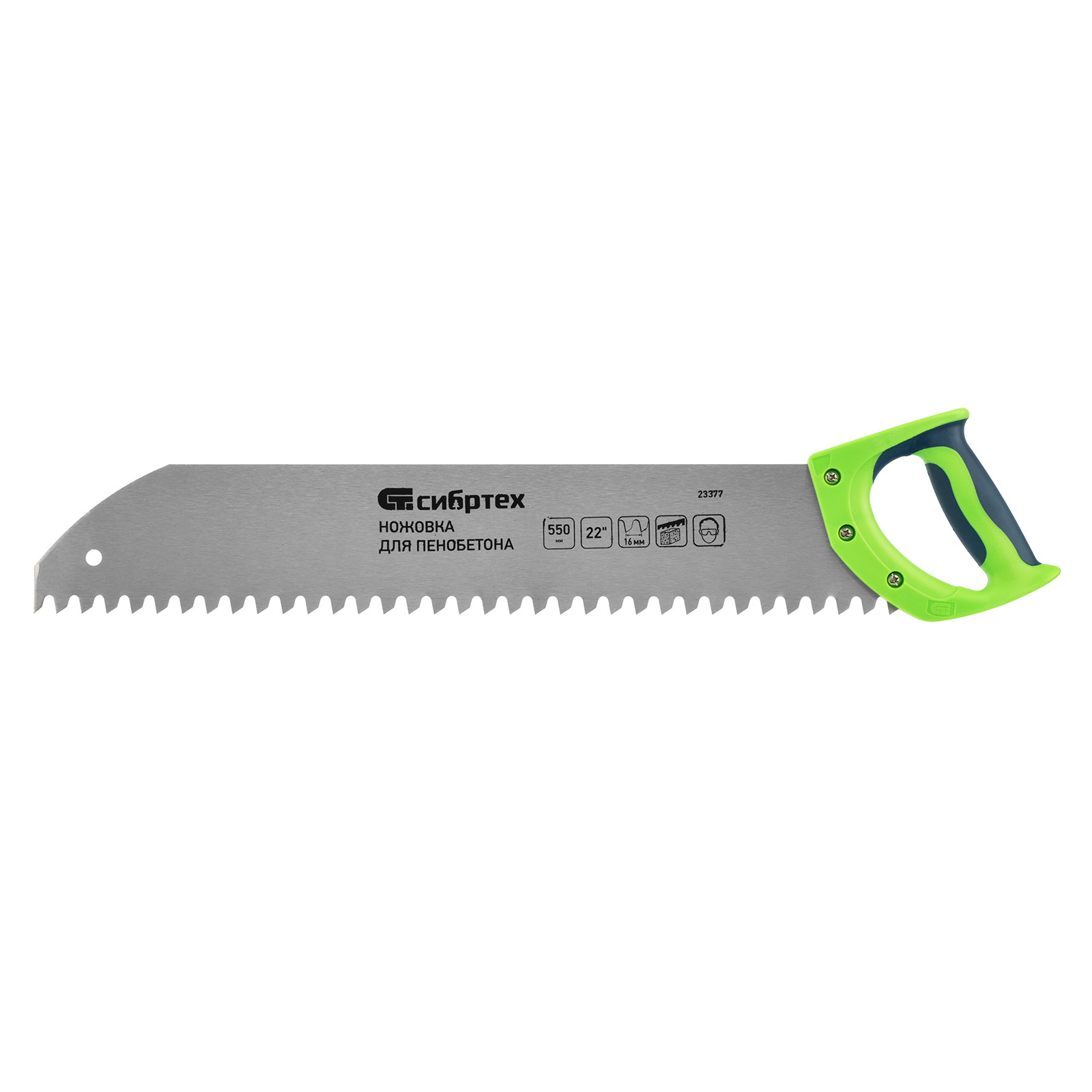 <p>Ножовка Сибртех 23377 с полотном длиной 550 мм, с двухкомпонентной рукояткой, используется для распиливания небольших блоков из пенобетона. Высокая эффективность работы достигается благодаря крупным зубьям с шагом 16 мм и двухгранной заточкой. Ножовка применяется во время строительных работ.</p><h2>Преимущества</h2><ul><li>Устойчивость к динамическим нагрузкам — полотно изготовлено из пружинной стали 65Г толщиной 1,2 мм и твердостью 45-52 HRC.</li><li>Длительный срок службы — защитное лаковое покрытие предотвращает коррозию.</li><li>Надежная конструкция — полотно закреплено в рукоятке 3 винтами.</li><li>Комфортная работа — эргономичная двухкомпонентная рукоятка обеспечивает надежный хват.</li></ul>