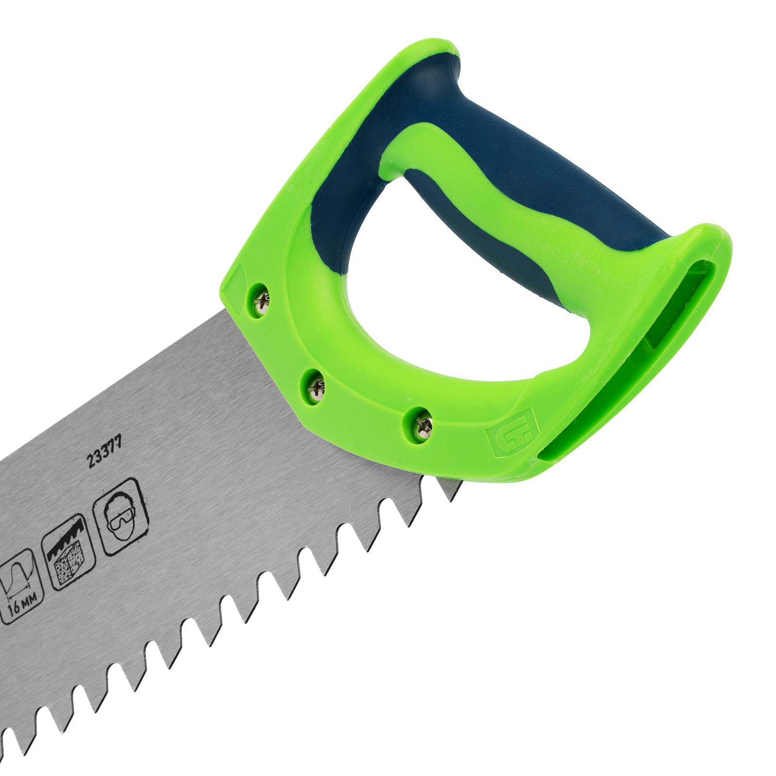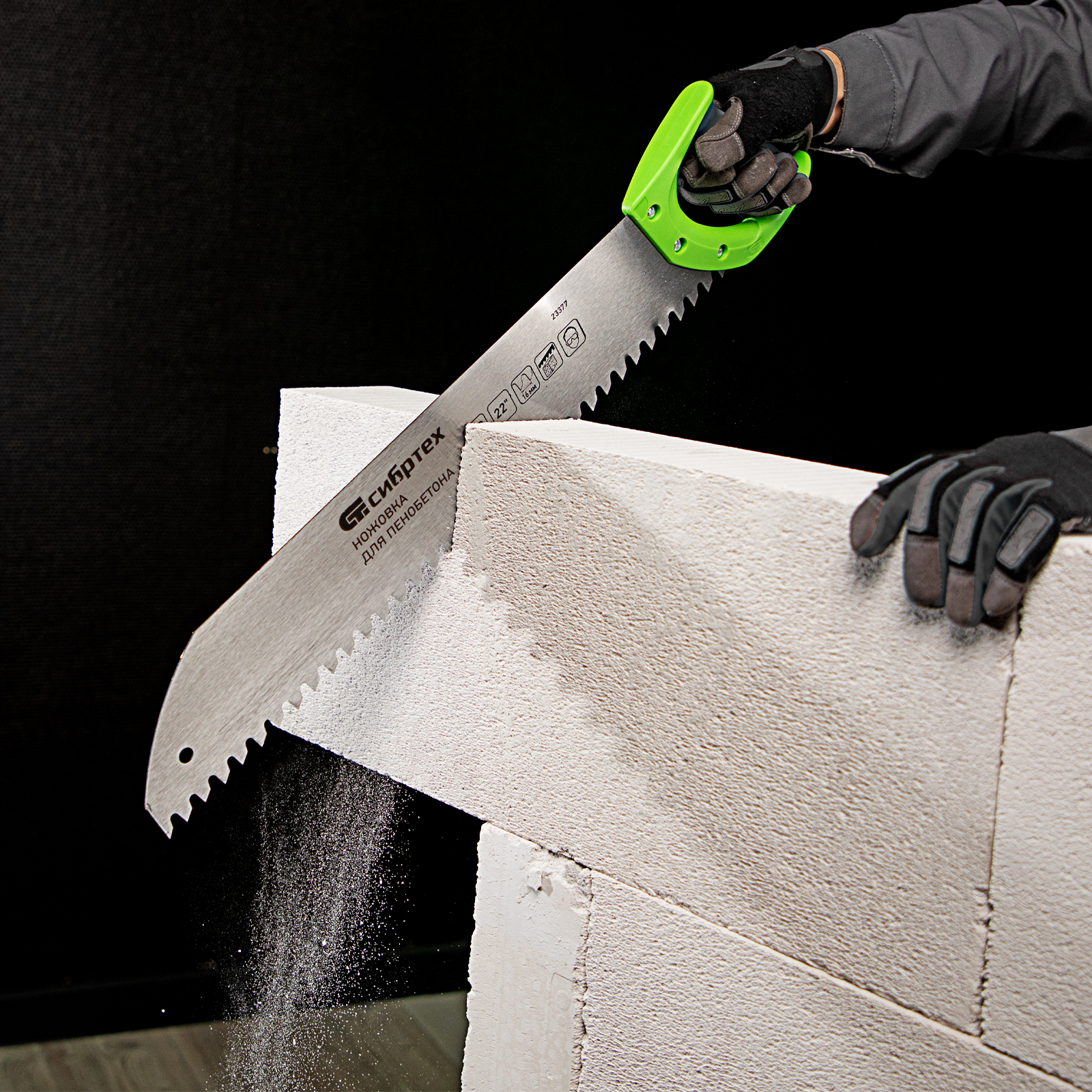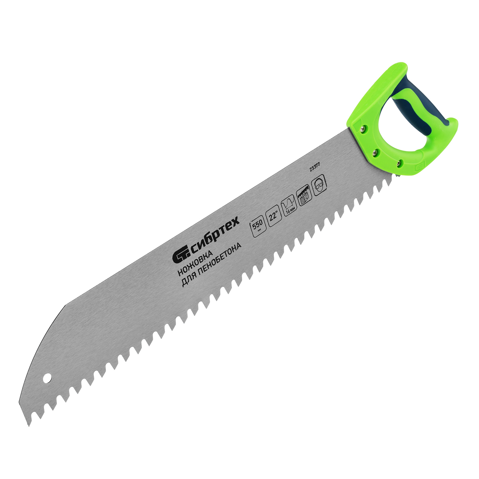 <p>Ножовка Сибртех 23377 с полотном длиной 550 мм, с двухкомпонентной рукояткой, используется для распиливания небольших блоков из пенобетона. Высокая эффективность работы достигается благодаря крупным зубьям с шагом 16 мм и двухгранной заточкой. Ножовка применяется во время строительных работ.</p><h2>Преимущества</h2><ul><li>Устойчивость к динамическим нагрузкам — полотно изготовлено из пружинной стали 65Г толщиной 1,2 мм и твердостью 45-52 HRC.</li><li>Длительный срок службы — защитное лаковое покрытие предотвращает коррозию.</li><li>Надежная конструкция — полотно закреплено в рукоятке 3 винтами.</li><li>Комфортная работа — эргономичная двухкомпонентная рукоятка обеспечивает надежный хват.</li></ul>