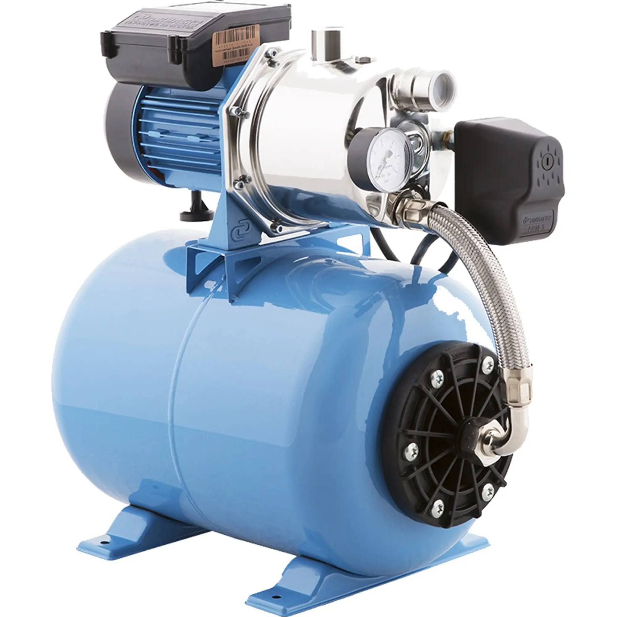 Насосная станция укомплектована поверхностным самовсасывающим электронасосом, горизонтальным гидроаккумулятором емкостью 24 литра, реле давления, манометром, соединительной арматурой и электрошнуром с вилкой.