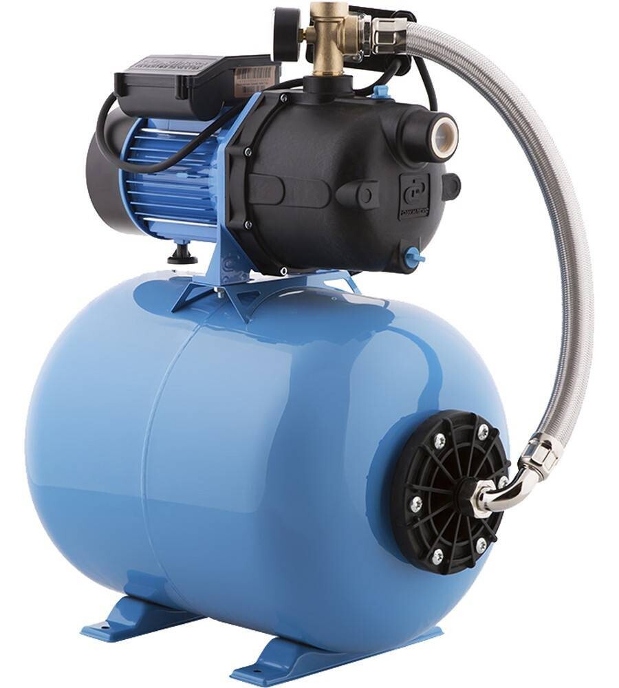 Насосная станция укомплектована поверхностным самовсасывающим электронасосом, горизонтальным гидроаккумулятором емкостью 50 литров, реле давления, манометром, соединительной арматурой и электрошнуром с вилкой.