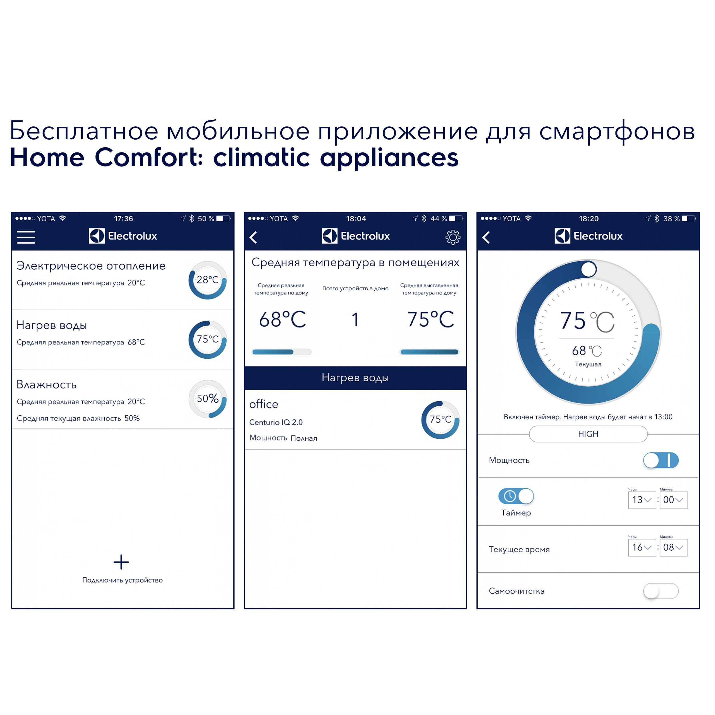Для управления водонагревателем по сети Wi-Fi используется съемный модуль Smart Wi-Fi (доп.опция) и специальное мобильное приложение Electrolux Home Comfort: climatic appliances. Приложение доступно для скачивания в App Store и Google Play для мобильных устройств с системами Android 4.1 или ios 6.0 и более поздних версий.