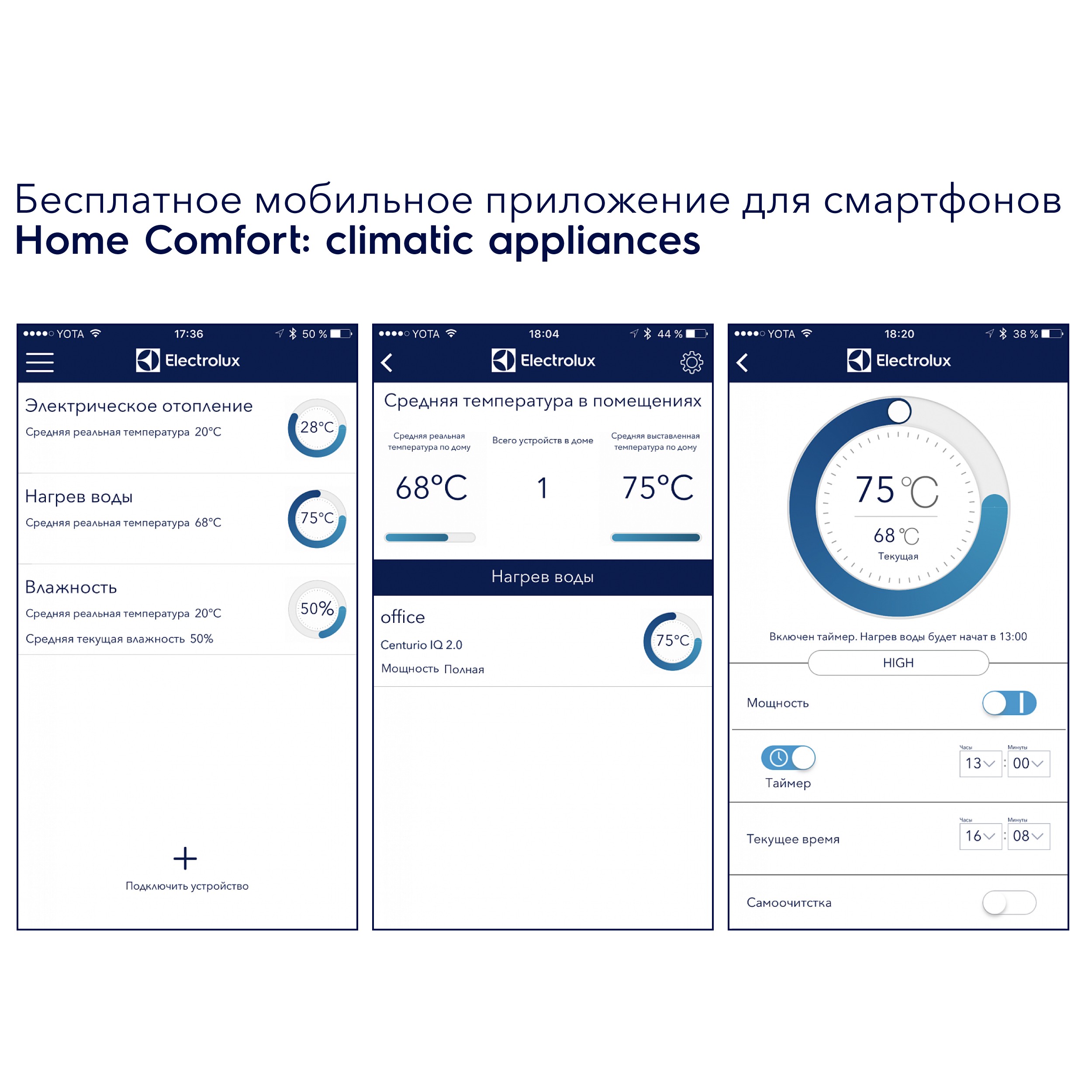 Для управления водонагревателем по сети Wi-Fi используется съемный модуль Smart Wi-Fi (доп.опция) и специальное мобильное приложение Electrolux Home Comfort: climatic appliances. Приложение доступно для скачивания в App Store и Google Play для мобильных устройств с системами Android 4.1 или ios 6.0 и более поздних версий.