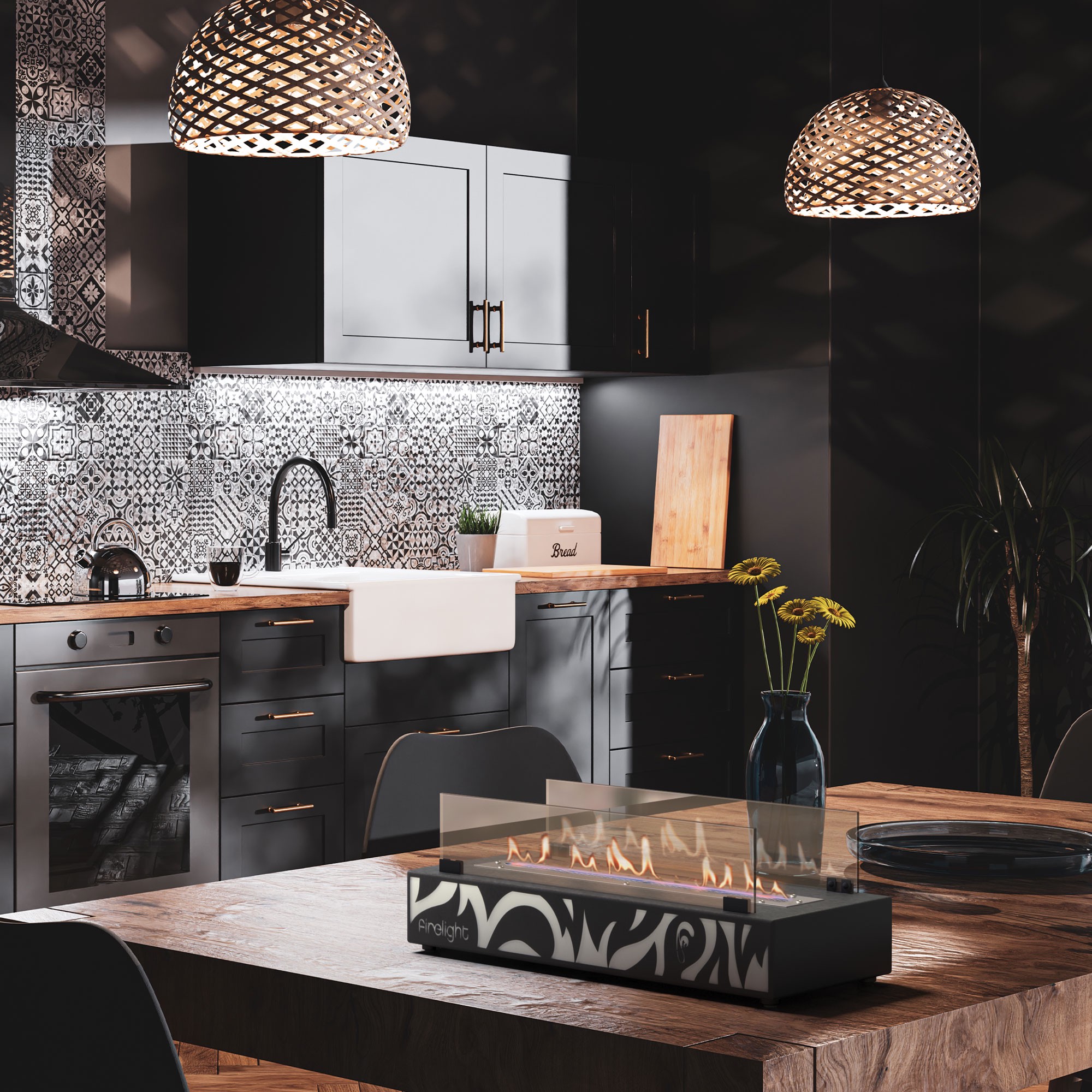 Настольный биокамин BFP/T-5025 Tale, облаченный в закаленное жаропрочное стекло и черную сталь, воплощает в себе силу и красоту древнеримского бога.