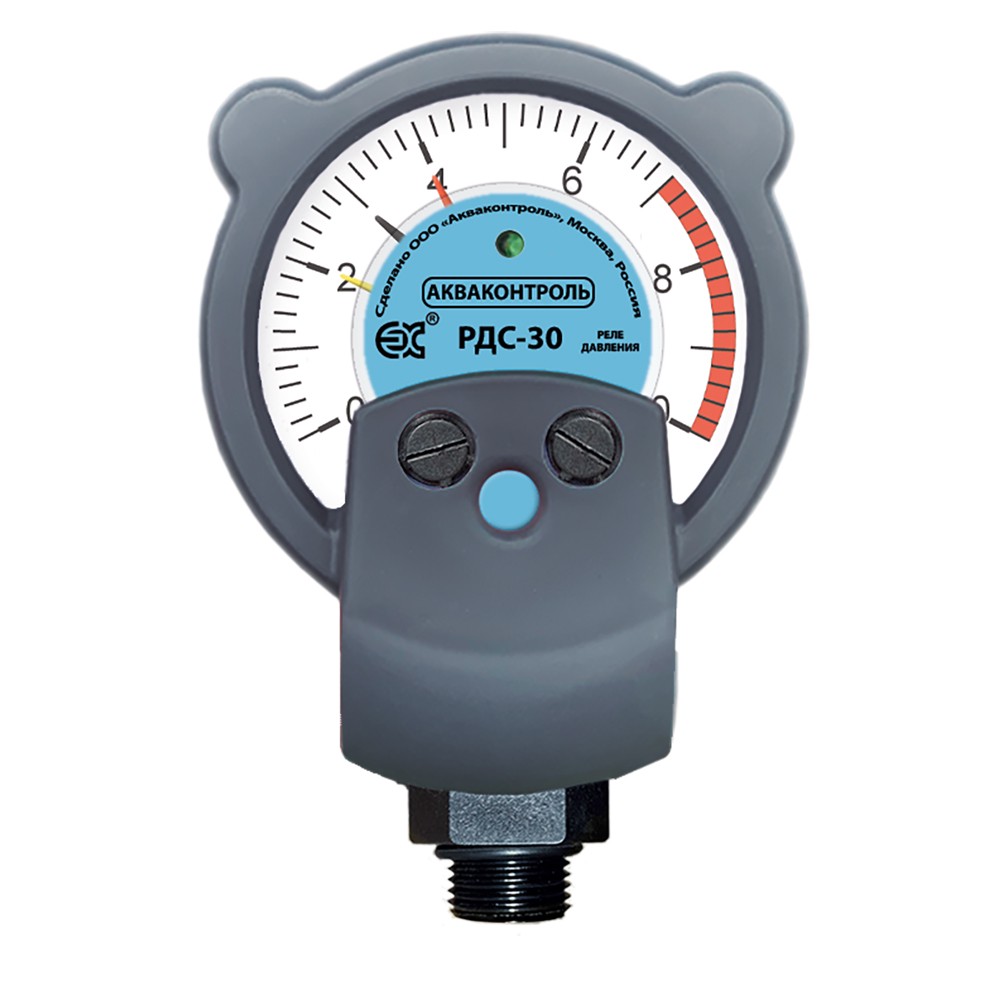 Реле Давления Стрелочное (РДС-30). Электронное устройство, для автоматизации включения/выключения скважинного насоса мощностью Р1, max - 1500 Вт, с защитой от "сухого хода". Удобное недорогое устройство заменяет электромеханическое реле давления с манометром. Предельные параметры пуска-остановки насоса быстро, но точно настраиваются при помощи регулировочных винтов и двух стрелочных указателей разных цветов.