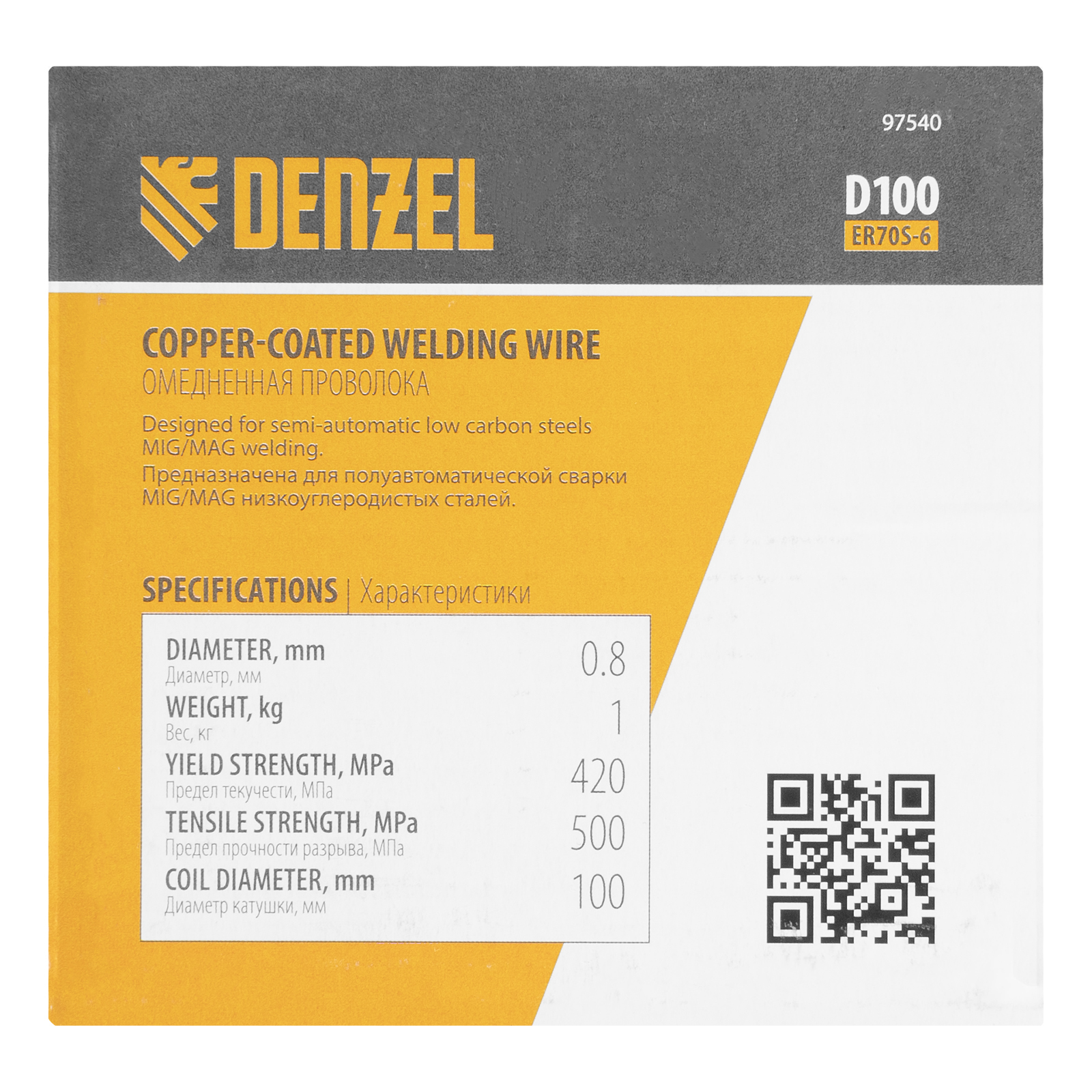 Омедненная проволока Denzel ER70S-6 97540 диаметром 0,8 мм и весом 1 кг, на катушке типа D100, предназначена для полуавтоматической сварки MIG/MAG углеродистых и низколегированных сталей в среде защитных газов. Необходима профессиональным сварщикам, пригодится также частному мастеру.