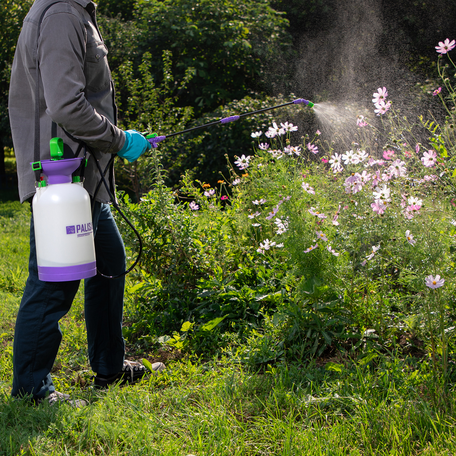 - Контроль напора подачи жидкости — опрыскиватель оснащен регулируемой распыляющей головкой.