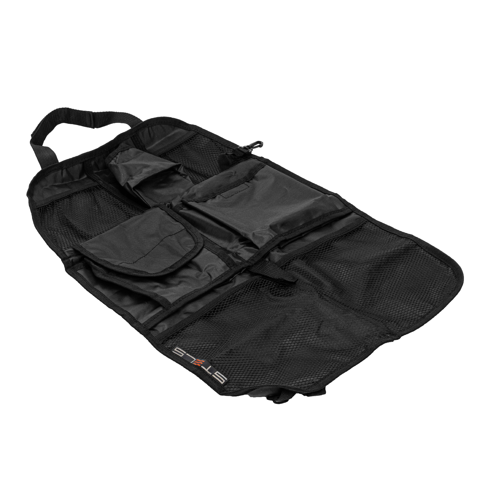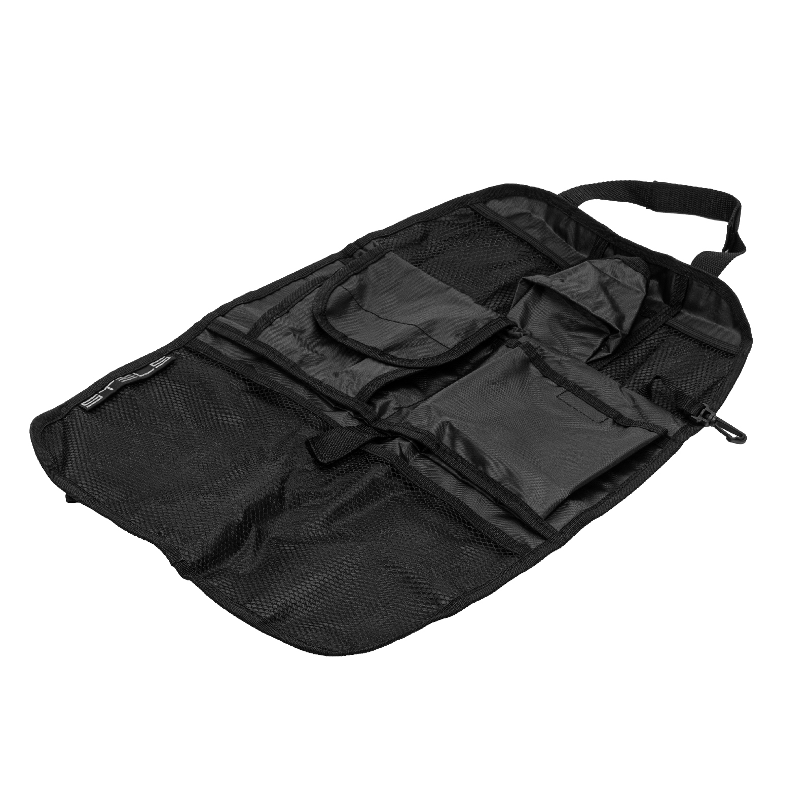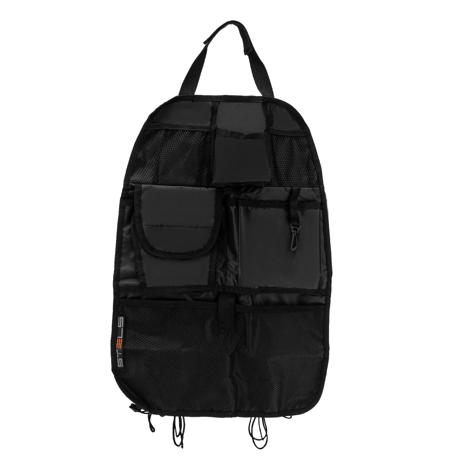 Органайзер автомобильный Stels 54393 устанавливается на спинку переднего сиденья. Он оснащен большими и маленькими отделениями для размещения различных предметов: ручек, документов, журналов, телефона, бутылки с водой и т.д.