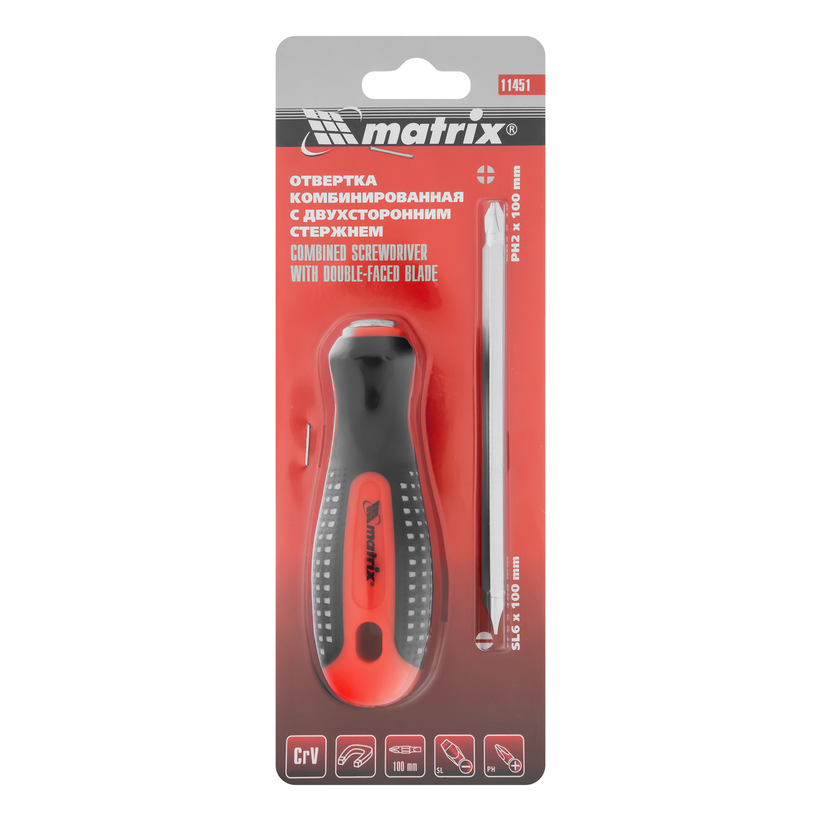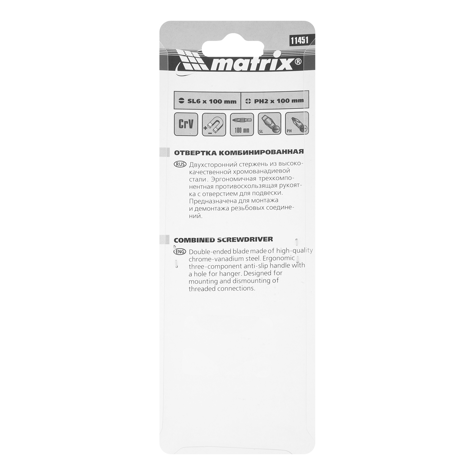 <p>Комбинированная отвертка Matrix Fusion 11451, SL6,0 / PH2 мм, CrV, с 3-х компонентной рукояткой «anti slip», будет полезна профессиональным мастерам при проведении строительных и монтажных работ. Благодаря двустороннему стержню она позволяет проводить монтаж/демонтаж крепежа со шлицами Phillips и Slotted. Отвертка со стержнем 125 мм позволяет работать с крепежом в углублениях.</p><h2>Преимущества</h2><ul><li>Стержень и жало выполнены из износостойкой легированной стали CrV твердостью 50-52 HRC, что обеспечивает долгий срок службы отвертки.</li><li>Намагниченный наконечник позволяет зафиксировать крепеж и направлять отвертку одной рукой, а другой придерживать закрепляемую деталь.</li><li>Трехкомпонентная рукоятка «anti slip» с подпальцевыми выемками и специальными секциями обеспечивает комфортный и надежный хват без проскальзывания.</li></ul>