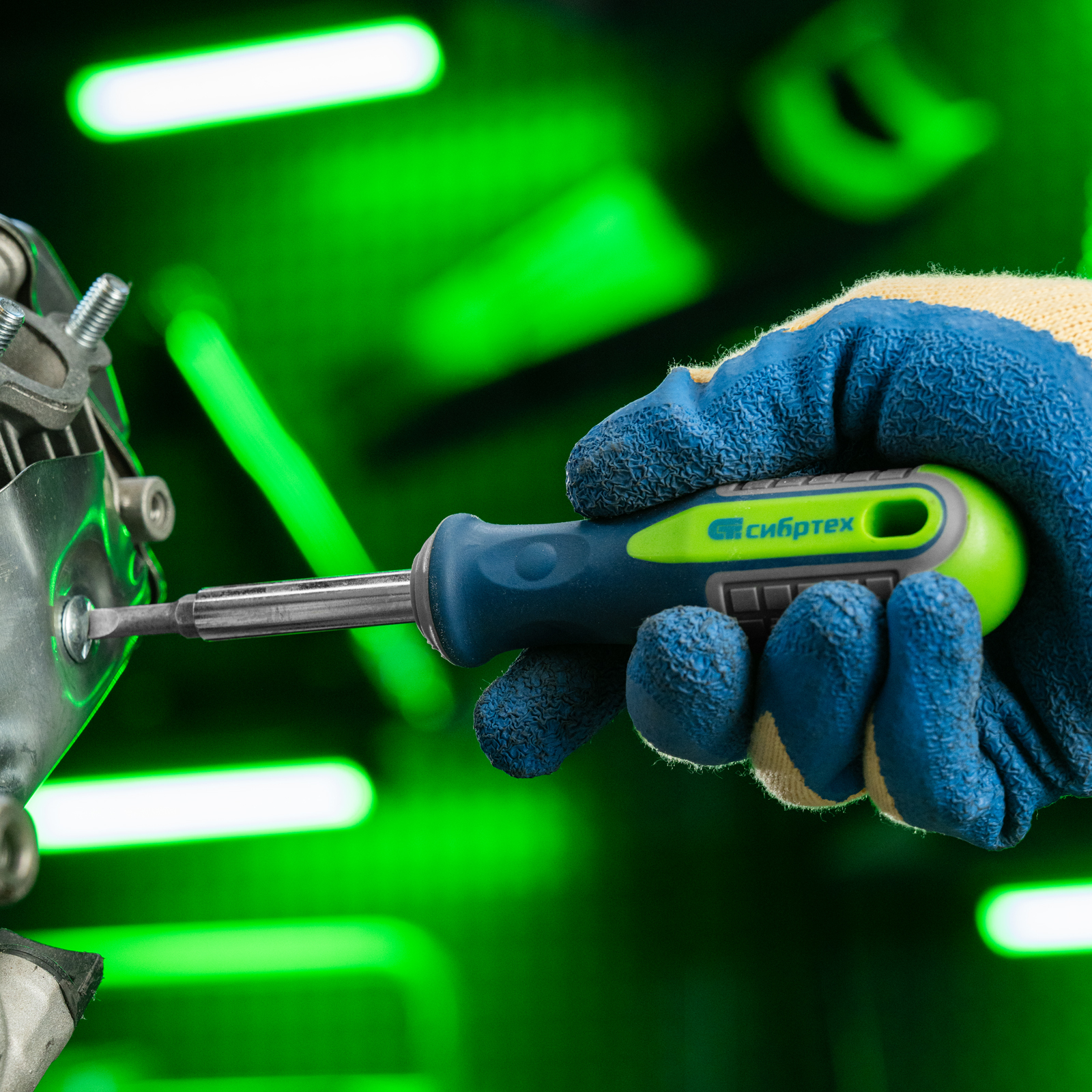 <p>Комбинированная отвертка Сибртех 13377 с двухсторонними битами позволяет закручивать и извлекать крепежные элементы со шлицами SL5,0 / PH1, SL6,0 / PH2. Будет полезна при проведении мелких ремонтных и монтажных работ в доме, на даче, в гараже. Стержень длиной 75 мм удобен для работы с легкодоступным крепежом и в углублениях.</p><h2>Преимущества</h2><ul><li>Долговечность и устойчивость к нагрузкам — стержень и биты изготовлены из высококачественной стали CrV, биты закалены до твердости 50-52 HRC.</li><li>Защита от коррозии — на стержень нанесено хромовое покрытие, на биты — фосфатное.</li><li>Прочная фиксация — благодаря металлическим шариковым фиксаторам стержень надежно соединяется с рукояткой, а биты — со стержнем.</li><li>Комфортная эксплуатация — рабочие части намагничены, эргономичная рукоятка позволяет долго работать без ощущения усталости.</li></ul>