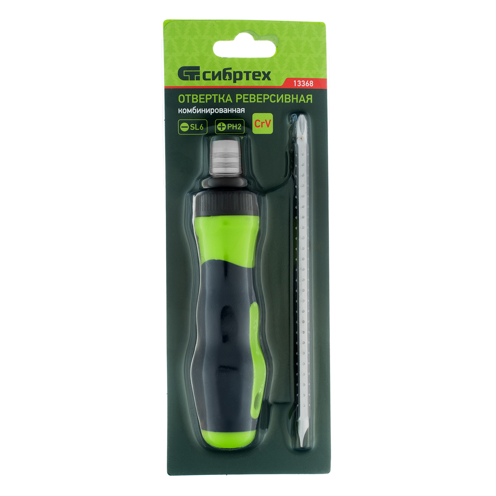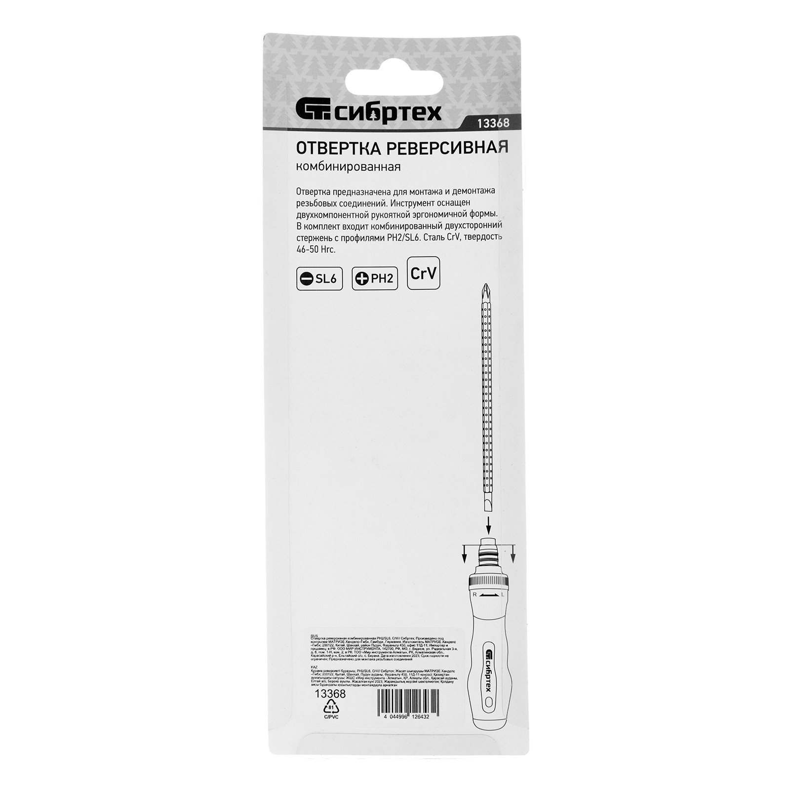 <p>Реверсивная комбинированная отвертка Сибртех 13368 с двусторонним стержнем из стали CrV предназначена для работы с крепежом типоразмеров PH2 и SL6. Используется при проведении мелких ремонтных и монтажных работ в быту. Благодаря трещоточному механизму отвертку не требуется постоянно перехватывать. Длина стержня 160 мм позволяет работать с глубоко расположенным крепежом.</p><h2>Преимущества</h2><ul><li>Прочность и высокий ресурс — стержень выполнен из износостойкой хромованадиевой стали твердостью 50-54 HRC.</li><li>Продуманная конструкция — длину выступания стержня можно регулировать в зависимости от углубления крепежа.</li><li>Комфортная работа — эргономичная двухкомпонентная рукоятка позволяет длительное время работать без ощущения усталости.</li></ul>