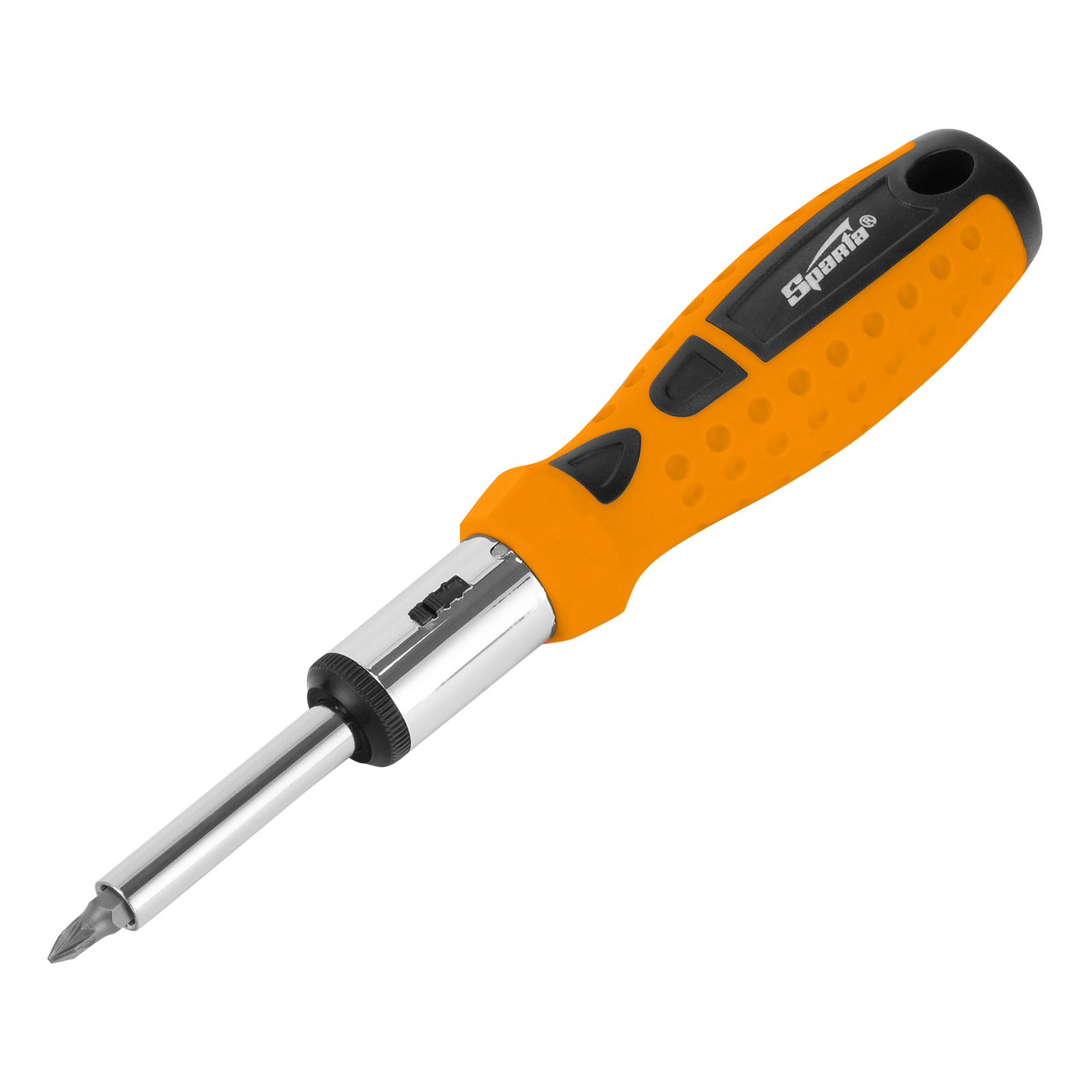Реверсивная отвертка Sparta 115455 с набором бит из стали CrV, входит в комплект из 10 предметов и используется для закручивания и откручивания резьбовых крепежей. Храповый механизм позволяет обойтись без перехватывания ручки и переставления шлица, что значительно ускоряет и упрощает работу. В наборе 9 бит самых популярных размеров со шлицами SL, PH, PZ. Комплект рекомендован для бытового применения и будет полезен при сборке мебели, ремонте бытовой техники, пригодится также и в гараже.