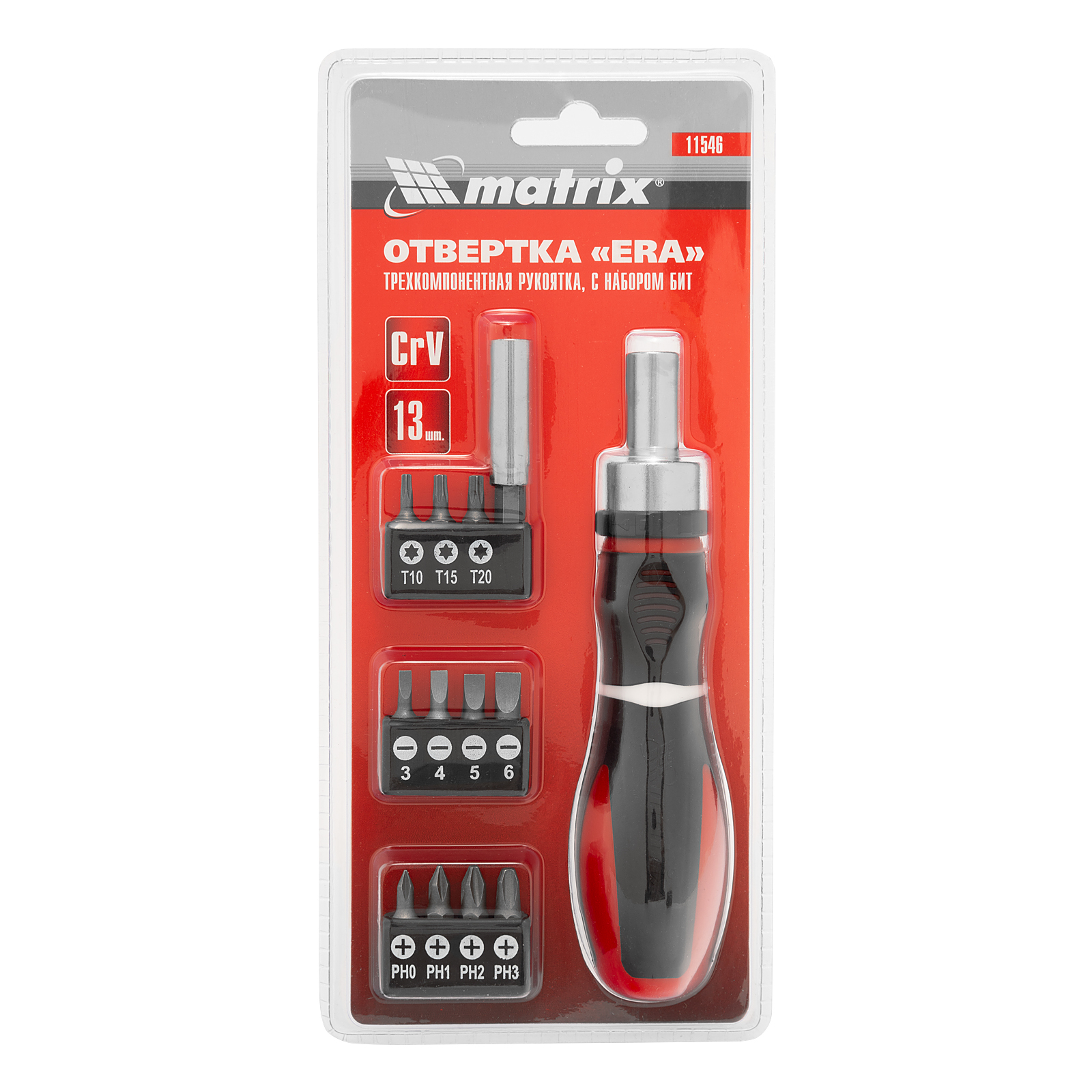 Отвертка реверсивная, набор бит, 11 шт, CrV Matrix