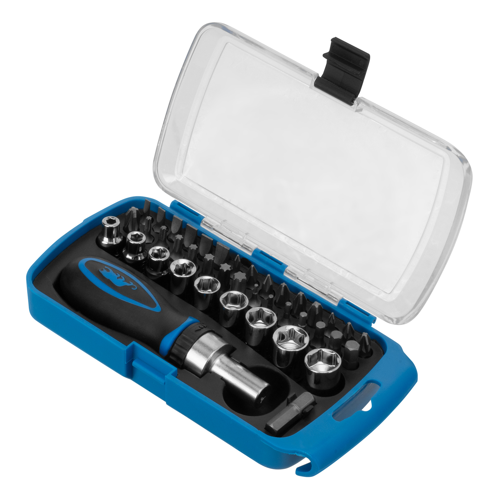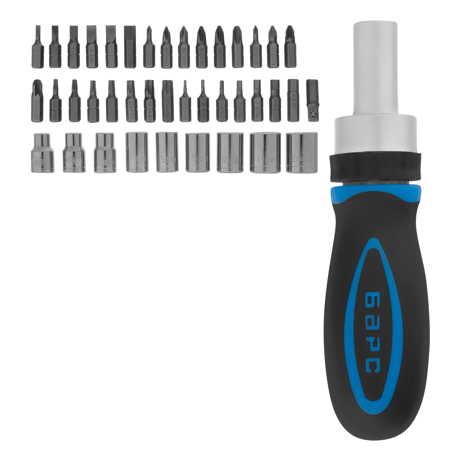 Отвертка реверсивная - 1 штБиты 25 мм: РН0, РН1, РН2, РН3, PZ0, PZ1, PZ2, PZ3, SL3, SL4, SL5, SL6, SL7, H1.5, H2, H2.5, H3, H4, H5, H6, T10, T15, T20, T25, T27, T30, T40 - 27 штТорцевые головки: 4 мм, 5 мм, 6 мм, 7 мм, 8 мм, 9 мм, 10 мм, 11 мм, 12 мм - 9 штАдаптер для бит 1/4" - 1 шт