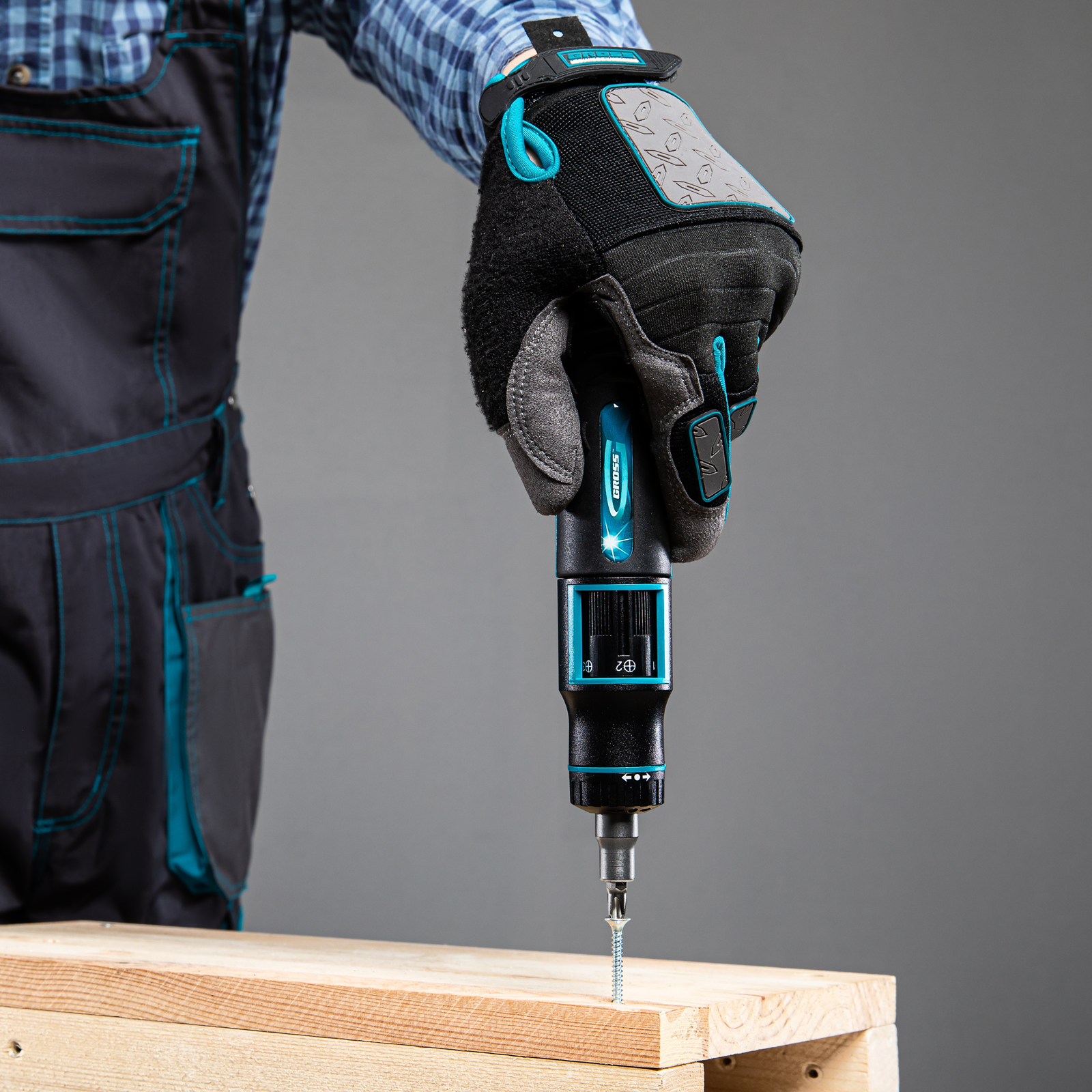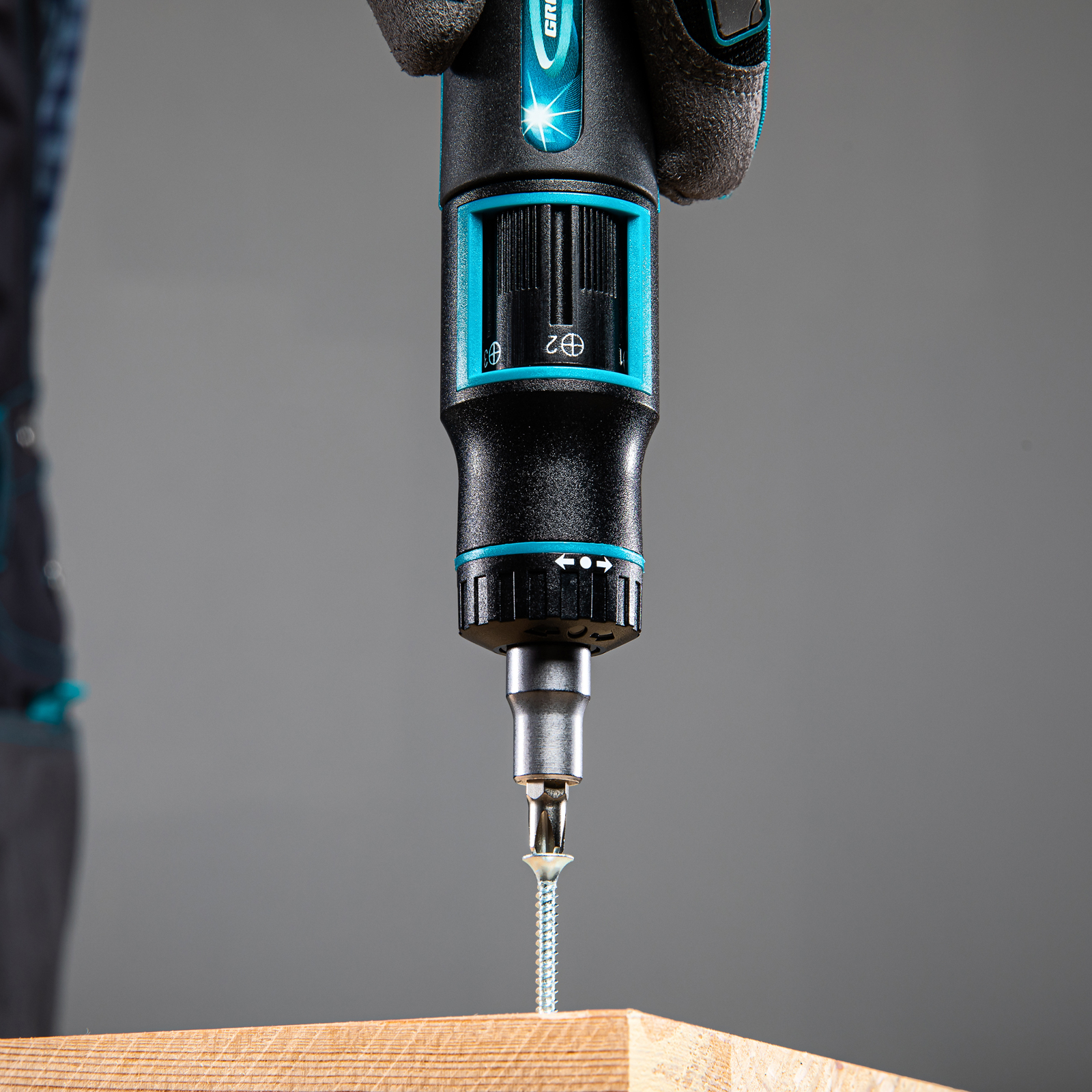 Реверсивная отвертка с револьверным механизмом Gross 11601 из стали S2, в наборе из 11 предметов, значительно повышает производительность работы при монтаже/демонтаже крепежа. За счет храпового механизма не нужно перехватывать руку или вынимать шлиц из крепежа, поэтому инструмент оптимален для профессионального использования. В качестве сменных насадок для отвертки можно применять любые биты длиной 25 мм с хвостовиком 1/4 дюйма.