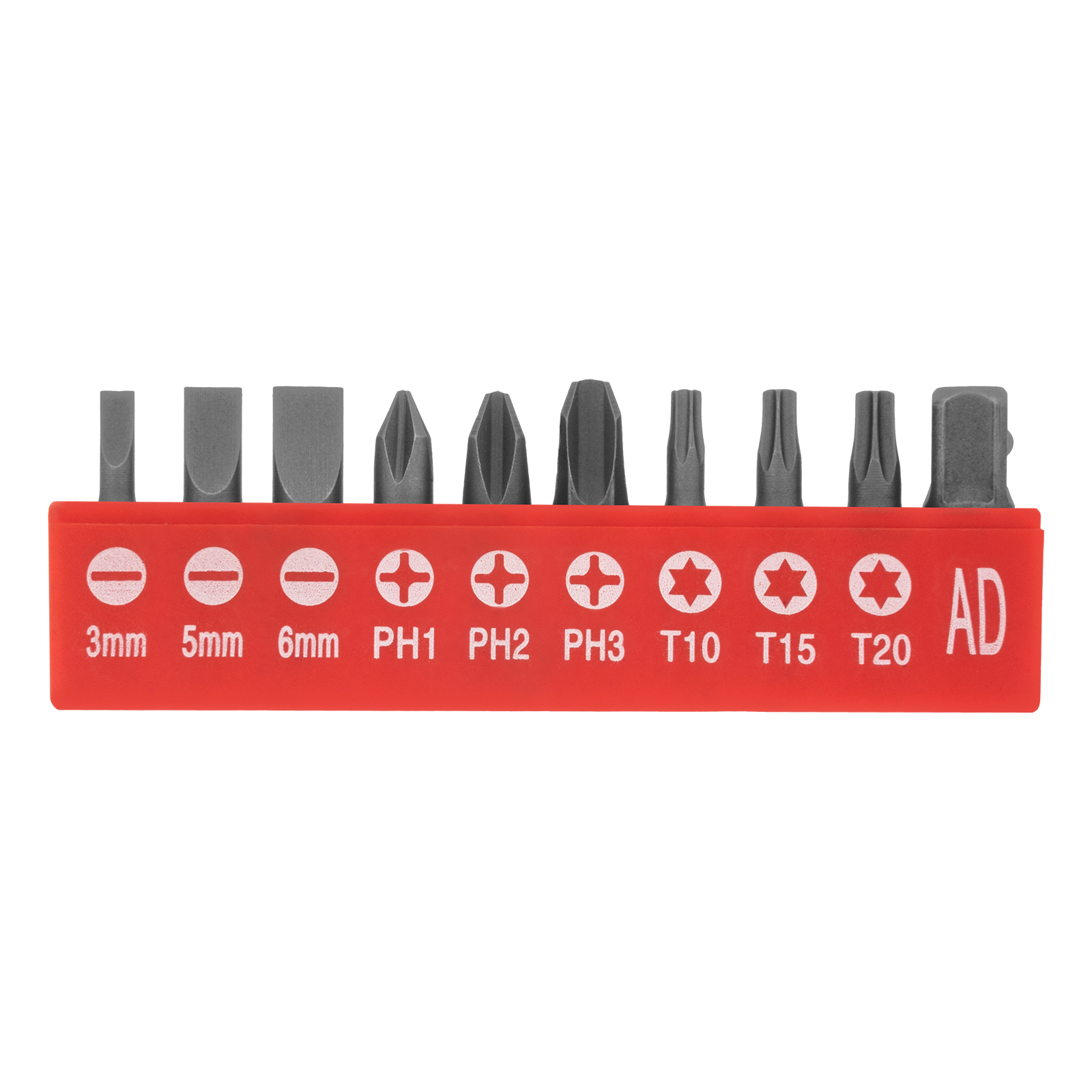 - Удобное хранение и подбор нужных насадок — в комплект поставки входит плашка-держатель для бит с обозначениями типов шлицев и размеров.