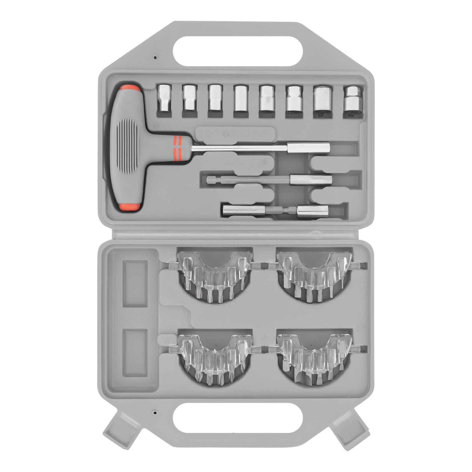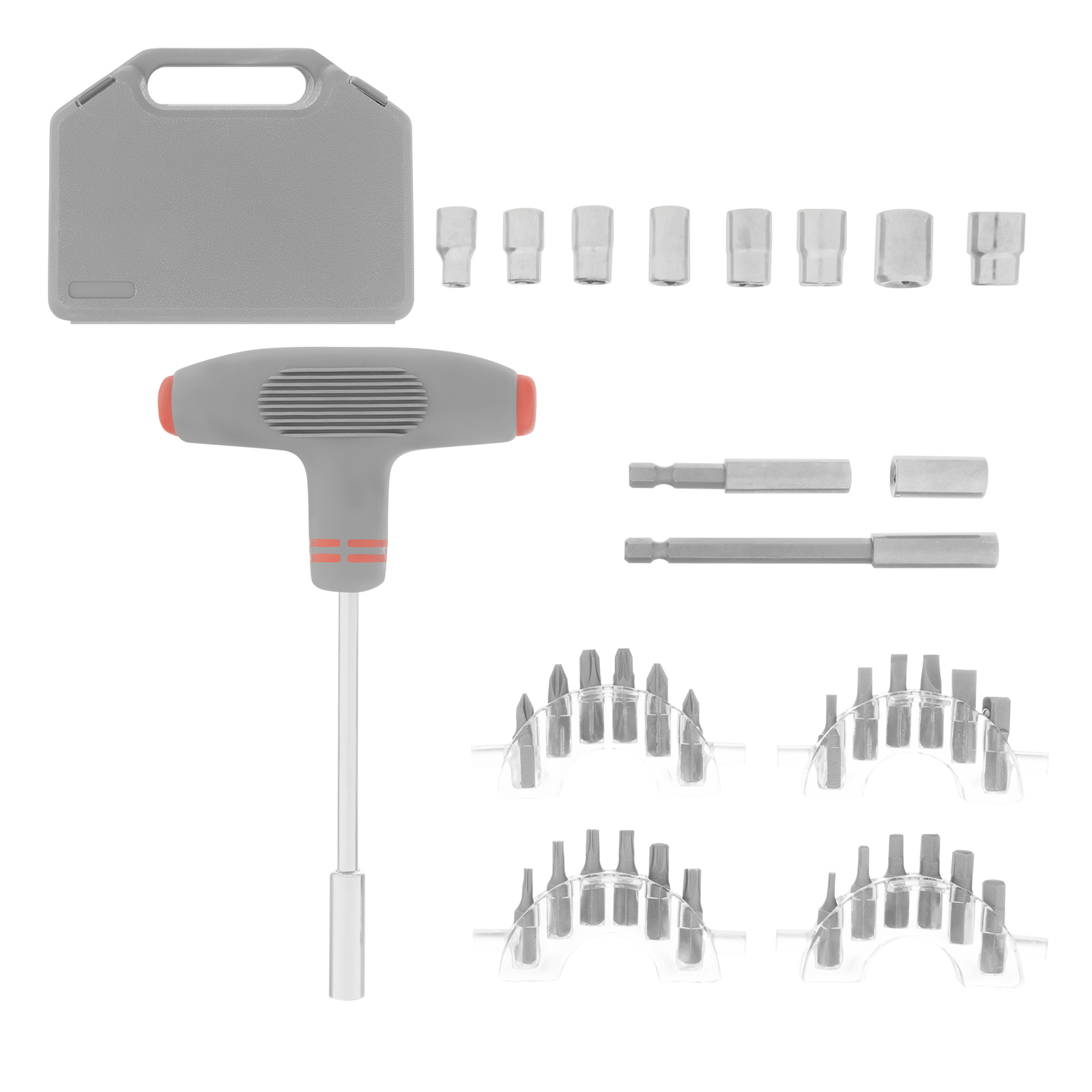 Отвертка Т-образная - 1 штБиты 25 мм: РН1, РН2, РН3, PZ1, PZ2, PZ3, SL3, SL4, SL5, SL6, SL7, H2, H3, H4, H5, H5.5, H6, T10, T15, T20, T25, T27, T30 - 23 штТорцевые головки: 4, 6, 7, 8, 9, 10, 11, 12 мм - 8 штБитодержатели: 60 мм, 90 мм - 2 штПереходник для бит - 1 штАдаптер для торцевых головок 25 мм - 1 шт