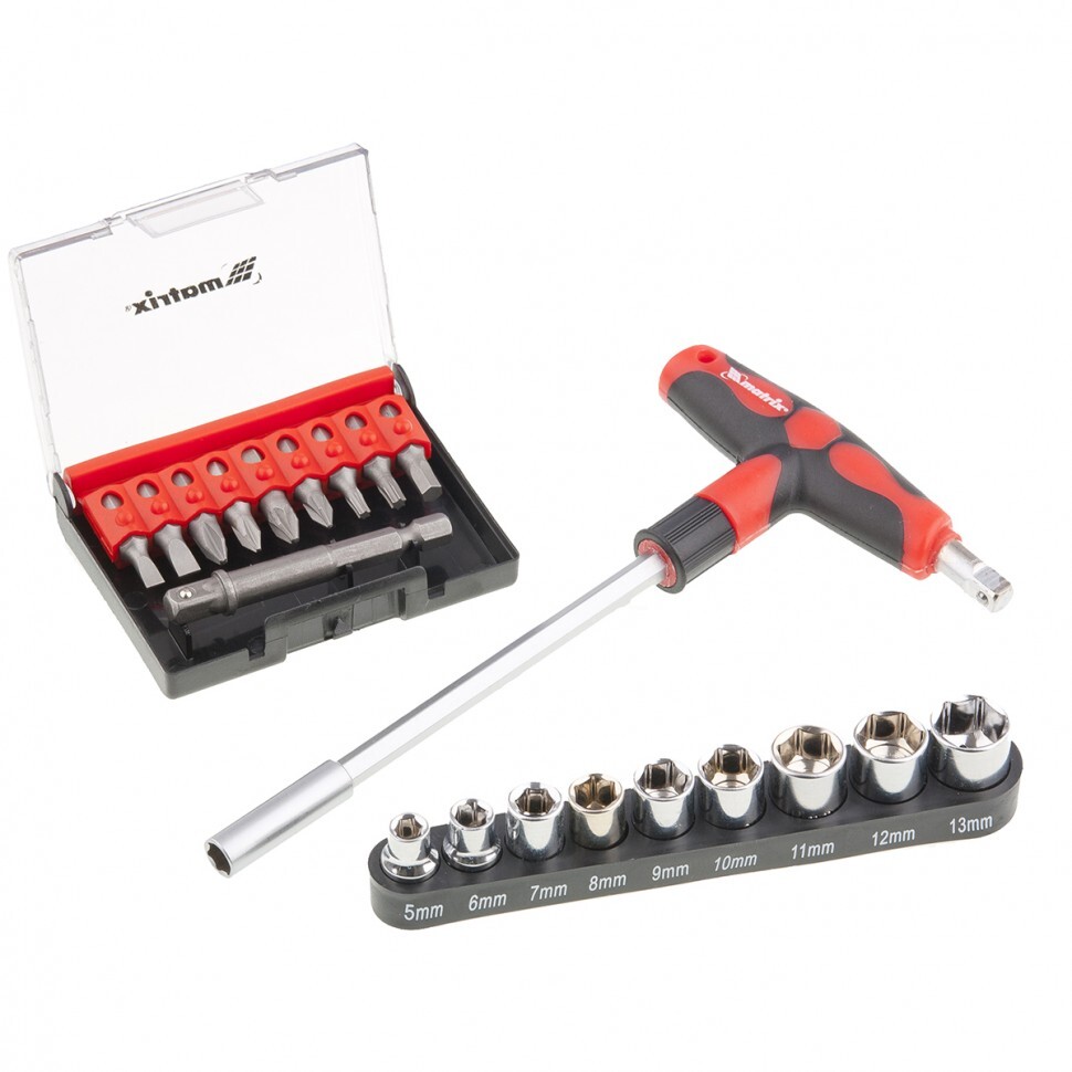 Отвертка Matrix 11574 с Т-образной эргономичной ручкой, набором бит и насадок (торцевых головок) из стали CrV, входит в комплект из 20 предметов, предназначенный для работы с резьбовым крепежом. В нем 9 бит и 9 торцевых головок, поэтому набор подходит для монтажа и демонтажа болтов, шурупов и гаек. Для фиксации бит предусмотрен присоединительный шестигранник размером 1/4", для торцевых головок имеется адаптер. Использование присоединительного квадрата размером 1/4", встроенного в ручку отвертки, позволяет увеличить длину рычага и работать со значительным усилием. Набор рекомендован для профессионального применения.