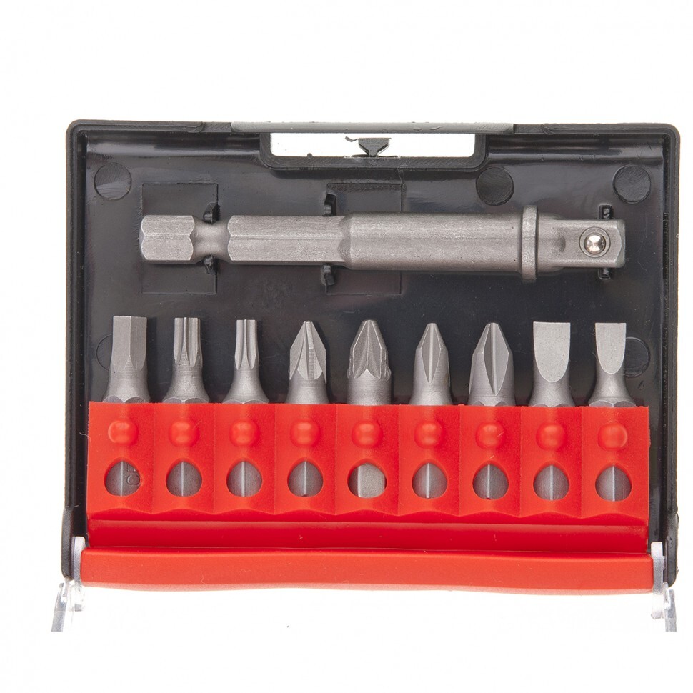 Отвертка Т-образная - 1 штБиты 25 мм: РН1, РН2, PZ1, PZ2, SL4, SL5, H4.5, T15, T20 - 9 штТорцевые головки: 4, 6, 7, 8, 9, 10, 11, 12 мм - 8 штАдаптер для торцевых головок 65 мм - 1 штПластиковый кейс для бит - 1 шт