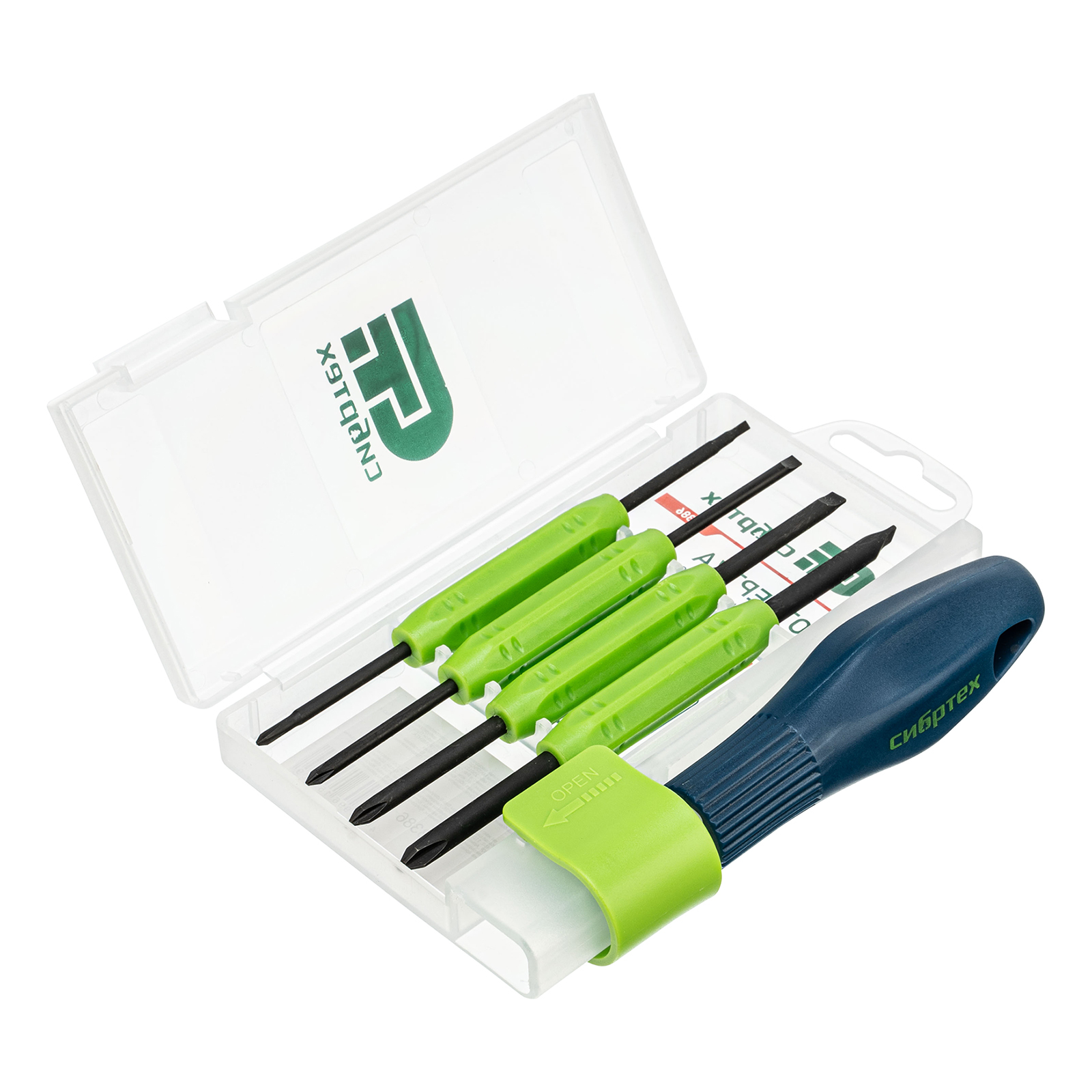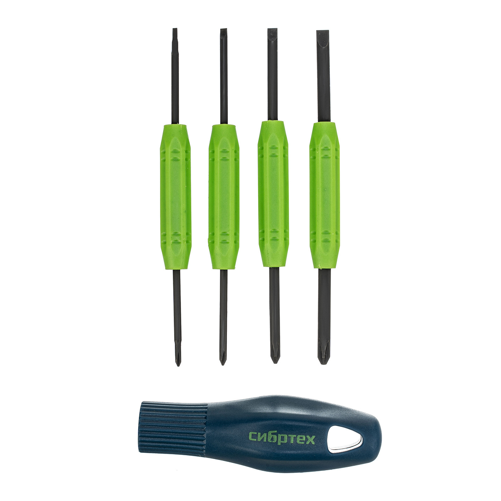 <p>Отвертка со сменными двухсторонними насадками Сибртех 13386, 8 в 1, из стали CrV, в пластиковом кейсе, рассчитана на работу с мелкими деталями. С ее помощью можно осуществить точные работы при ремонте электроники, часов, очков и различных приборов. Набор предназначен для бытового применения.</p><h2>Преимущества</h2><ul><li>Стержни выполнены из хромованадиевой стали и закалены до твердости 50-56 HRC, что обеспечивает прочность и устойчивость инструментов к нагрузкам.</li><li>На рукоятке имеются ребра для лучшего удержания отвертки.</li><li>Компактное и удобное хранение набора обеспечивает карманный пластиковый кейс с защелкой.</li></ul>