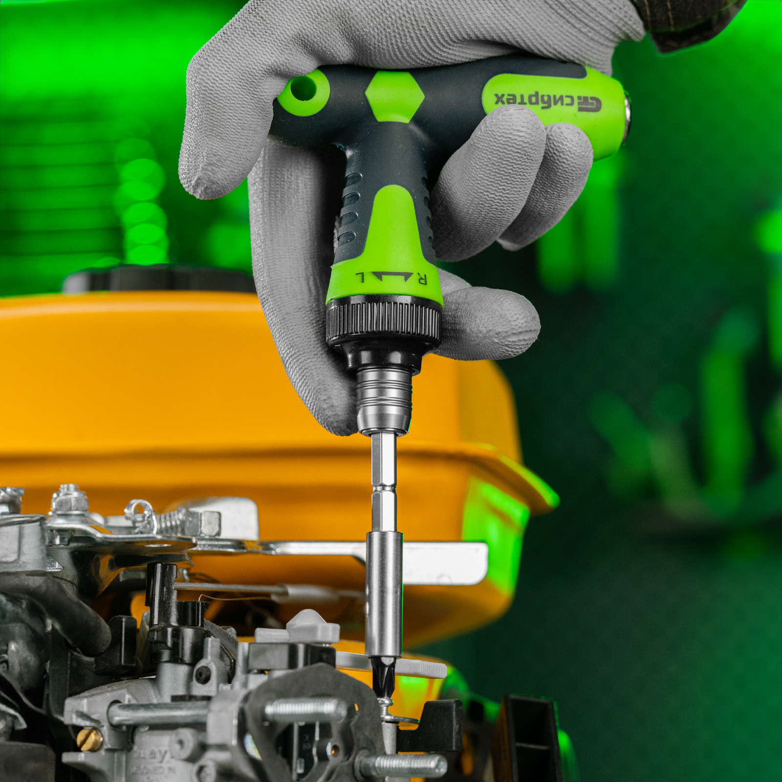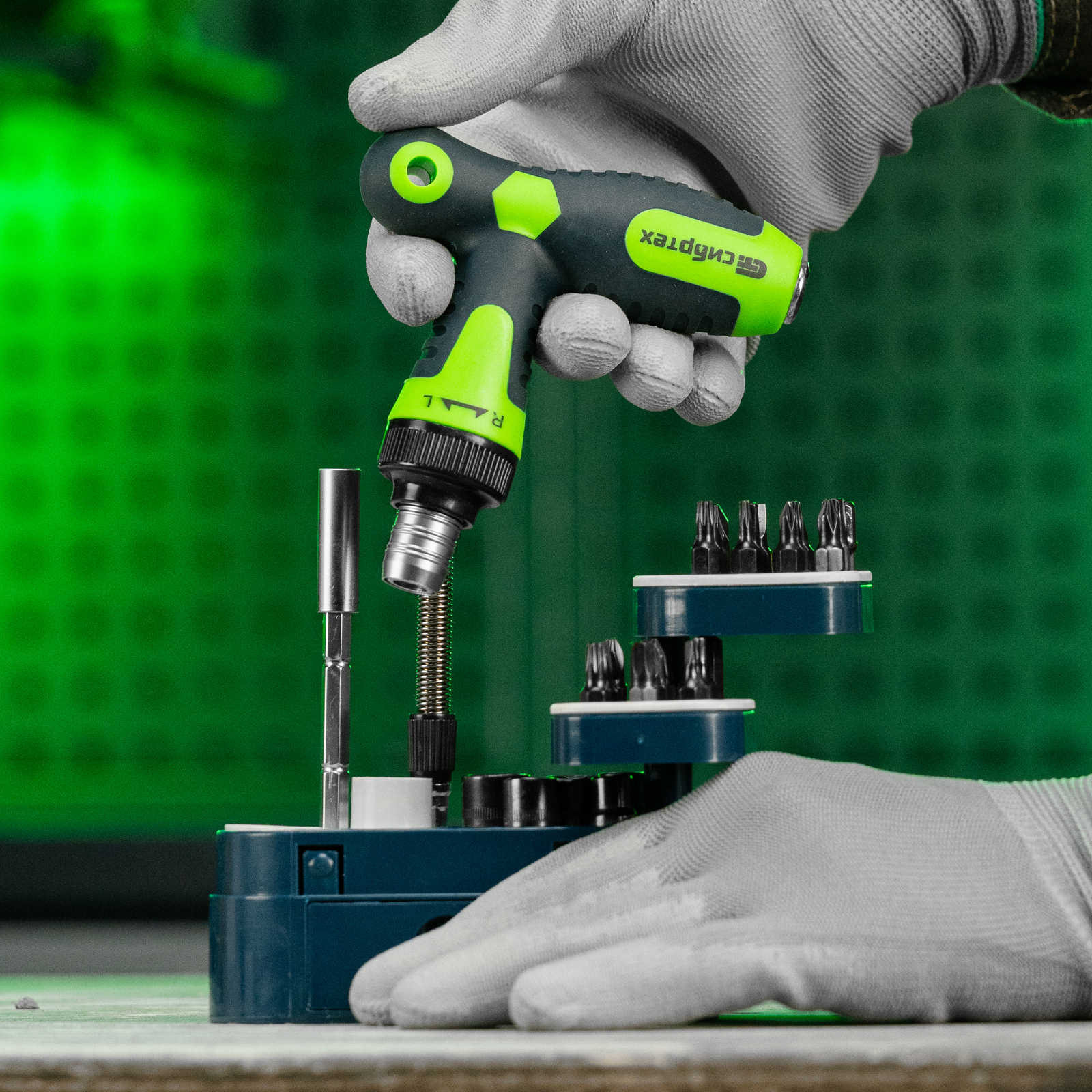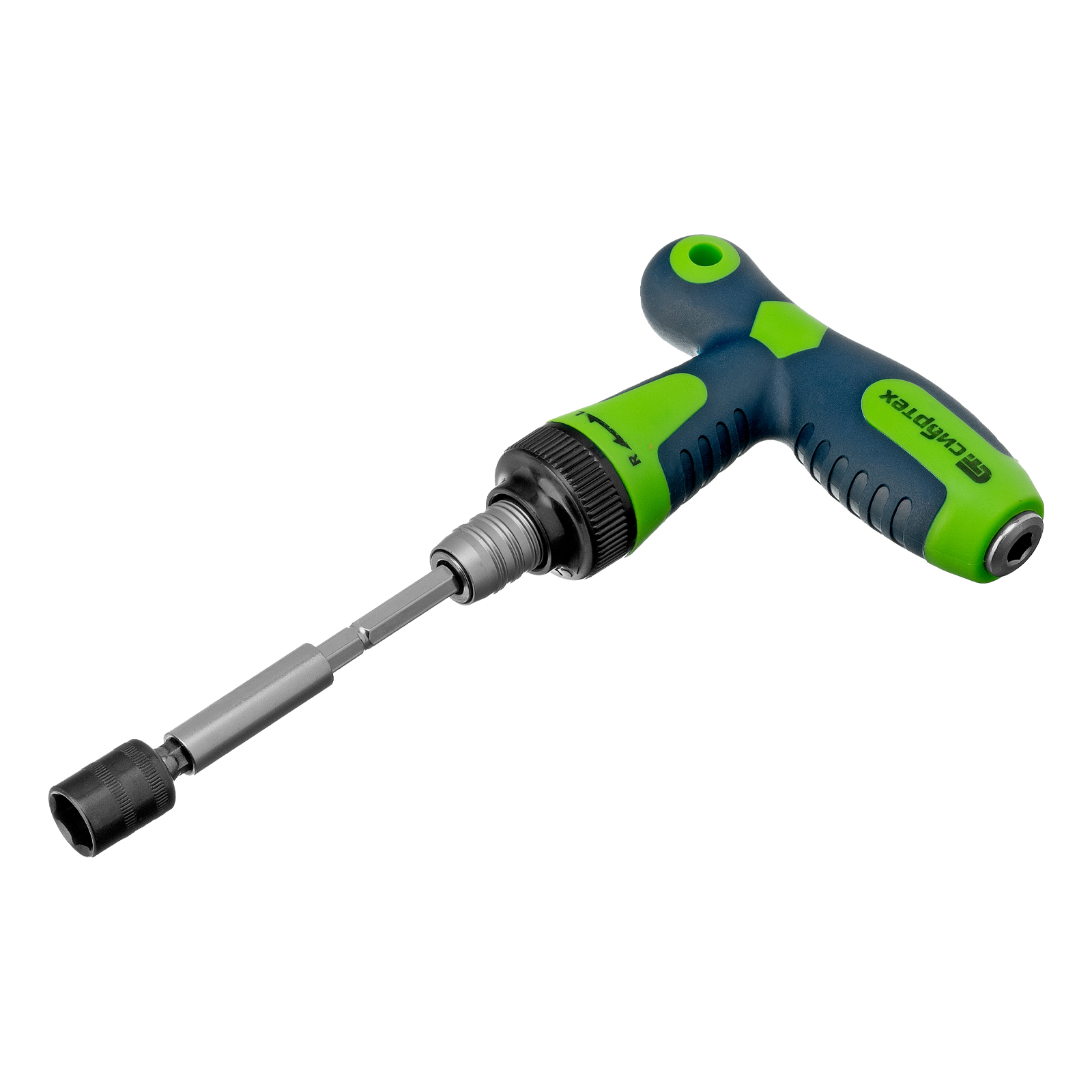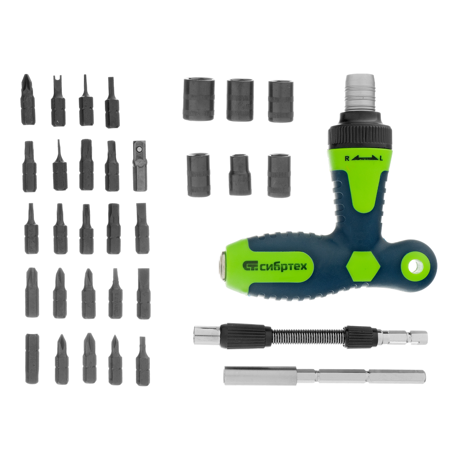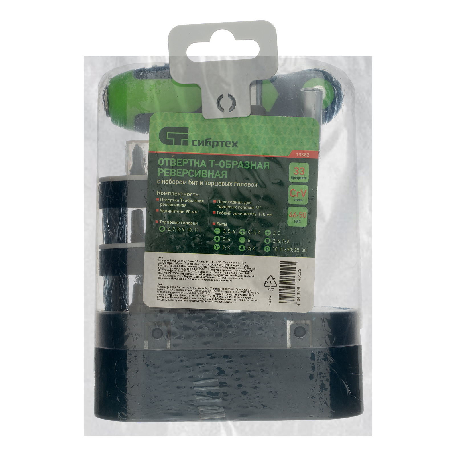 Отвертка Т-образная реверсивная с набором бит, торцевых головок, 33 предмета, CrV Сибртех