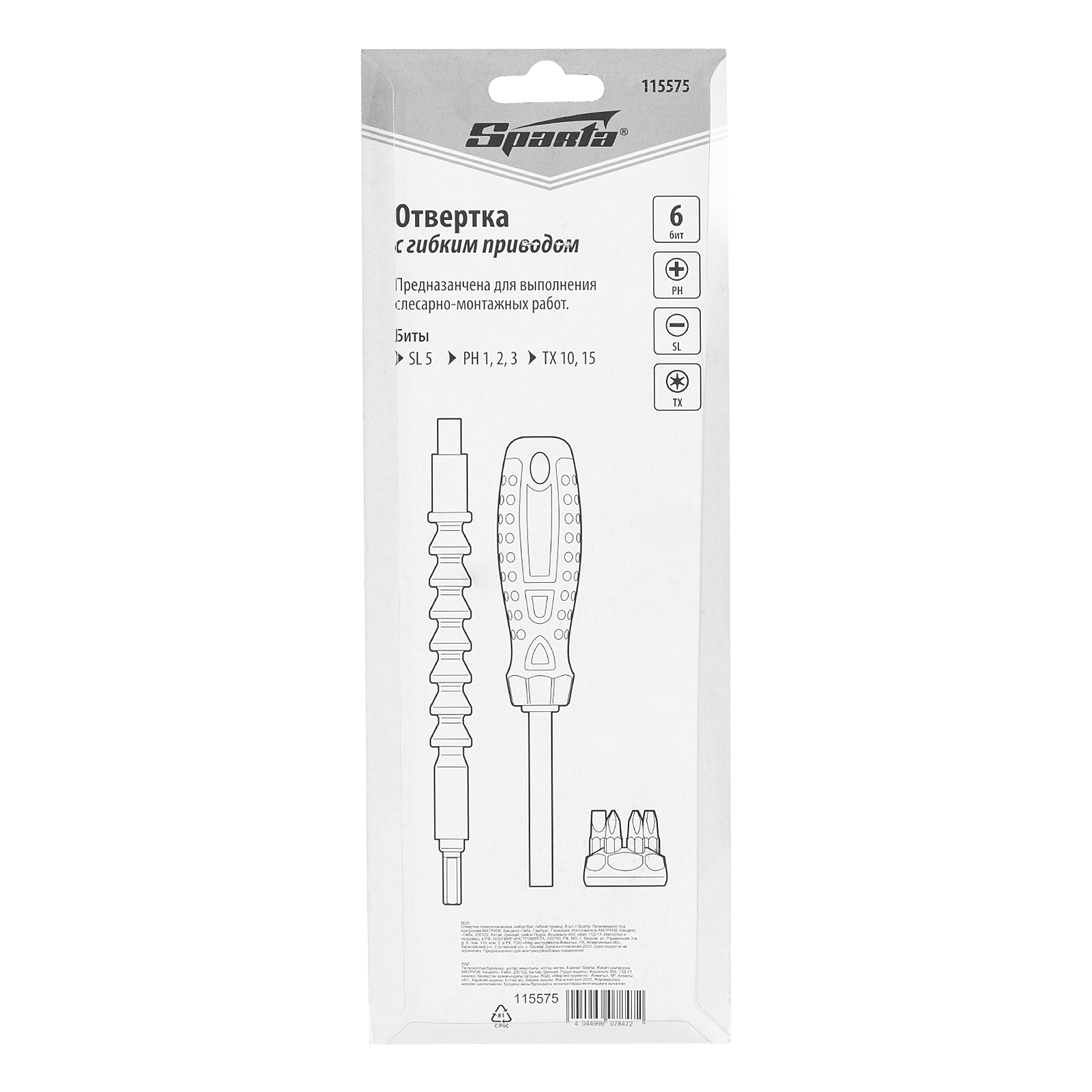 Телескопическая отвертка Sparta 115575 с набором бит и гибким приводом входит в комплект из 8 шт., предназначенный для работы с резьбовыми соединениями. Биты со шлицами PH, SL и Torx подходят для большинства крепежных элементов. Гибкий удлинитель облегчает работу в углублениях и других труднодоступных местах. Отвертка рекомендована для бытового применения и используется для сборки мебели, ремонта электроприборов, велосипедов.