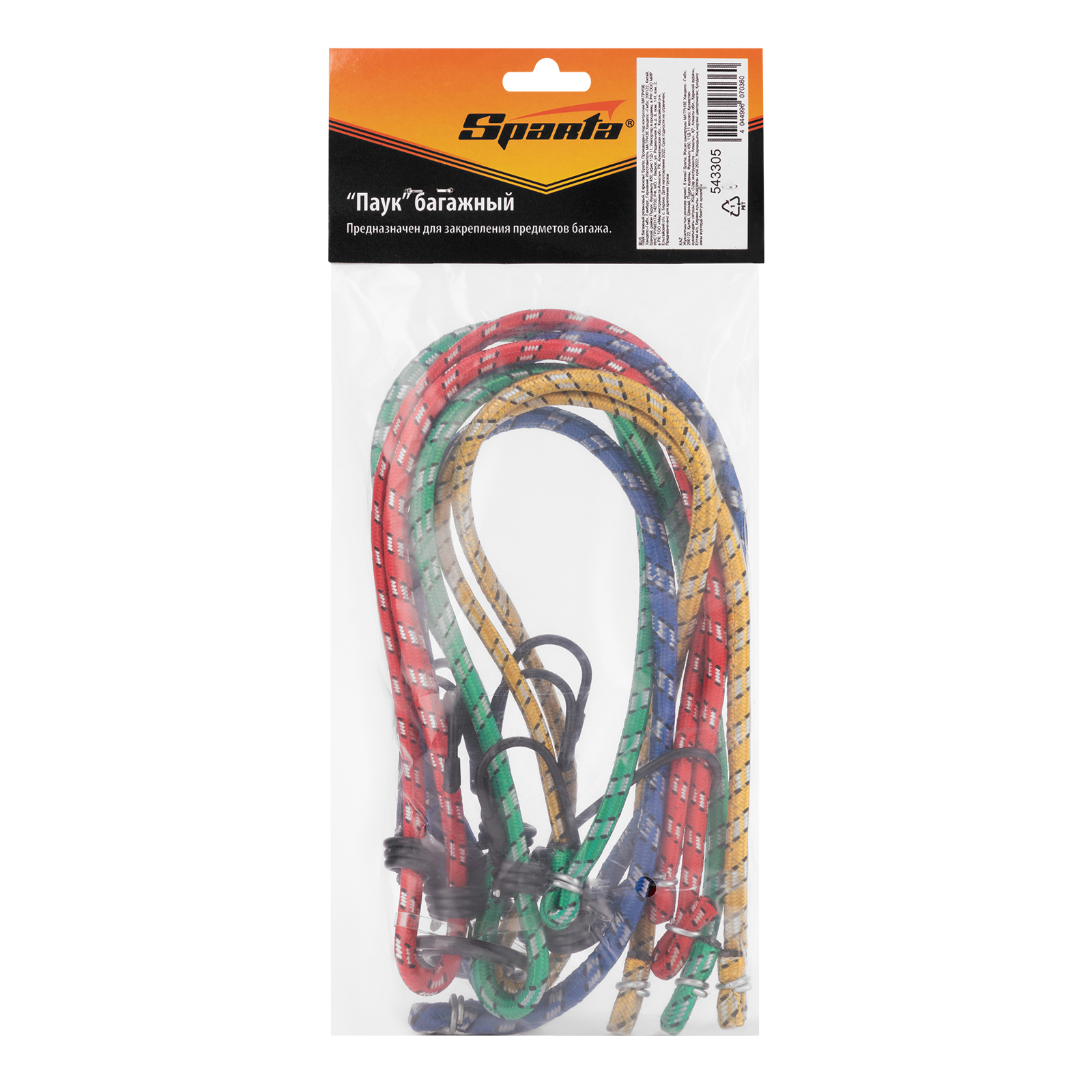Резиновый багажный паук Sparta 543305 с 8 крюками используется для фиксации предметов на решетчатых конструкциях. Предотвращает смещение груза при перевозке в открытом багажнике на крыше легковой автомашины. Имеет оригинальную конфигурацию — 4 эластичных резиновых жгута длиной 45 см с крюками на концах перехвачены посередине кольцом. Благодаря такому строению паук надежно удерживает предметы сложной формы. Крепежное приспособление будет полезно в поездках на автомобиле.