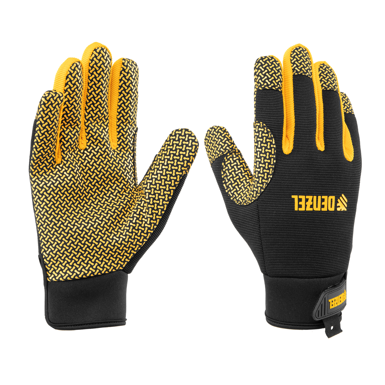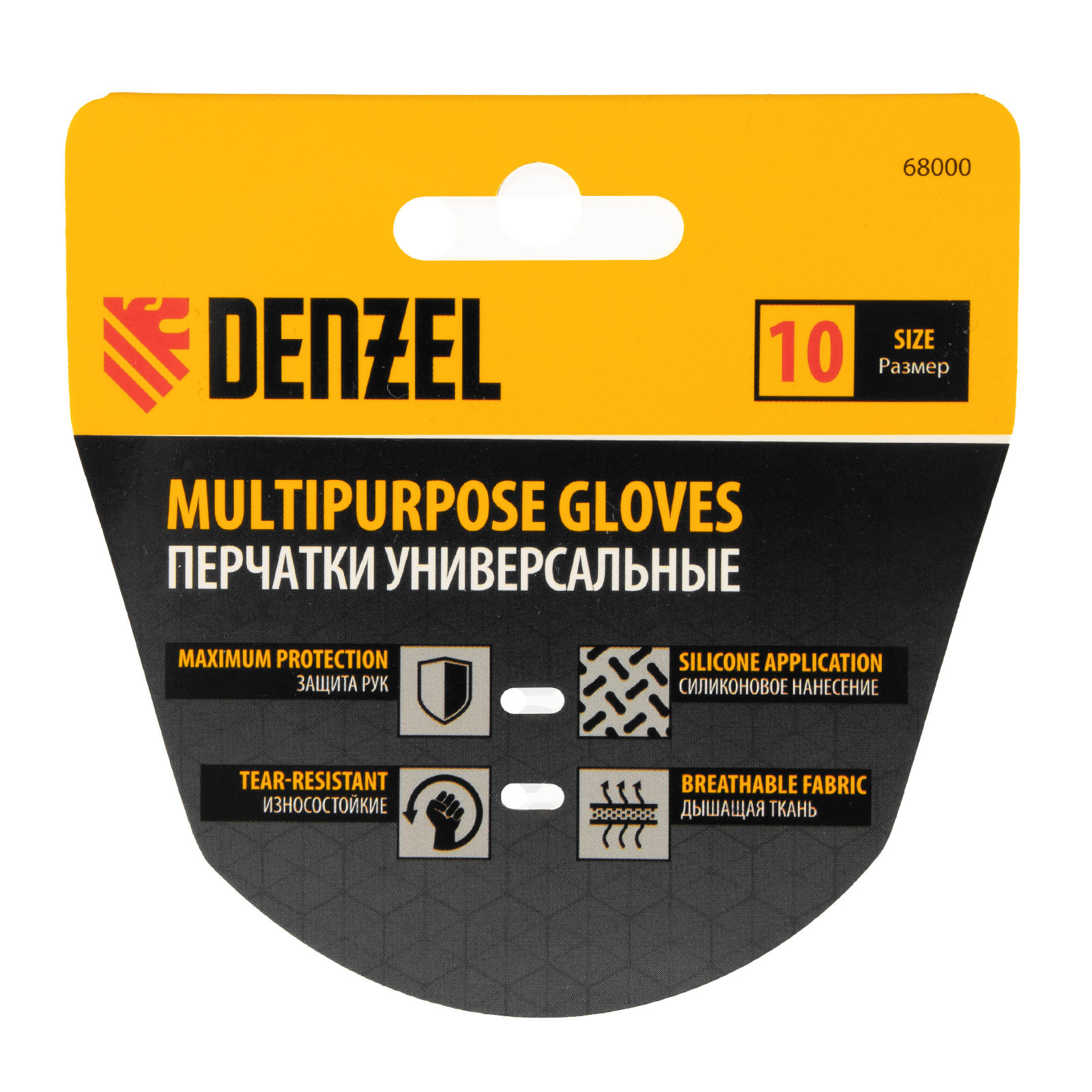 <p>Универсальные перчатки Denzel 68000 размера 10, с силиконовым нанесением, предназначены для защиты кожи рук от механических повреждений. Используются во время слесарных и столярных работ. </p><h2>Преимущества</h2><ul><li>Прочность — перчатки изготовлены из полиэстера, неопрена, полиамида и других материалов, устойчивых к разрыву и истиранию.</li><li>Антискользящие свойства — силиконовое покрытие обеспечивает надежный захват инструмента.</li><li>Манжеты на «липучке» — перчатки надежно фиксируются на запястьях и не сползают во время работы.</li></ul>