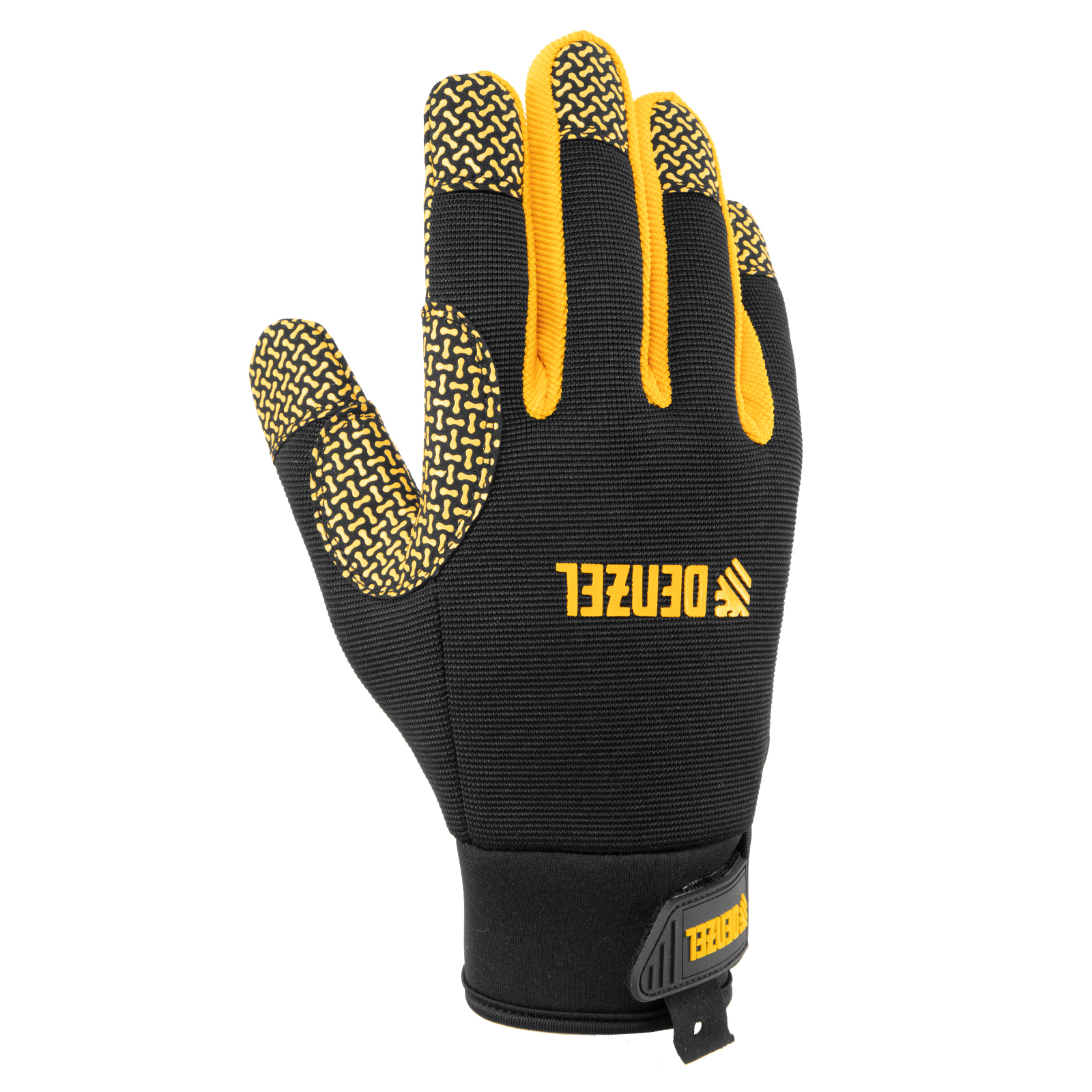 <p>Универсальные перчатки Denzel 67999 размера 9, с силиконовым нанесением, предназначены для защиты кожи рук от механических повреждений. Используются во время слесарных и столярных работ. </p><h2>Преимущества</h2><ul><li>Прочность — перчатки изготовлены из полиэстера, неопрена, полиамида и других материалов, устойчивых к разрыву и истиранию.</li><li>Антискользящие свойства — силиконовое покрытие обеспечивает надежный захват инструмента.</li><li>Манжеты на «липучке» — перчатки надежно фиксируются на запястьях и не сползают во время работы.</li></ul>