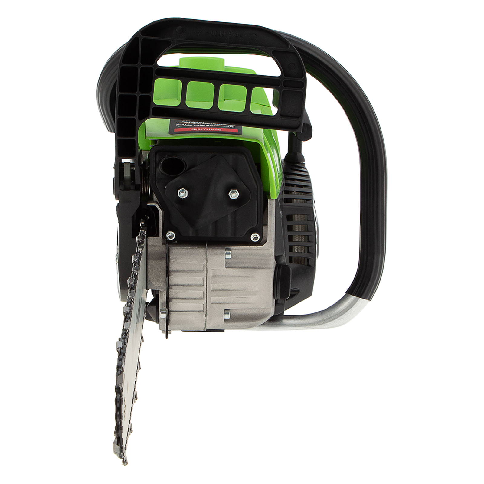 - Безопасность — пила оснащена блокировкой от случайного запуска и тормозом цепи, который моментально срабатывает при отскоке инструмента.