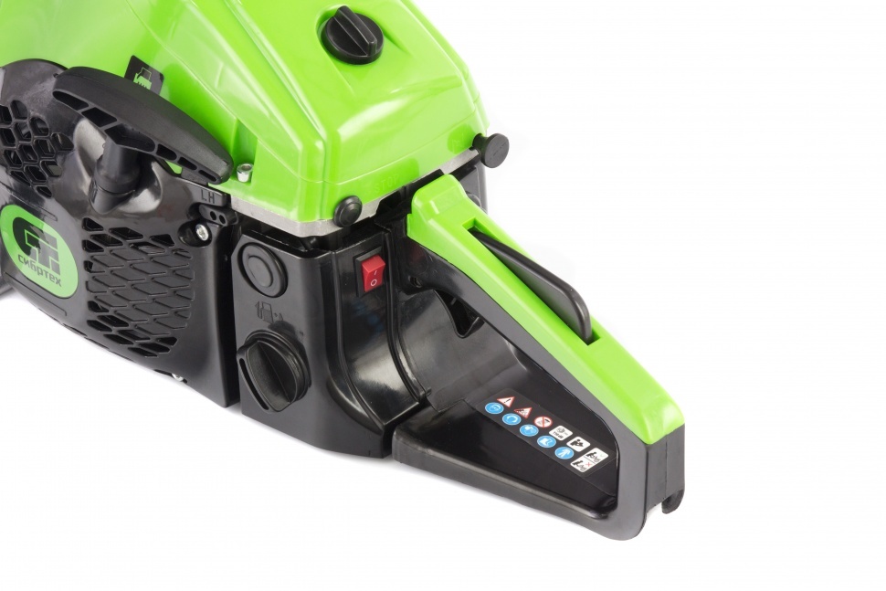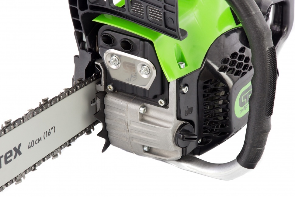 - Безопасность — пила включается только после нажатия на клавишу блокировки газа, тормоз цепи мгновенно останавливает ее вращение при отскоке пилы.