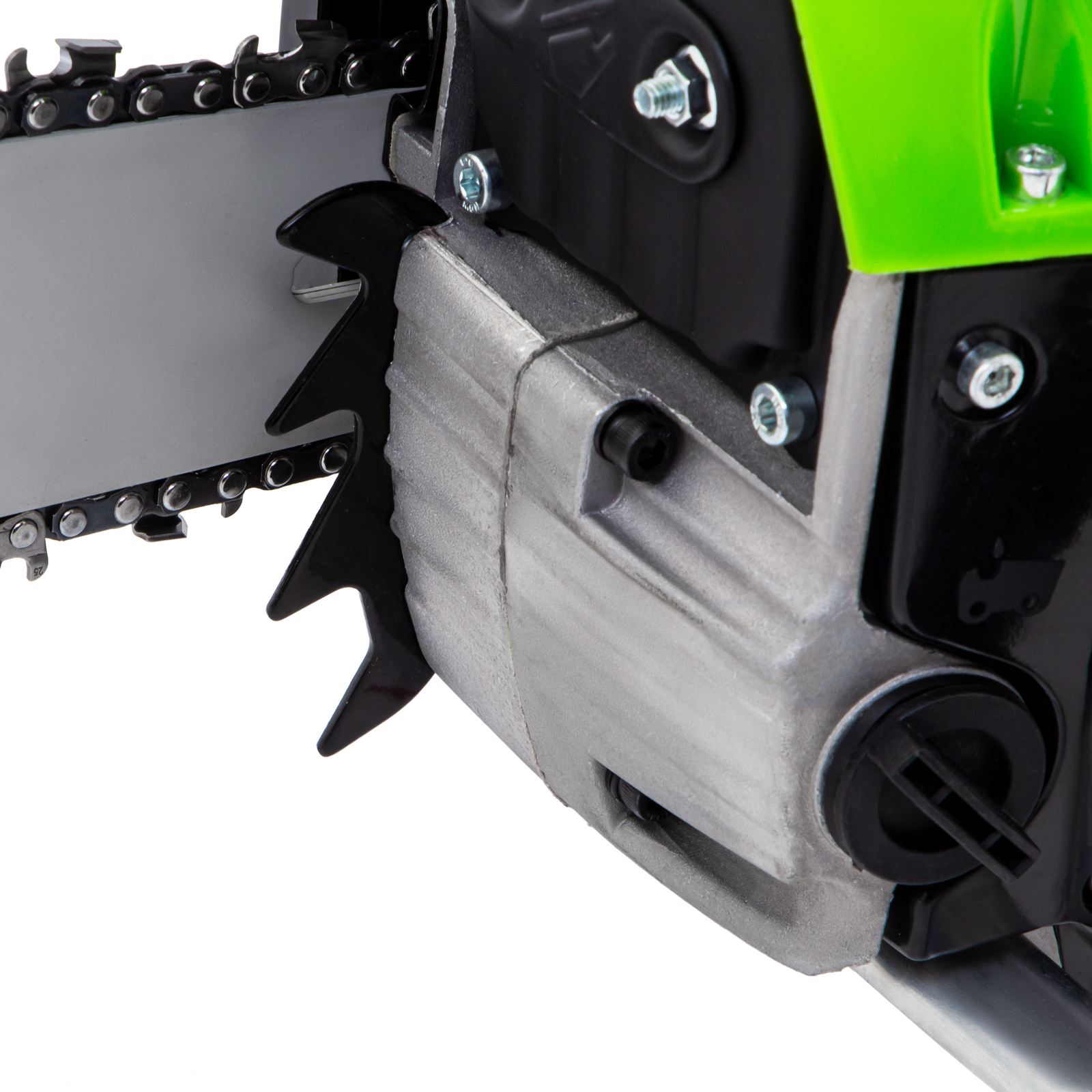 - Эффективная работа — стальной зубчатый упор помогает добиться точного надпила перед валкой дерева и уменьшает отдачу от пилы, поэтому мастеру будет легче удерживать ее.