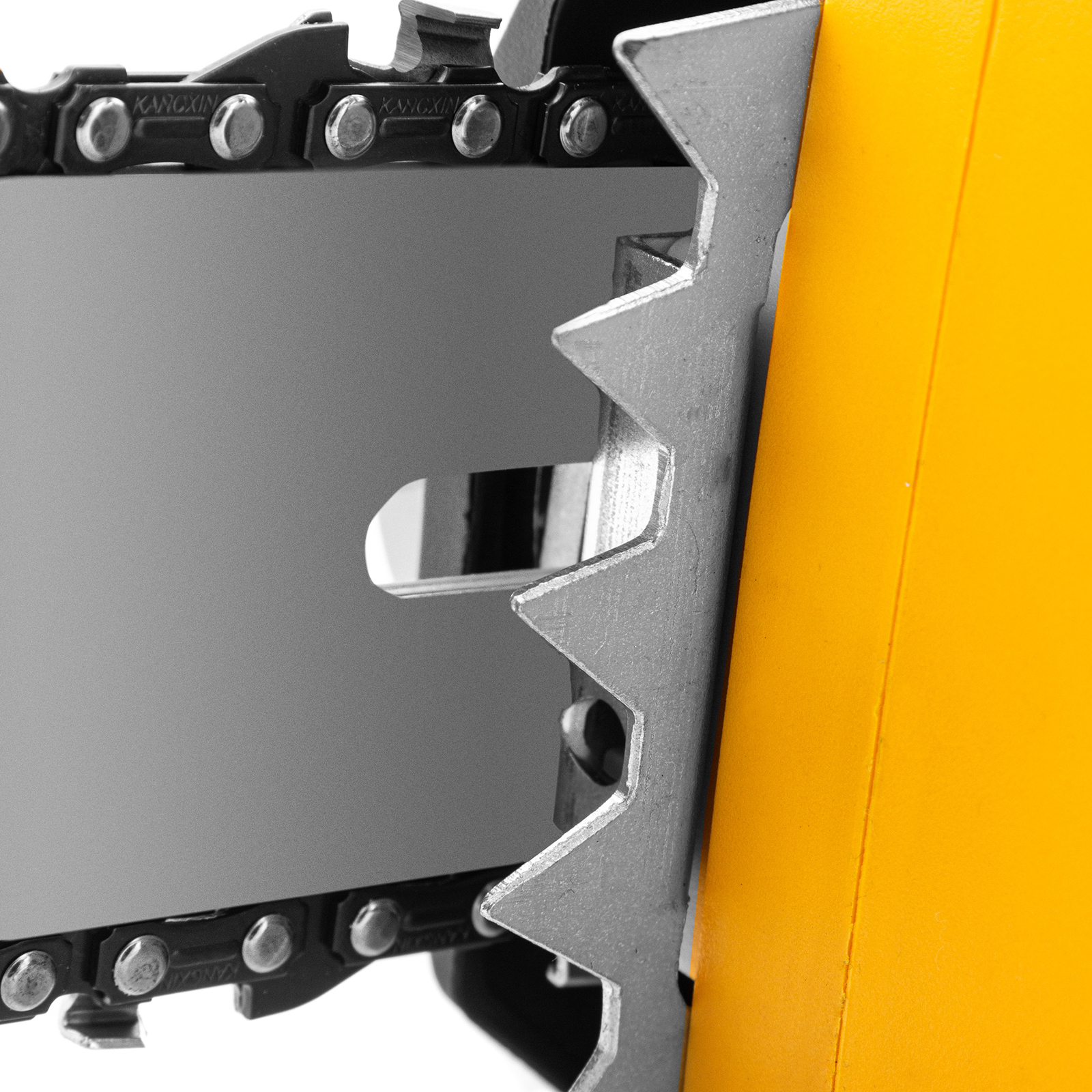 - Безопасная эксплуатация — блокировка пуска предотвращает случайное включение пилы, инерционный тормоз цепи мгновенно останавливает ее вращение при резком отскоке инструмента в сторону пользователя.