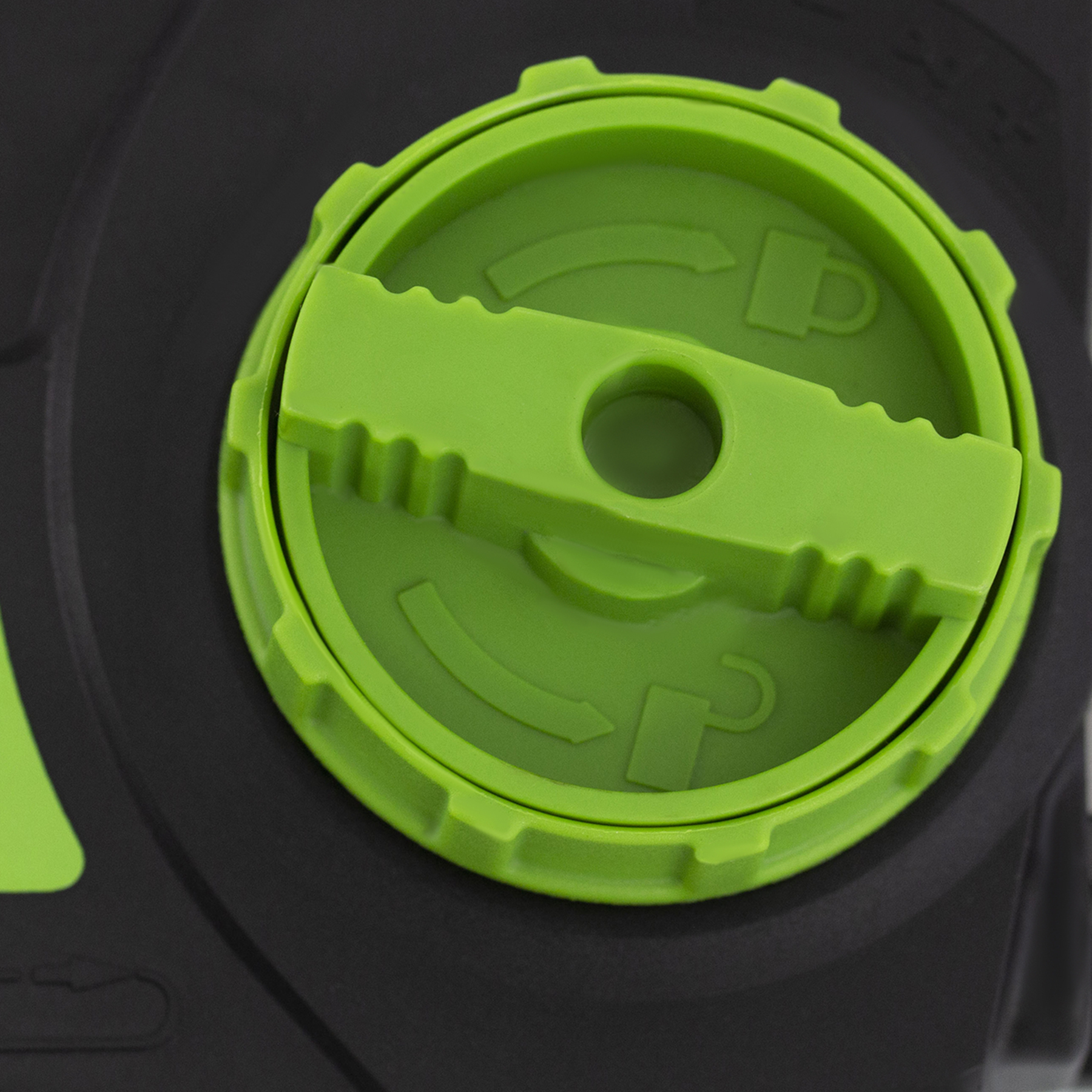 - Визуальный контроль — полупрозрачный масляный бак со смотровым окошком помогает отслеживать уровень масла и вовремя доливать его, обеспечивая сохранность ходовых деталей.