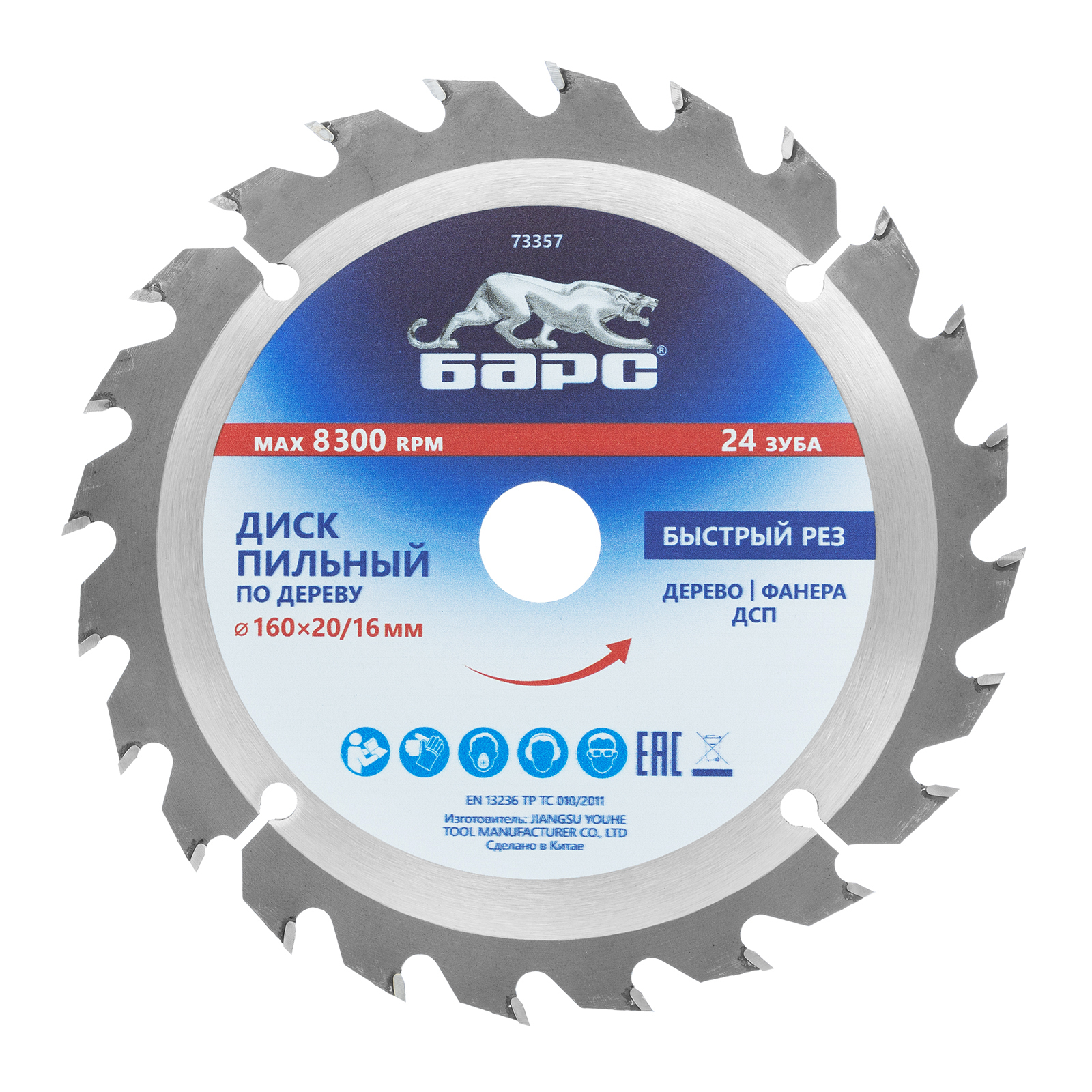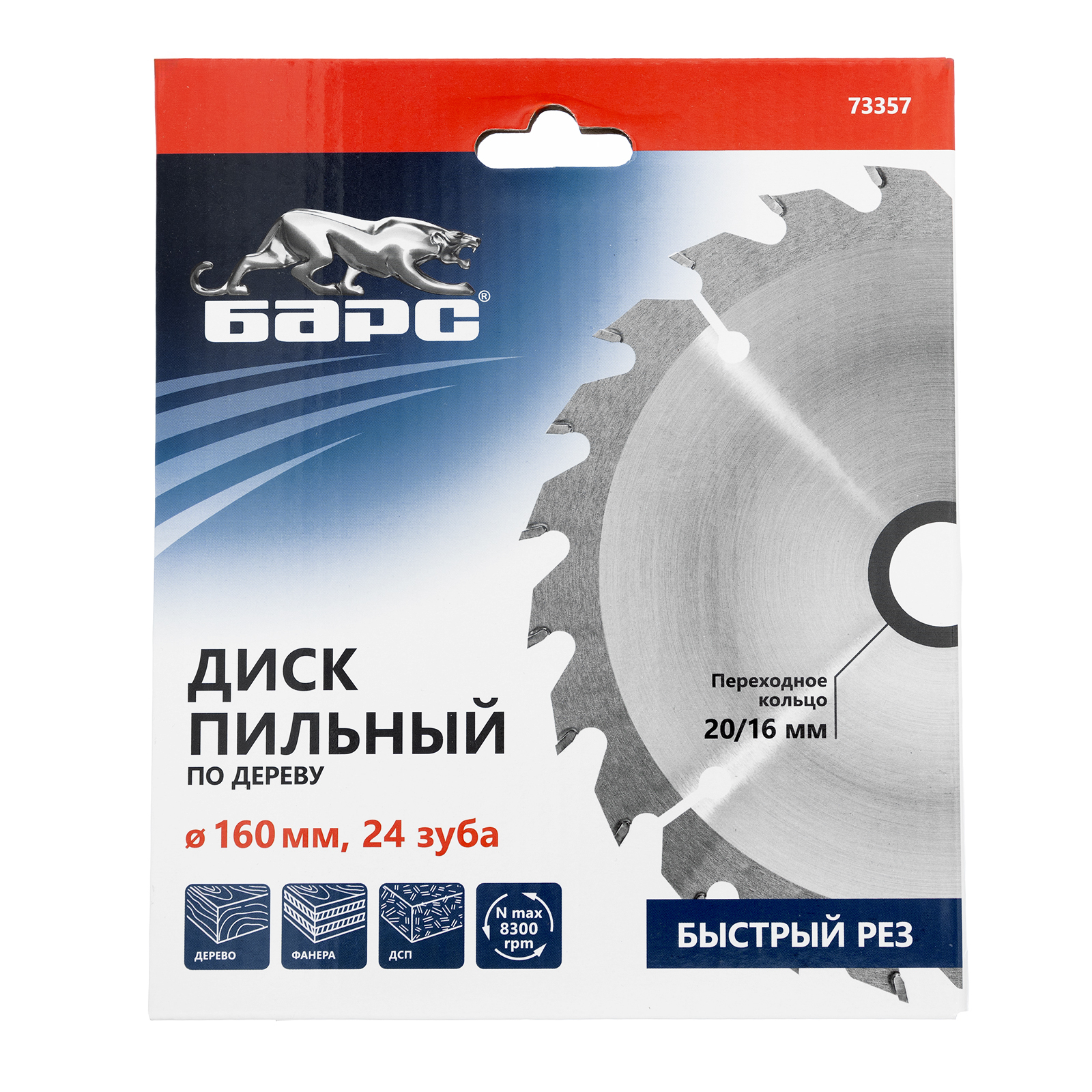 Пильный диск по дереву 160 x 20/16 мм, 24 твердосплавных зуба Барс