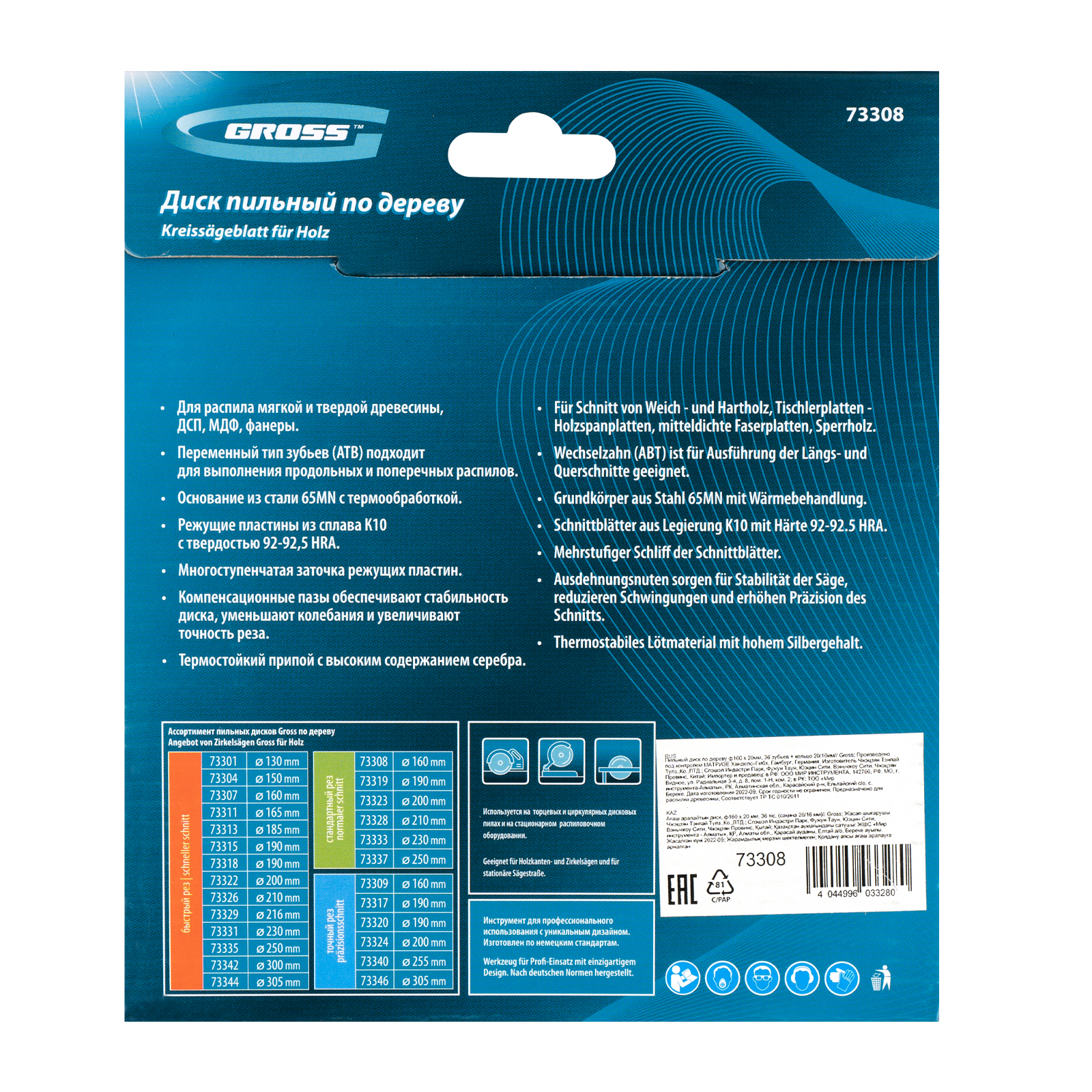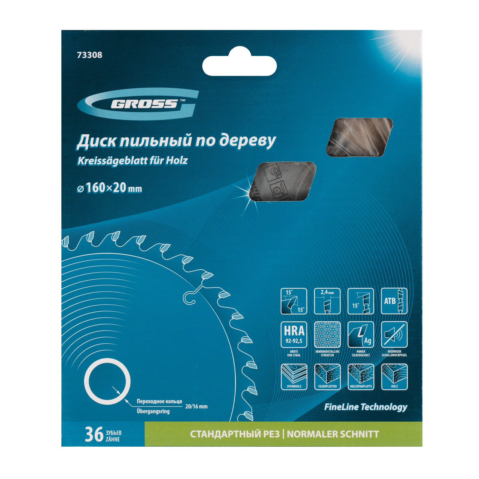 Пильный диск Gross 73308, ф160 х 20 мм, с 36 зубьями и переходным кольцом 20/16 мм, предназначен для распила древесины мягких и твердых пород, ДСП, МДФ и фанеры. Является оснасткой для циркулярных и торцовочных пил с посадочным диаметром 20 мм, благодаря универсальному типу зубьев АТВ подходит как для продольного, так и для поперечного реза материалов. Диск изготовлен на высококачественном оборудовании, специально рассчитан на профессиональное применение и выполнение большого объема работ.