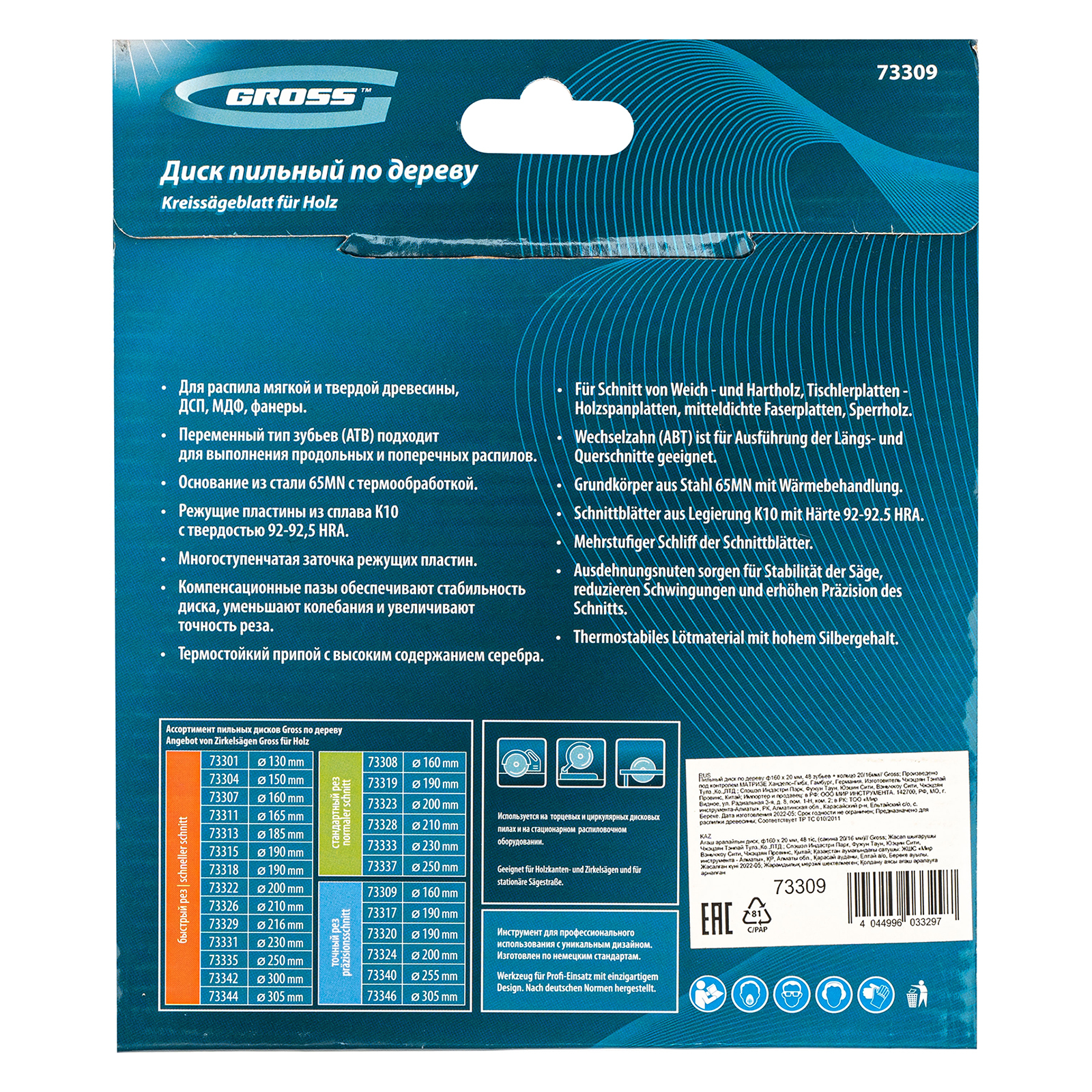 Пильный диск Gross 73309, ф160 х 20 мм, с 48 зубьями и переходным кольцом 20/16 мм, предназначен для распила древесины мягких и твердых пород, ДСП, МДФ и фанеры. Является оснасткой для циркулярных и торцовочных пил с посадочным диаметром 20 мм, благодаря универсальному типу зубьев АТВ подходит как для продольного, так и для поперечного реза материалов. Диск изготовлен на высококачественном оборудовании, специально рассчитан на профессиональное применение и выполнение большого объема работ.