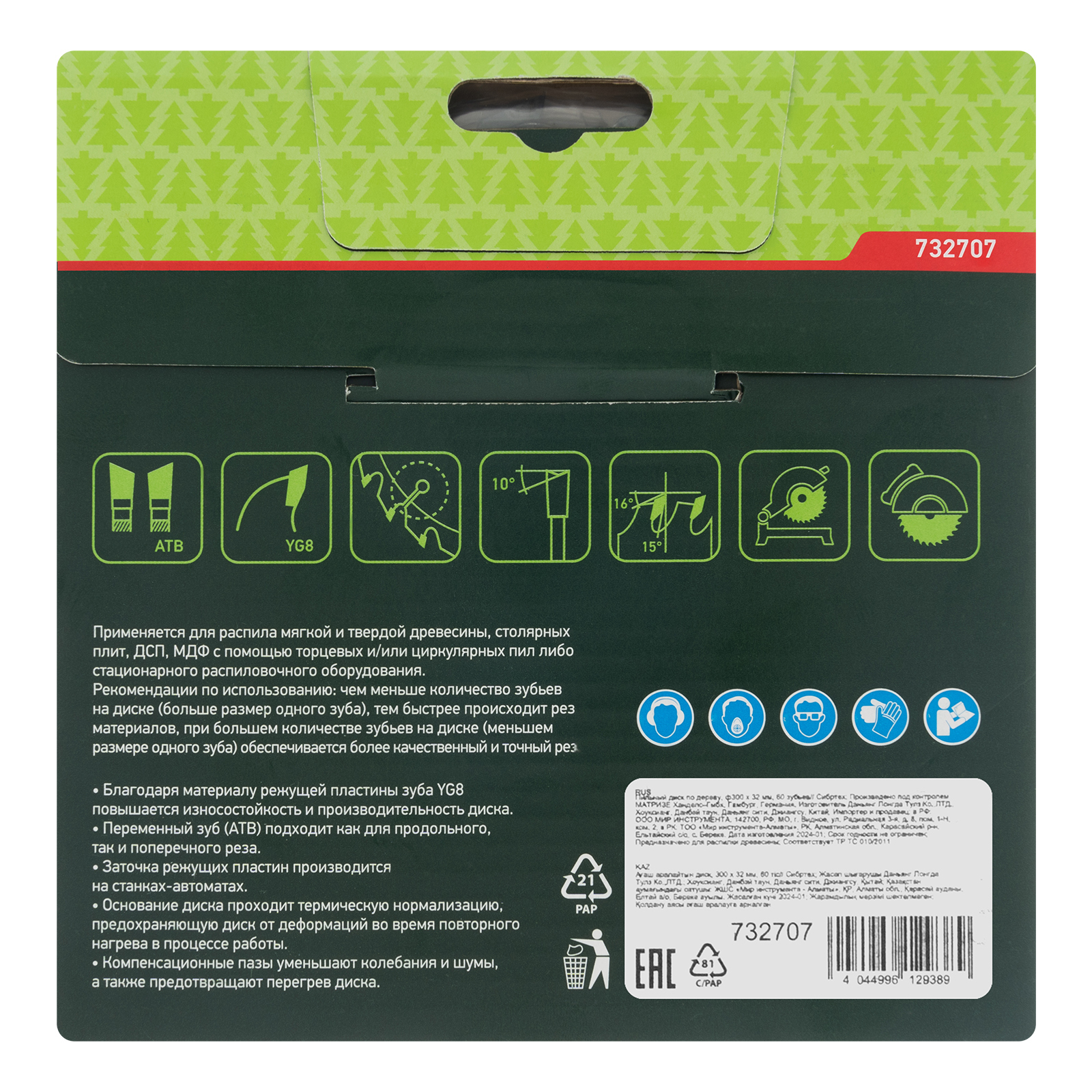 Пильный диск Сибртех 732707 диаметром 300 х 32 мм, с 60 зубьями, используется с торцовочными и циркулярными пилами, а также с распиловочными станками. Предназначен преимущественно для поперечного пиления древесины мягких и твердых пород, фанеры, МДФ и ДСП. Благодаря мелким зубьям достигается оптимальное соотношение скорости и качества реза. Диск применяется для выполнения строительных, ремонтных работ, а также для решения бытовых задач.