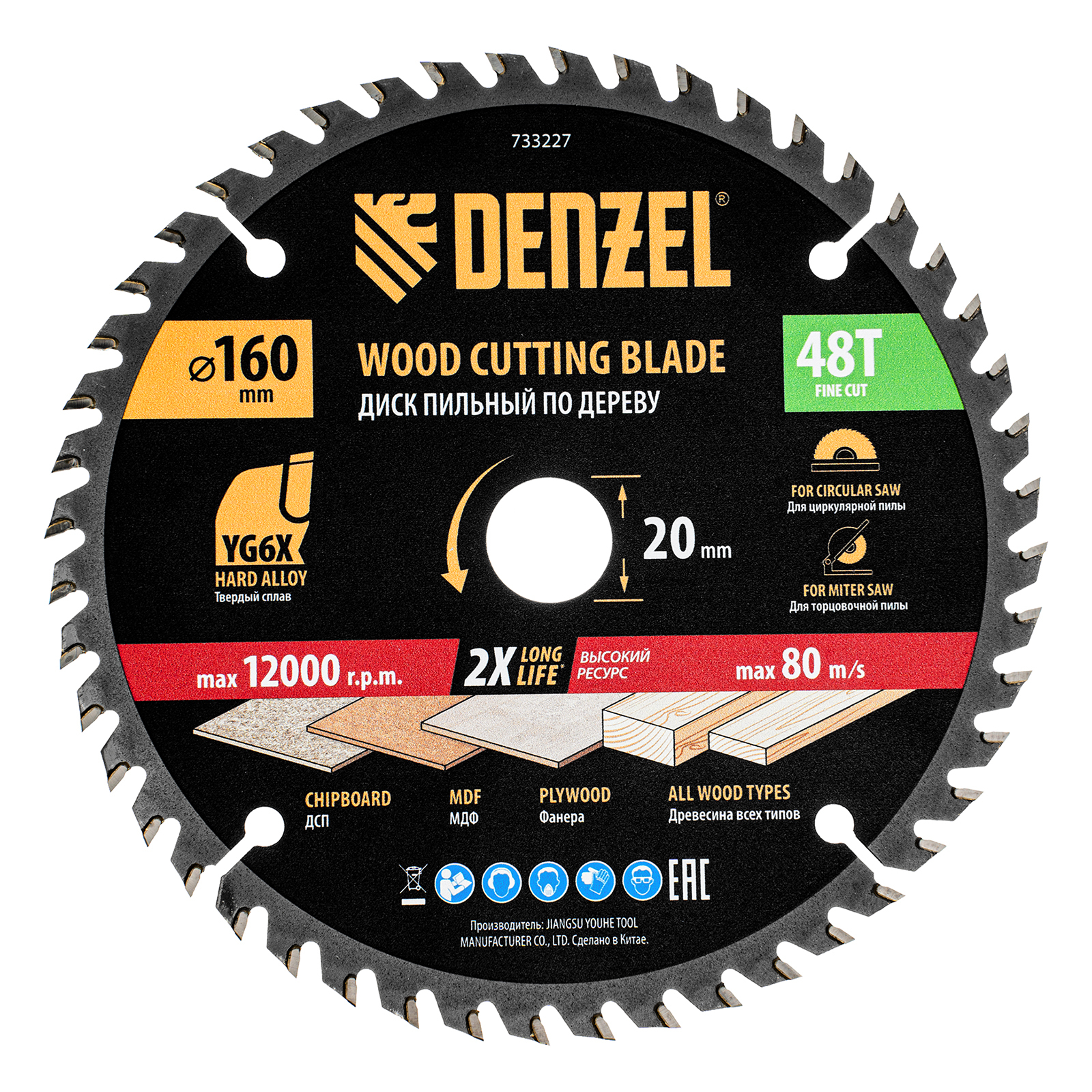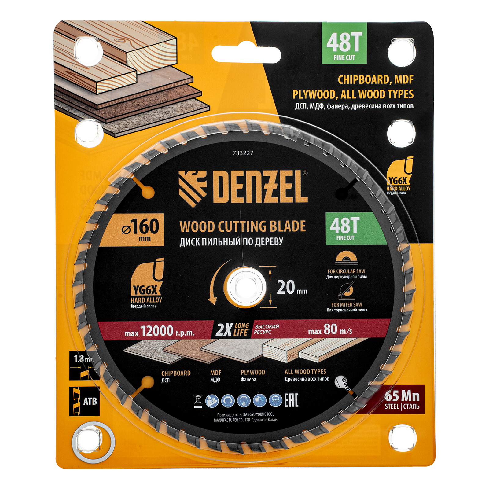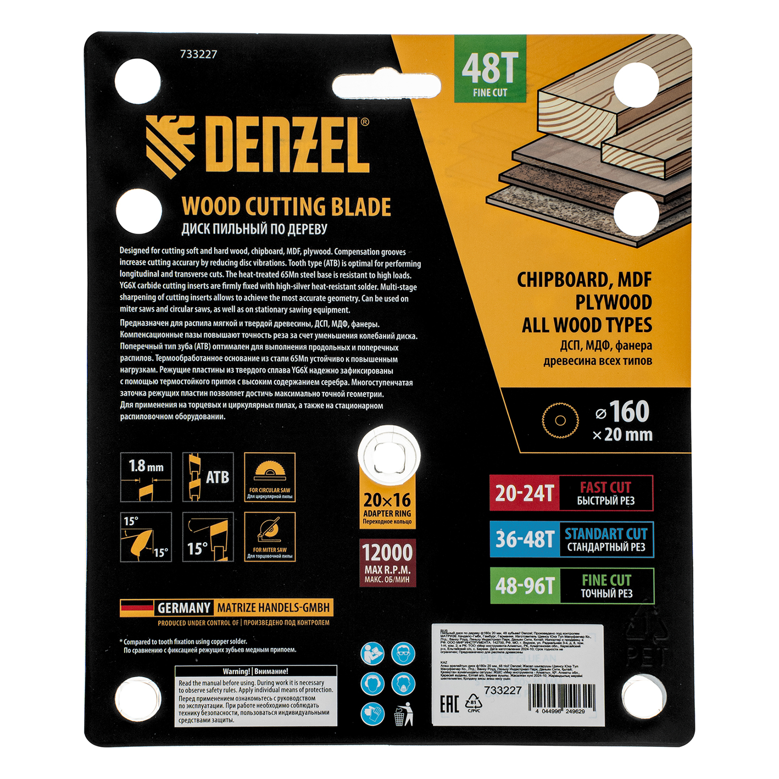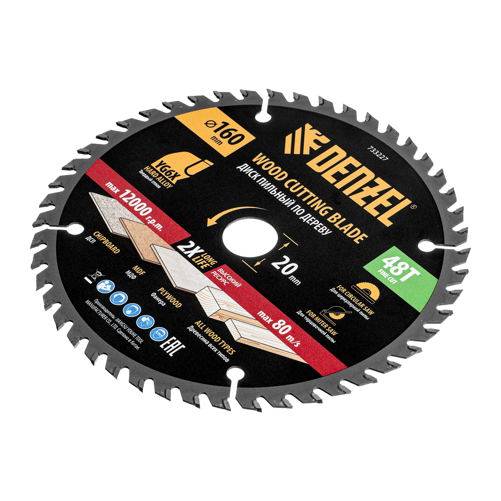 Пильный диск Denzel 733227 диаметром 160 x 20 мм, с 48 зубьями, предназначен для продольного и поперечного распила твердой и мягкой древесины, фанеры, МДФ, ДСП. 48 зубьев типа ATB с режущими пластинами оптимальной геометрии обеспечивают качественный рез. Тип реза — стандартный. Режущие пластины из твердого сплава YG6X сохраняют рабочие свойства при интенсивном использовании. Диск устанавливается на циркулярную, торцовочную пилу или на распиловочный станок. В комплект поставки входит переходное кольцо с 20 на 16 мм, что позволяет изменить посадочный размер и расширяет возможности использования диска.