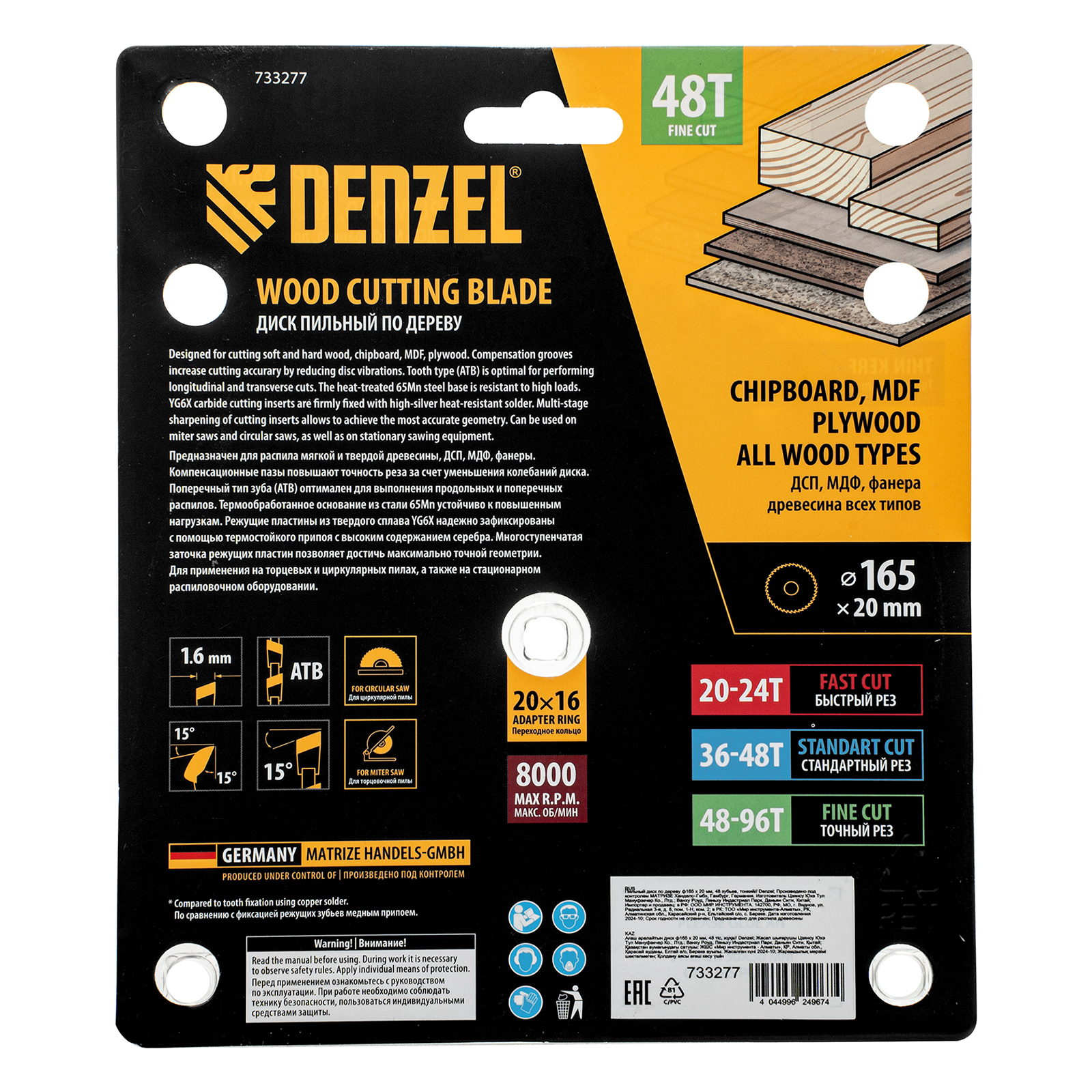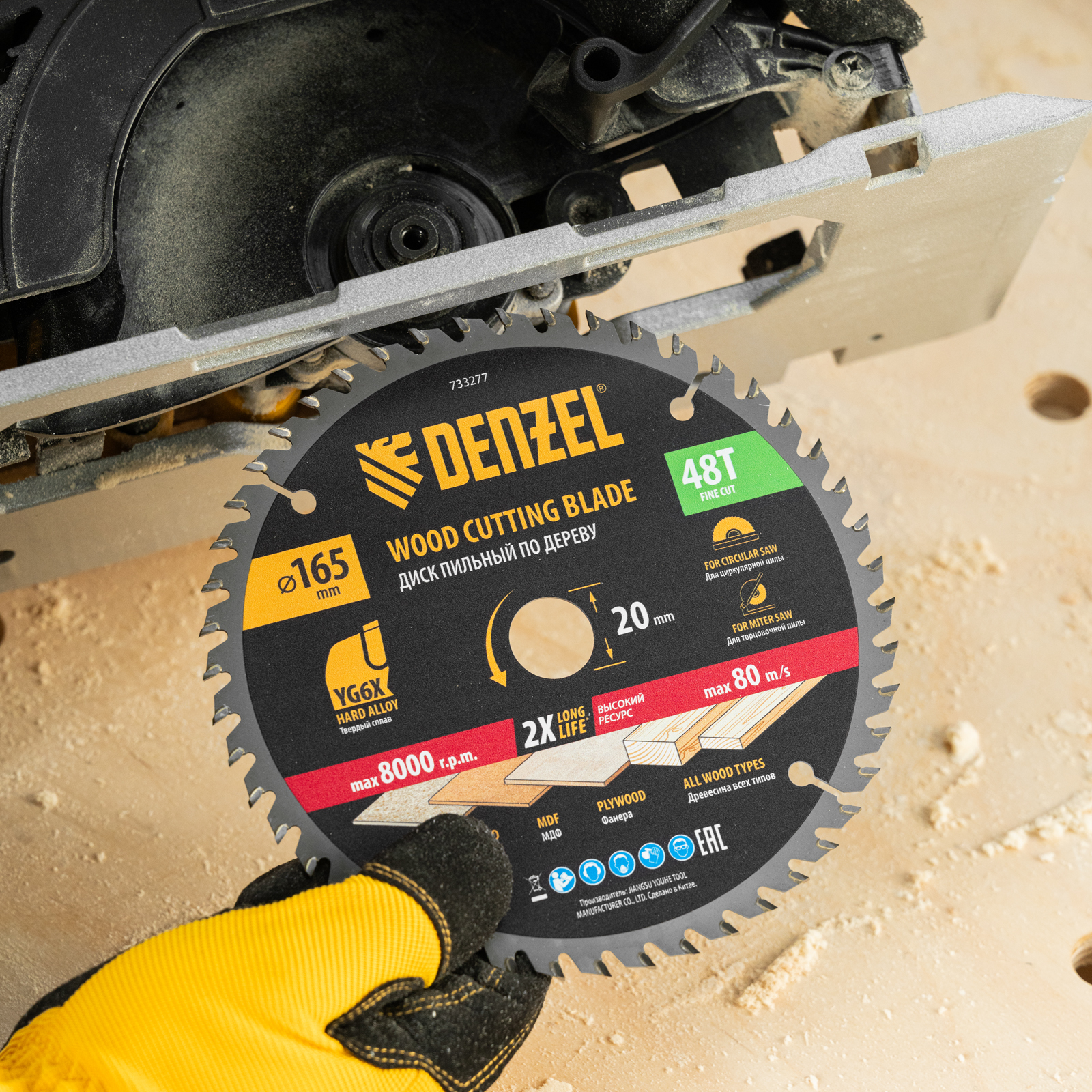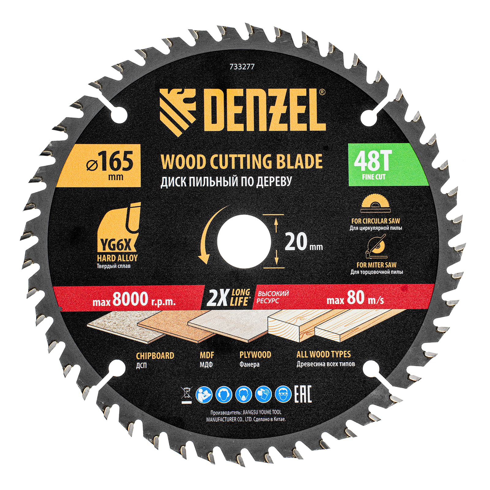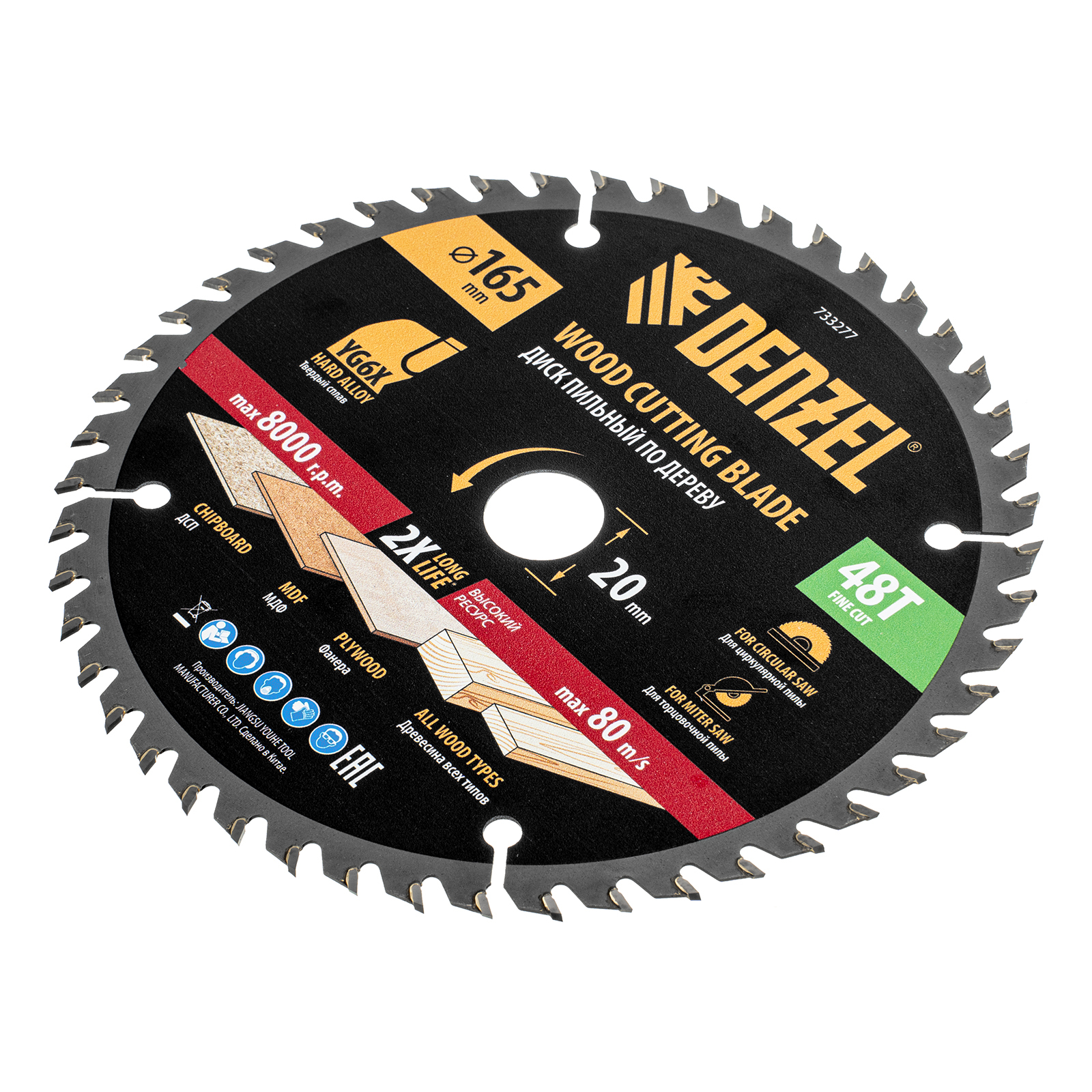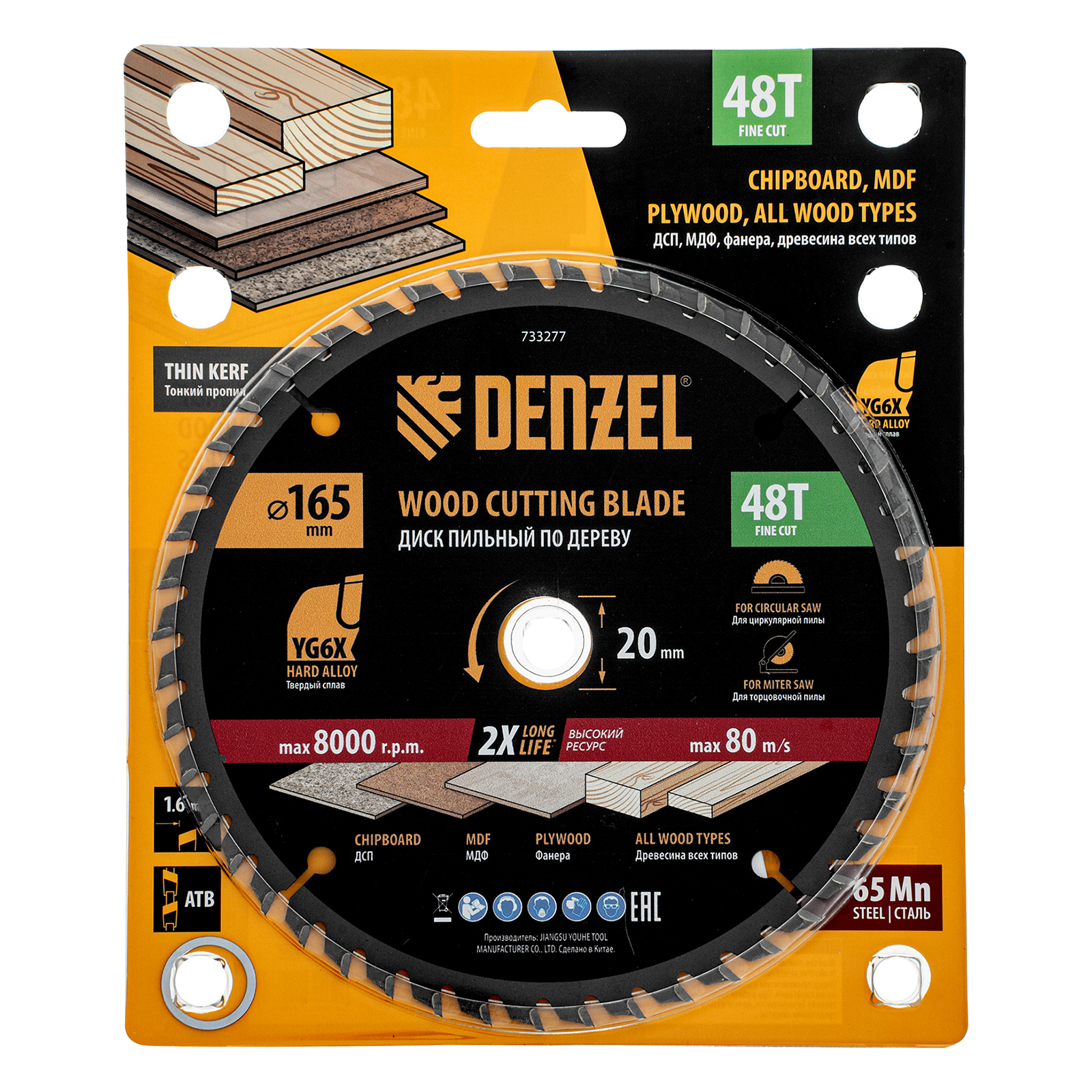 Тонкий пильный диск Denzel 733277 диаметром 165 x 20 мм, с 48 зубьями, устанавливается на циркулярную, торцовочную пилу или распиловочный станок и предназначен для выполнения работ по дереву. Подходит для распиливания древесины любого типа, а также фанеры, ДСП, МДФ. Зубья типа ATB обеспечивают высокое качество и скорость как продольного, так и поперечного распила. Тип реза — стандартный. Толщина диска уменьшена, что повышает производительность и снижает нагрузку на инструмент. На зубья напаяны твердосплавные пластины, длительное время сохраняющие режущую способность. Пластины из твердого сплава YG6X прошли многоступенчатую заточку, что позволило достичь оптимальной геометрии и максимальной эффективности распиловки.