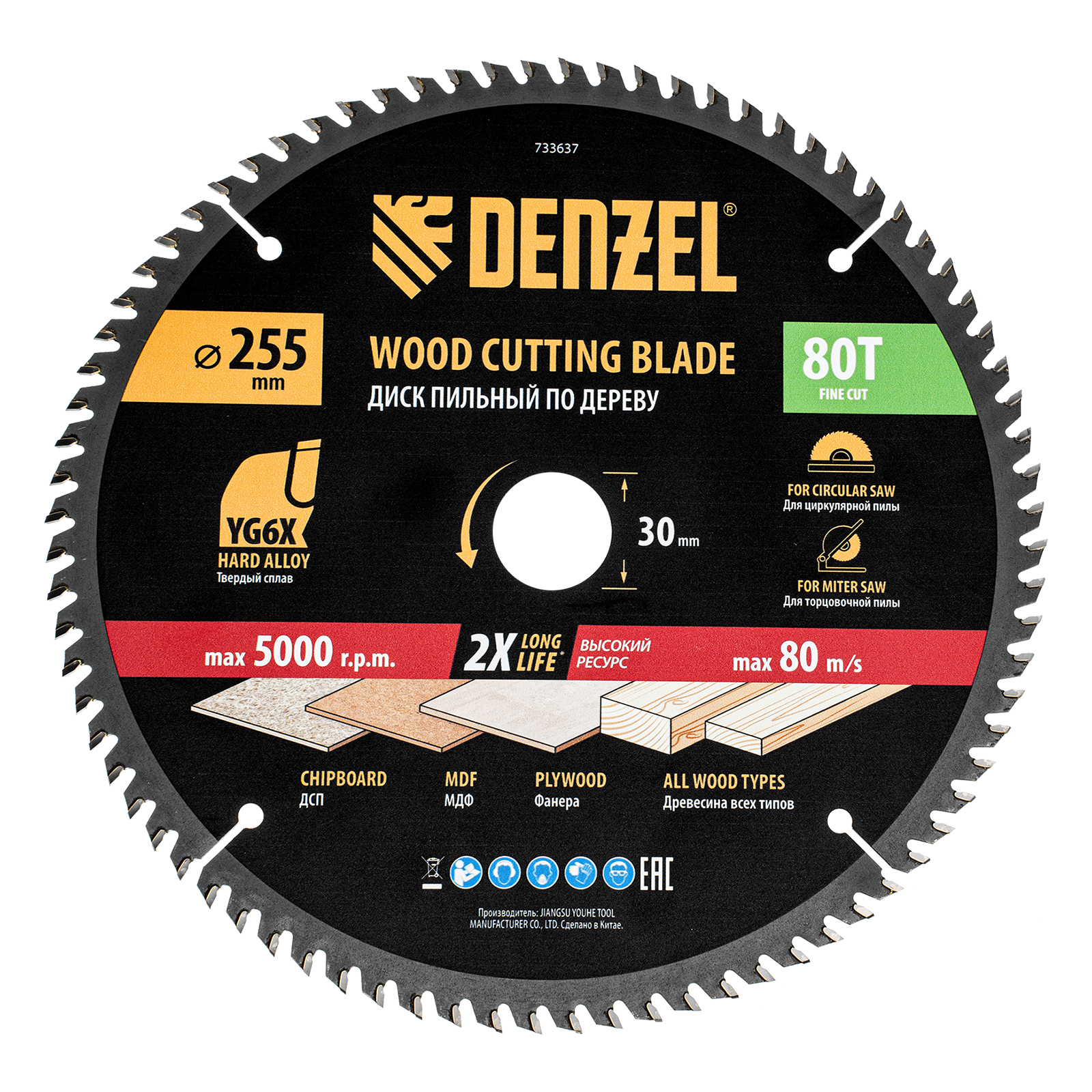 Пильный диск по дереву ф255 х 30 мм, 80 зубьев Denzel