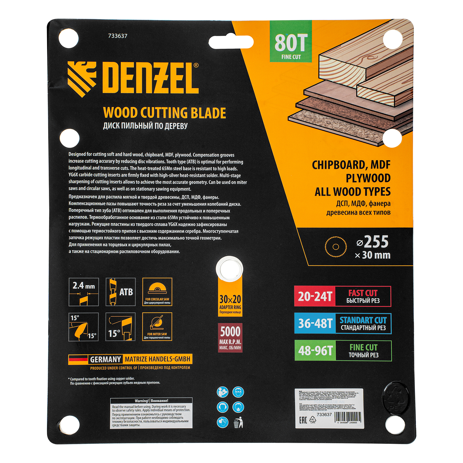 Пильный диск Denzel 733637 диаметром 255 x 30 мм, с 80 зубьями, предназначен для точного продольного и поперечного распила твердой и мягкой древесины, фанеры, МДФ, ДСП. 80 зубьев типа ATB с режущими пластинами оптимальной геометрии обеспечивают максимально чистый рез. Режущие пластины из твердого сплава YG6X сохраняют рабочие свойства при интенсивном использовании. Диск устанавливается на циркулярную, торцовочную пилу или на распиловочный станок. В комплект поставки входит переходное кольцо с 30 на 20 мм, что позволяет изменить посадочный размер и расширяет возможности использования диска.