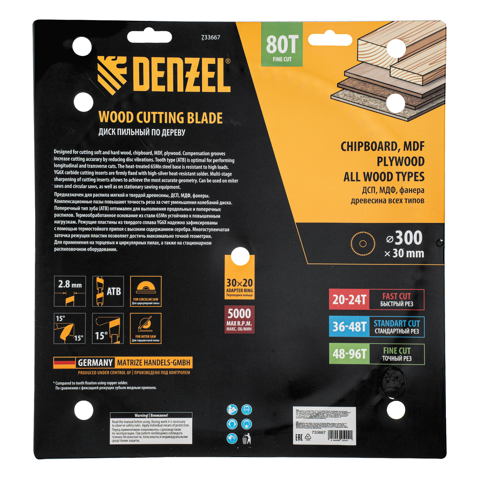 Пильный диск Denzel 733667 диаметром 300 x 30 мм, с 80 зубьями, предназначен для точного продольного и поперечного распила твердой и мягкой древесины, фанеры, МДФ, ДСП. 80 зубьев типа ATB с режущими пластинами оптимальной геометрии обеспечивают максимально чистый рез. Режущие пластины из твердого сплава YG6X сохраняют рабочие свойства при интенсивном использовании. Диск устанавливается на циркулярную, торцовочную пилу или на распиловочный станок. В комплект поставки входит переходное кольцо с 30 на 20 мм, что позволяет изменить посадочный размер и расширяет возможности использования диска.