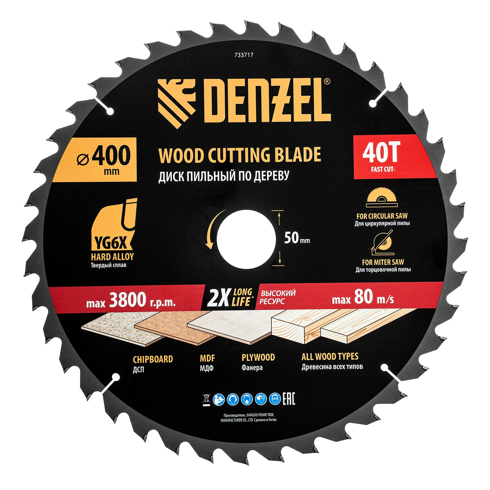 Пильный диск Denzel 733717 диаметром 400 x 50 мм, с 40 зубьями, предназначен для продольного и поперечного распила твердой и мягкой древесины, фанеры, МДФ, ДСП. 40 зубьев типа ATB с режущими пластинами оптимальной геометрии обеспечивают качественный рез. Тип реза — стандартный. Режущие пластины из твердого сплава YG6X сохраняют рабочие свойства при интенсивном использовании. Диск устанавливается на циркулярную, торцовочную пилу или на распиловочный станок. В комплект поставки входит переходное кольцо с 50 на 32 мм, что позволяет изменить посадочный размер и расширяет возможности использования диска.