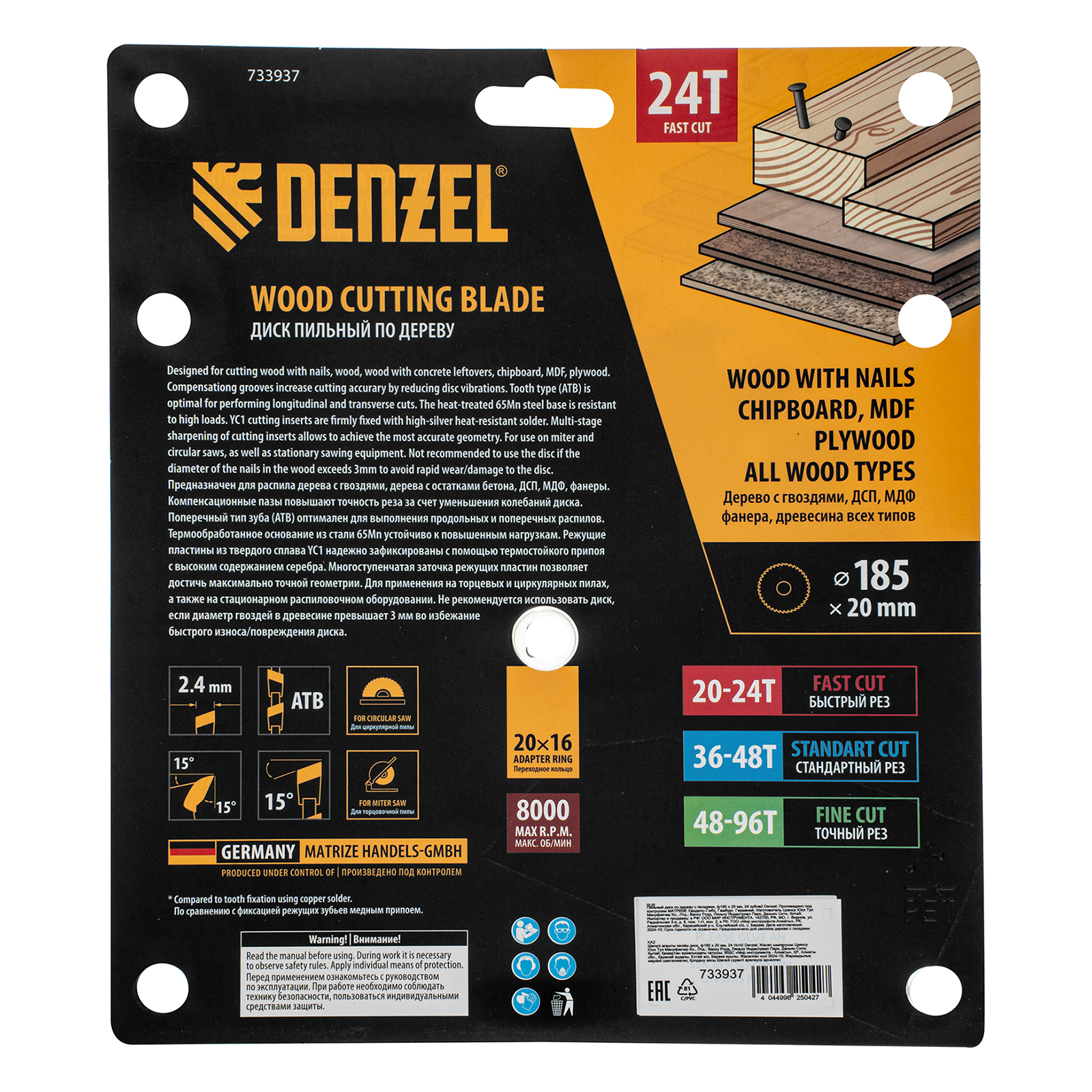Пильный диск Denzel 733937 диаметром 185 x 20 мм, с 24 зубьями типа ATB, предназначен для быстрого продольного и поперечного распиливания древесины всех типов, в том числе с гвоздями и остатками бетона, а также ДСП, МДФ, фанеры. Режущие пластины из твердого сплава YC1, прошедшие многоступенчатую заточку, позволяют успешно справляться с прочными материалами. Диск устанавливается на циркулярную, торцовочную пилу или на распиловочный станок. В комплект поставки входит переходное кольцо 20/16 мм, позволяющее изменить посадочный диаметр при необходимости.