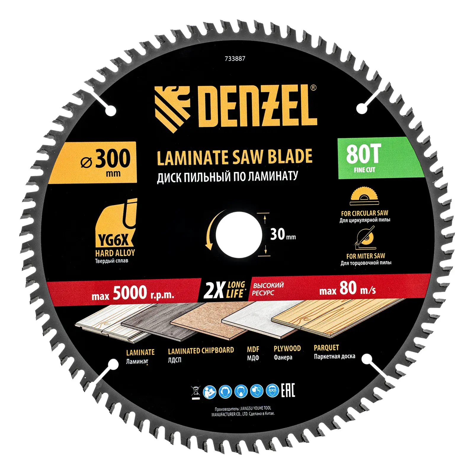 Пильный диск по ламинату ф300 х 30 мм, 80 зубьев Denzel