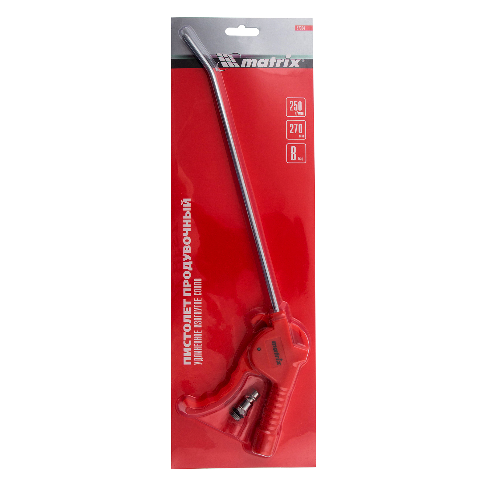 <p>Пистолет продувочный Matrix 57334 с удлиненным изогнутым соплом длиной 270 мм подходит для применения в быту, в автосервисах, в небольших мастерских и на строительных объектах. С помощью потока сжатого до 8 бар воздуха эффективно очищает отверстия, шланги, пазы деталей и поверхности с производительностью до 270 л/час. Продувочный пистолет отличается высоким уровнем пожарной безопасности, поэтому может использоваться во влажных помещениях.</p><h2>Преимущества</h2><ul><li>Надежность и малый вес инструмента 190 г — корпус из прочного пластика не утяжеляет инструмент.</li><li>Высокая эффективность — изогнутое сопло облегчает работу в труднодоступных местах, позволяя прочистить очень узкие отверстия.</li><li>Комфортная работа — удобная рукоятка имеет рельефное покрытие, а спусковой крючок повторяет форму пальцев.</li></ul>