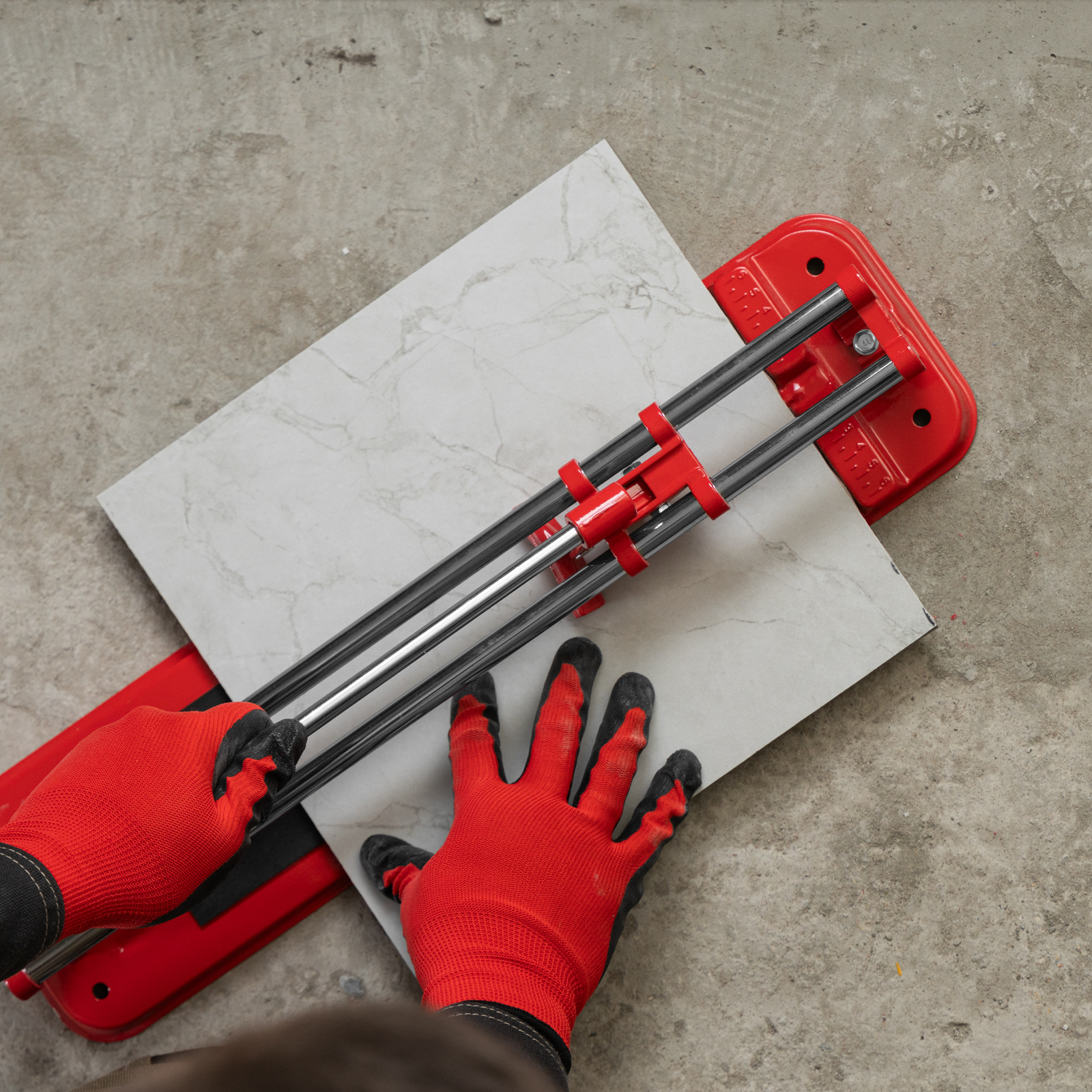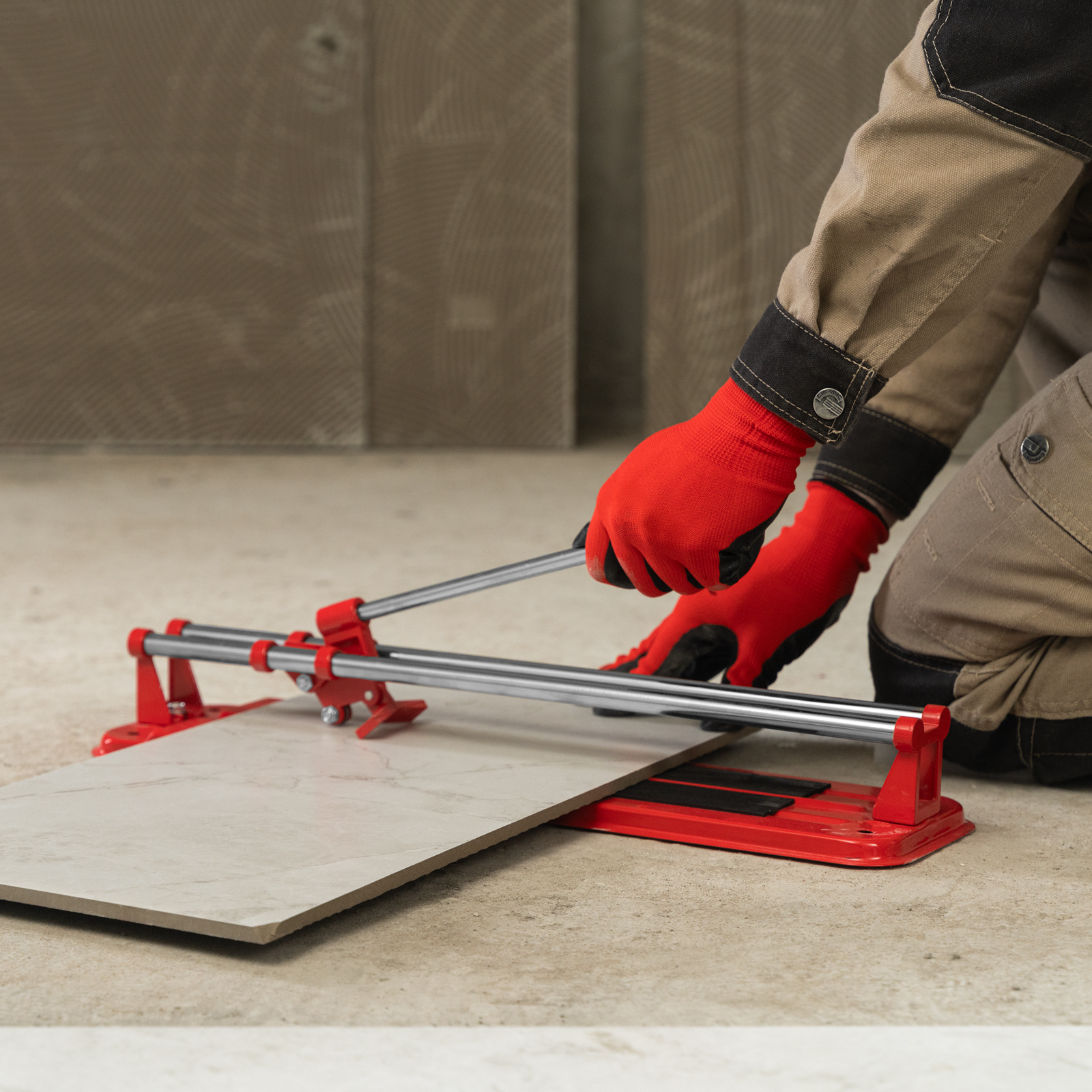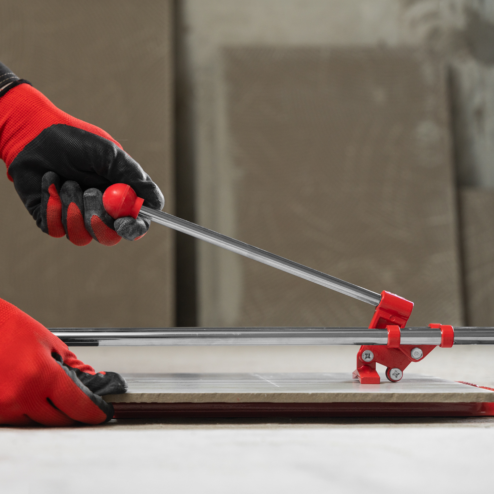 - Высокое качество работы — стальное основание обеспечивает устойчивость плиткореза, мягкие амортизирующие накладки предотвращают смещение плитки.